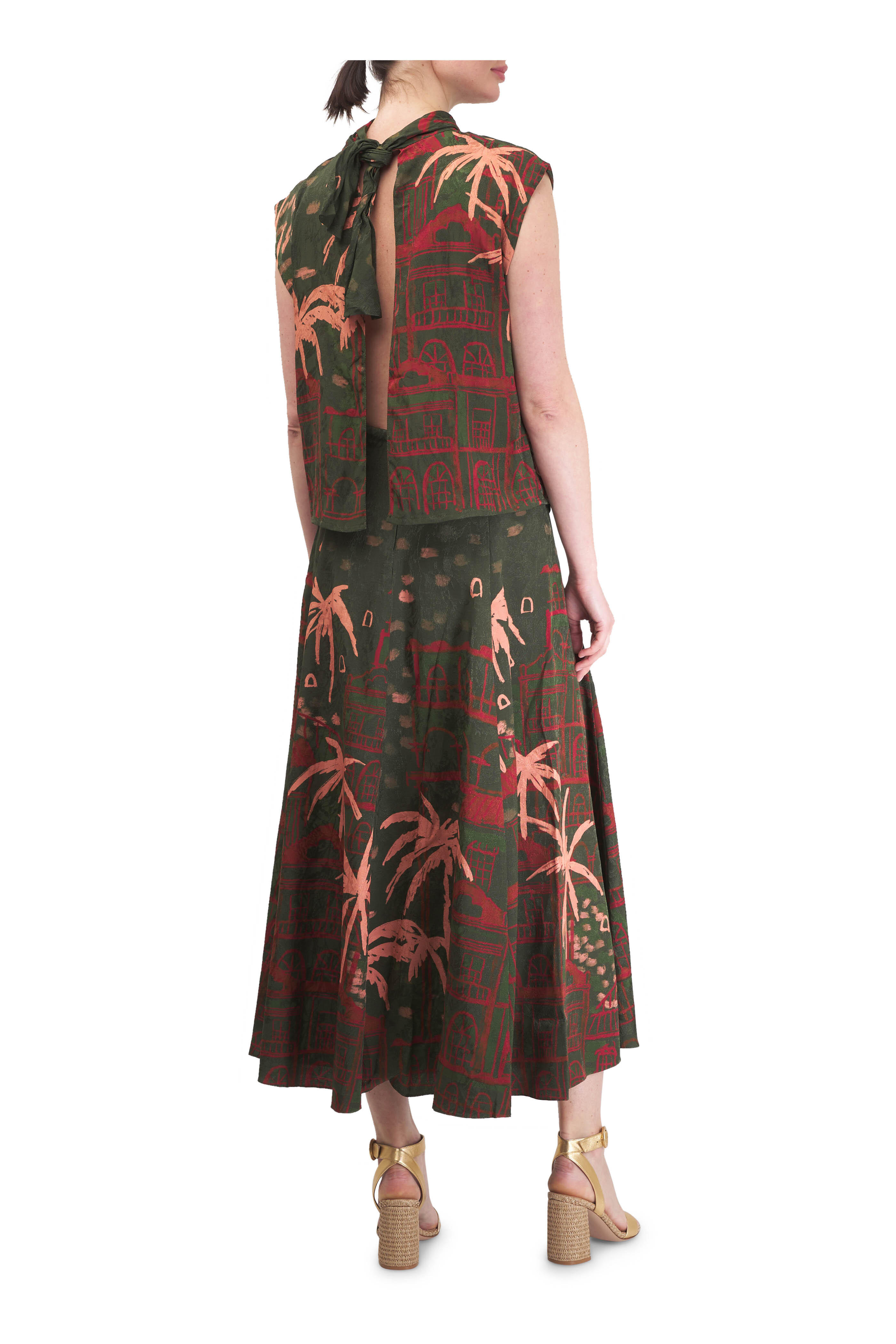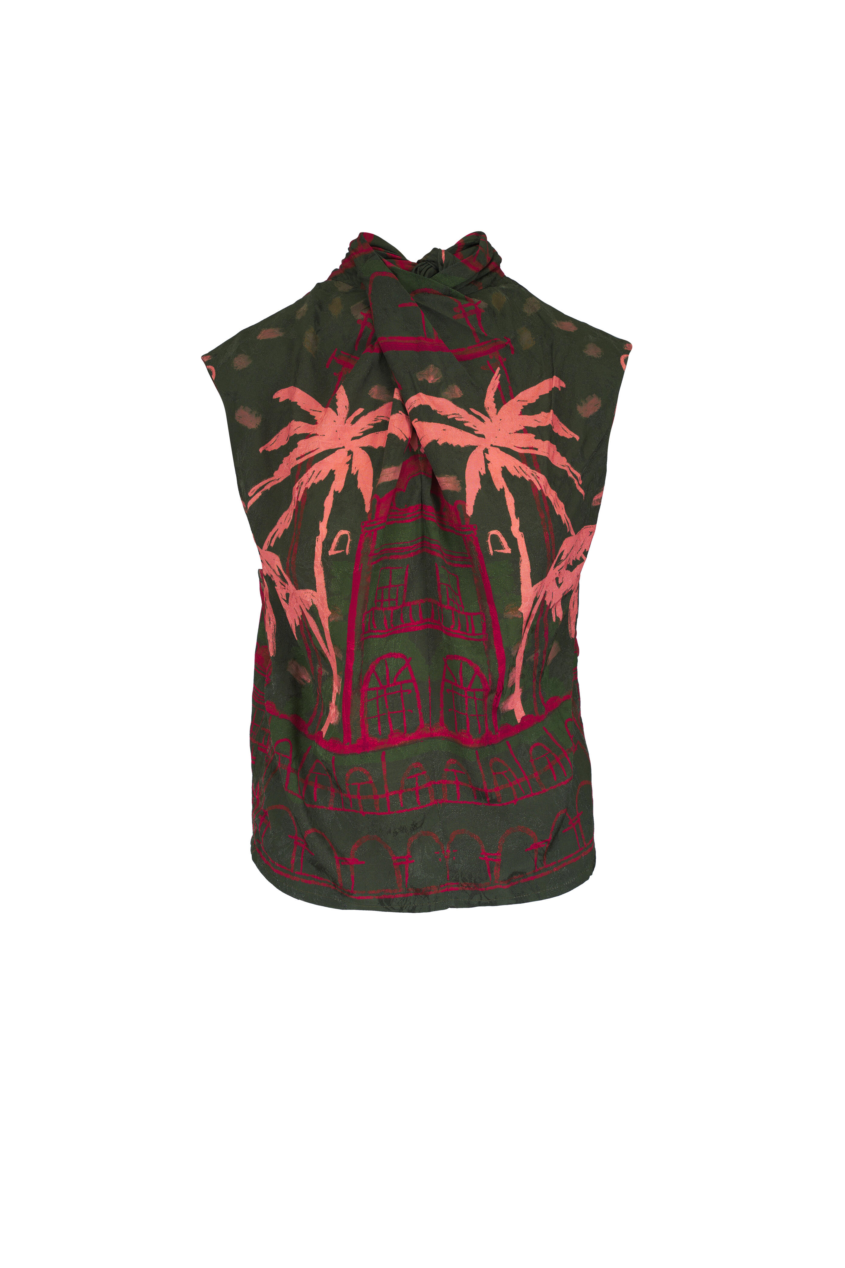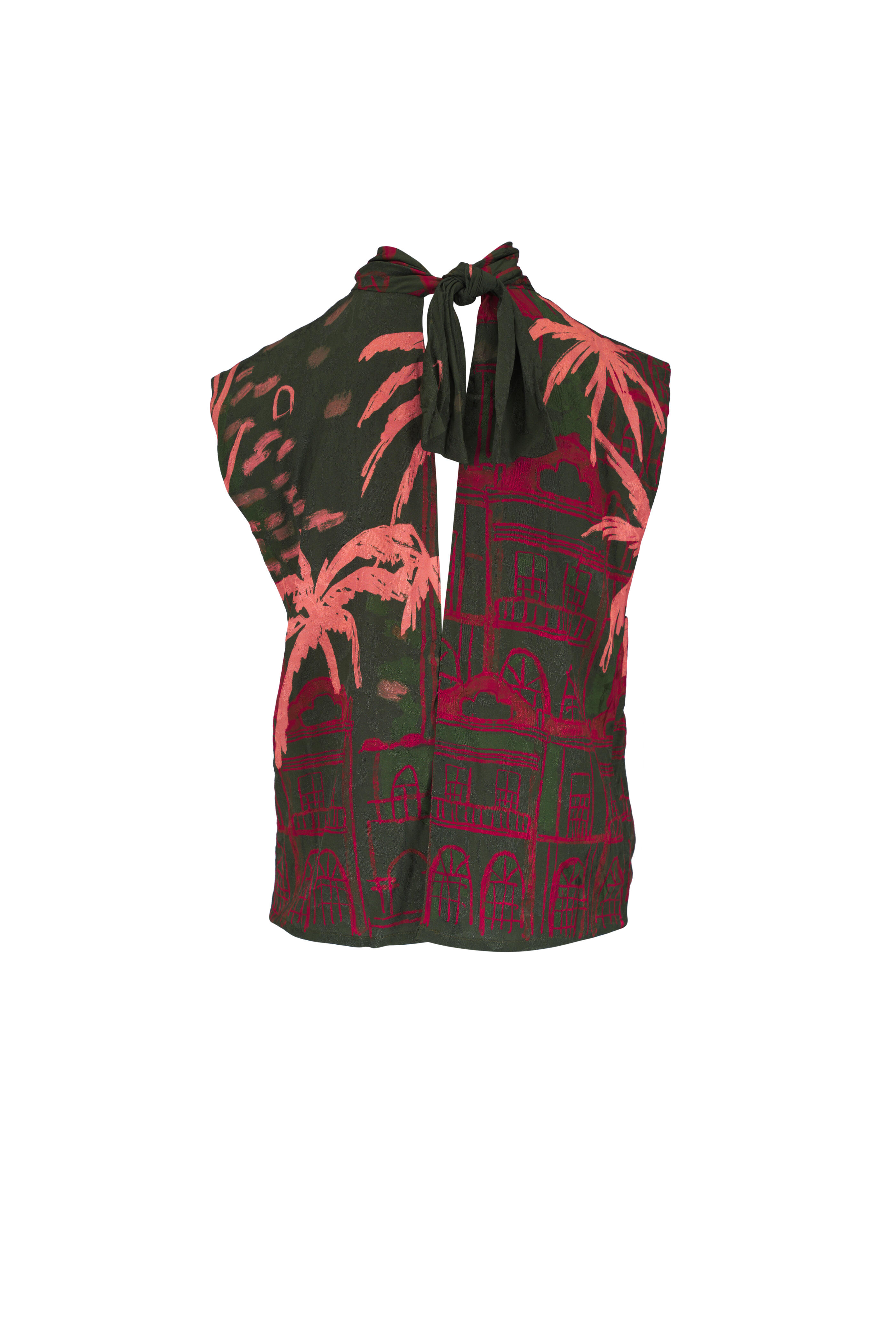 Surplice neckline; self-tie bow. Open back. Imported. Boxy fit. 100% viscose. Dry clean.