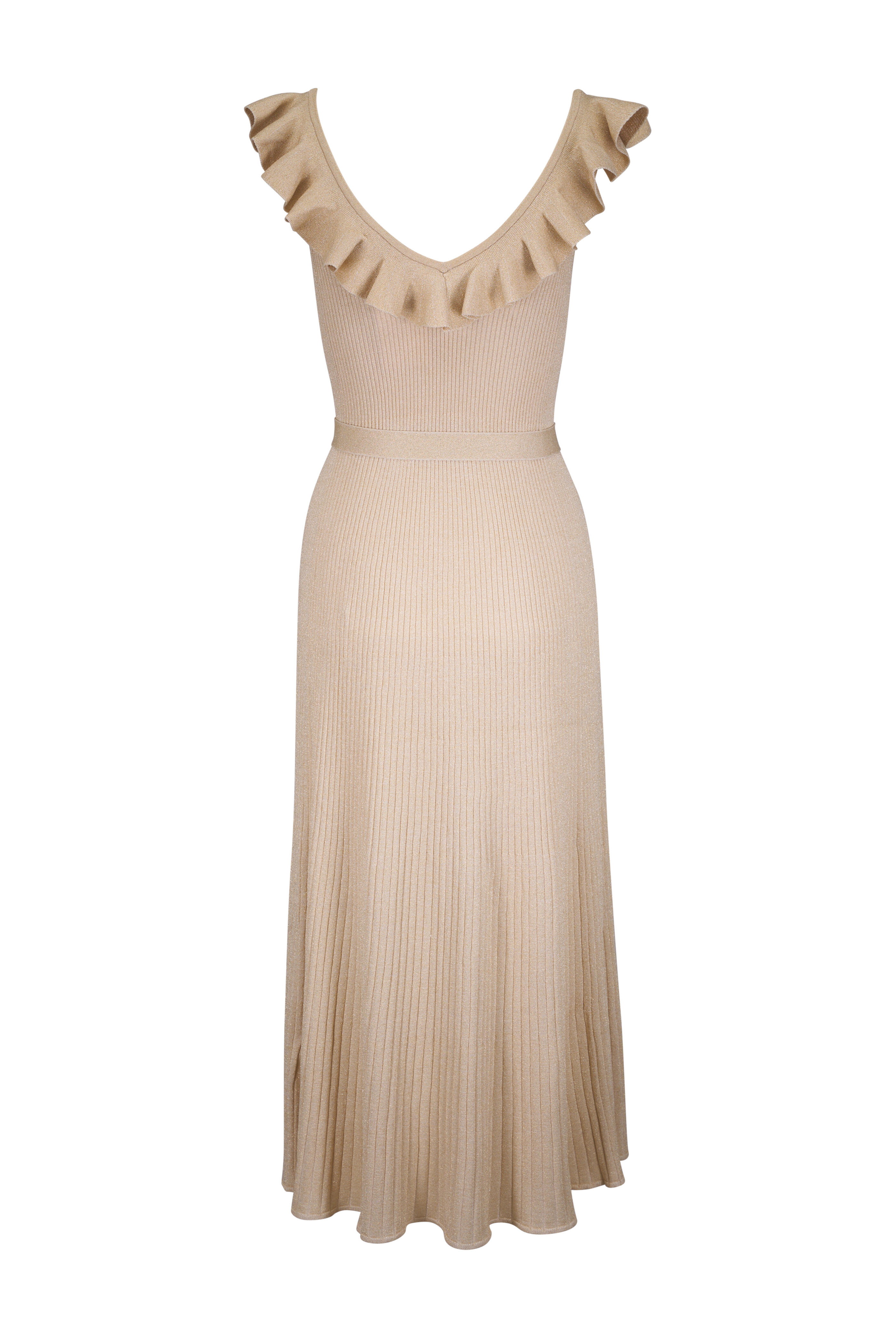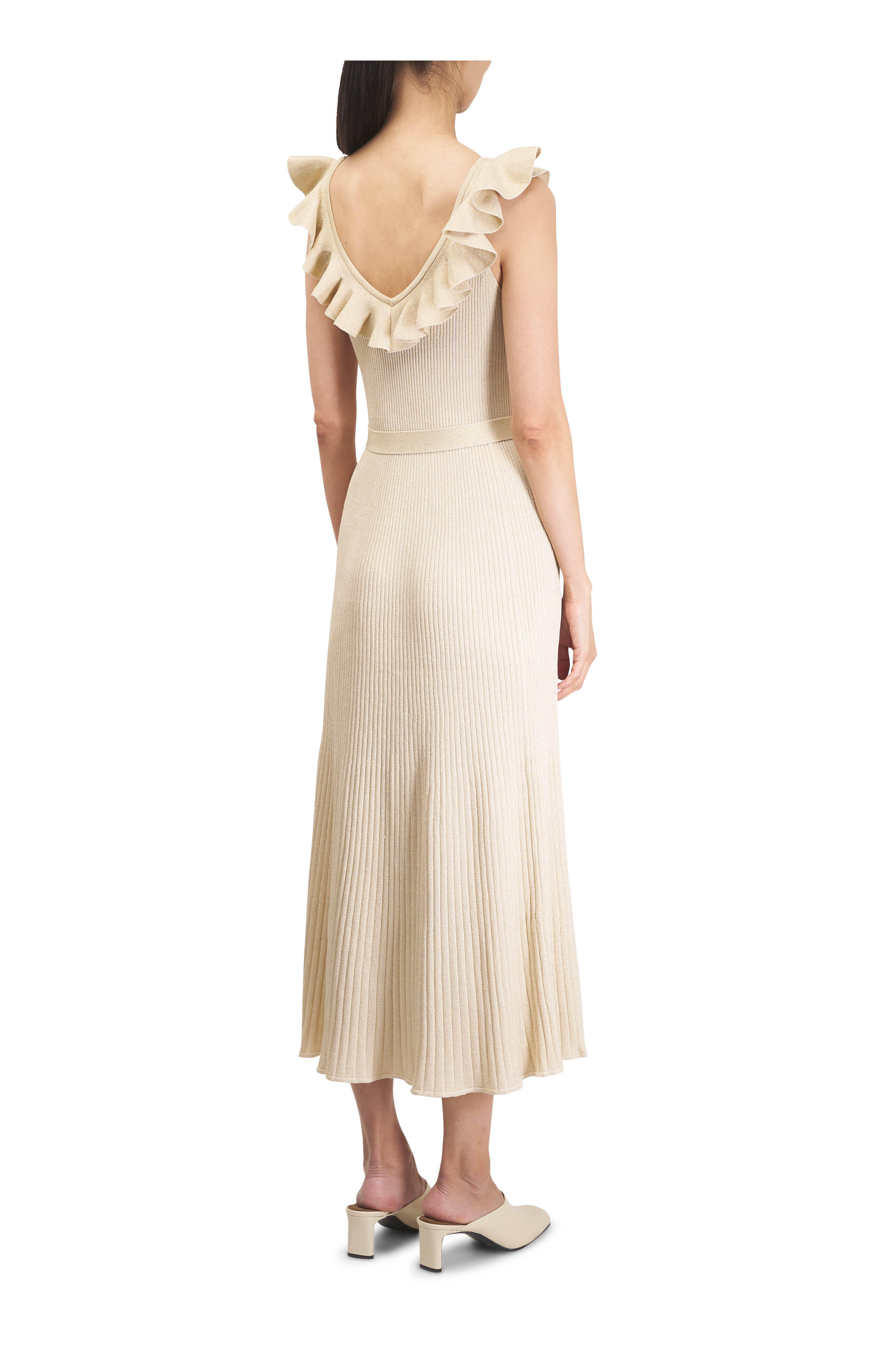 Plunging v-neckline; frill trim across bust and upper back. Slip on style. Removable belt with gold hardware. Sleeveless. Flared hem. Imported. Shoulder to hem 52" ( size s). 61% viscose, 31% polyamide, 8% metallized fiber. Dry clean.