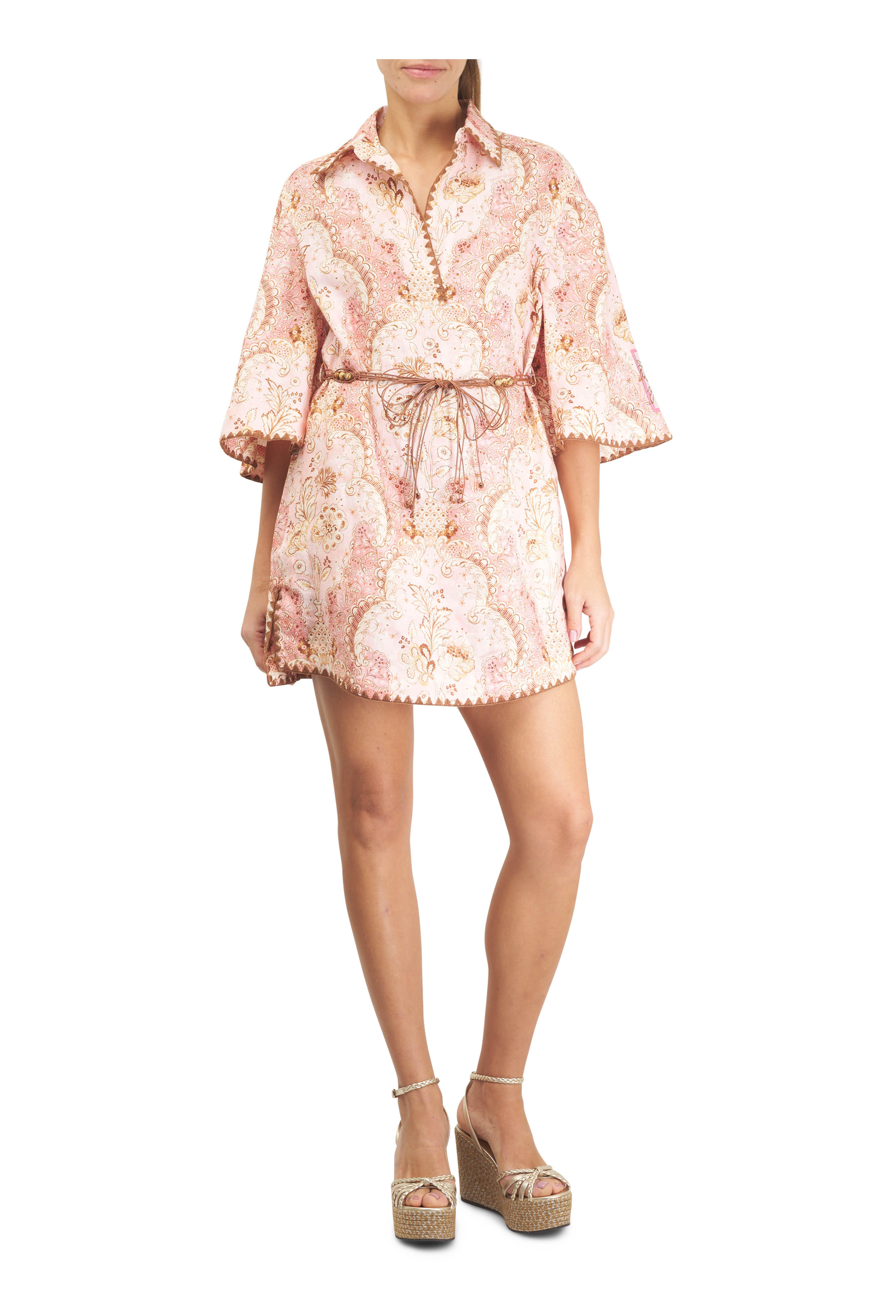Collared. Slip on style. Beaded rope tie belt. Three-quarter flared sleeves. Vented hem. Imported. Shoulder to hem 33" (size S). 100% Linen. Dry clean.