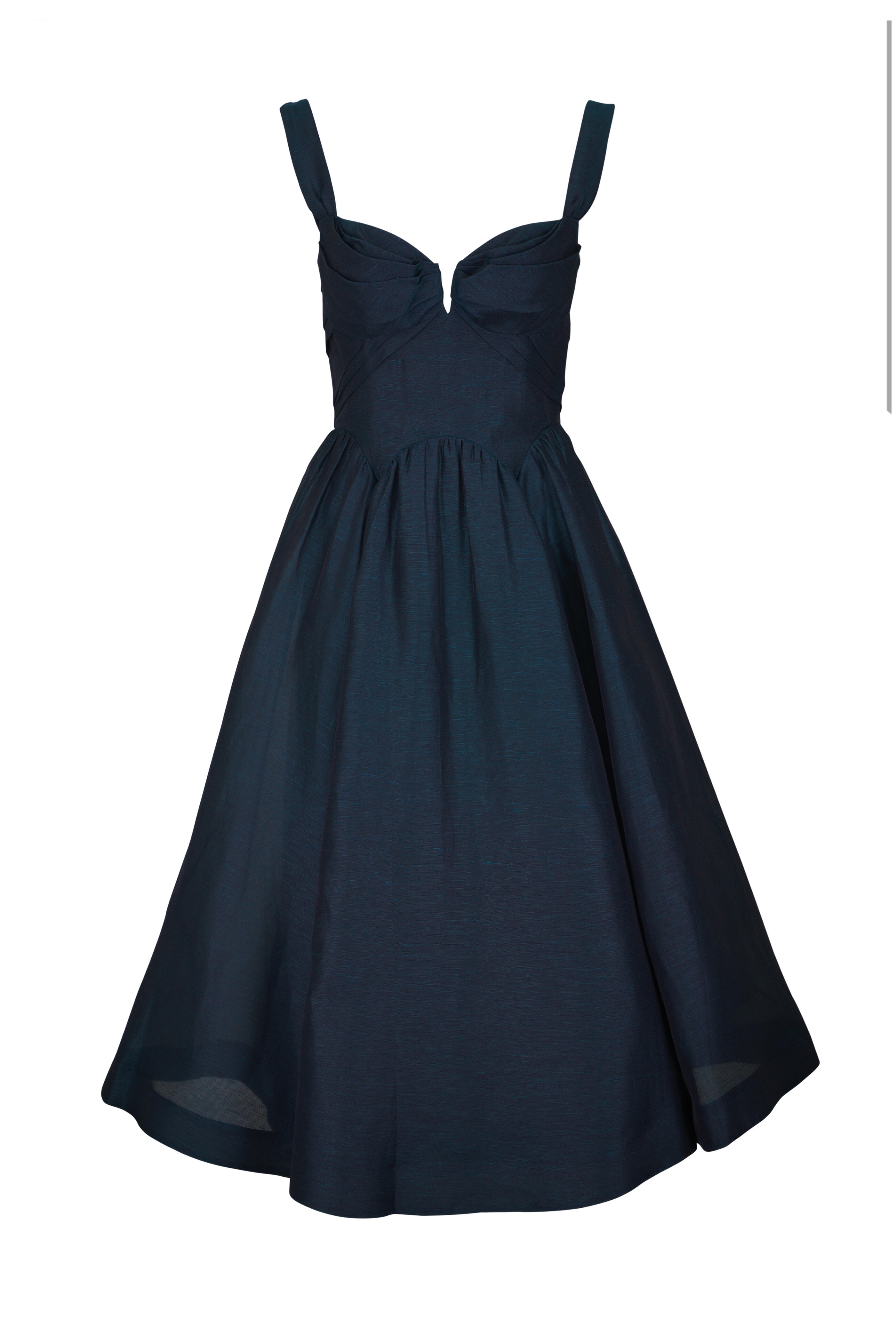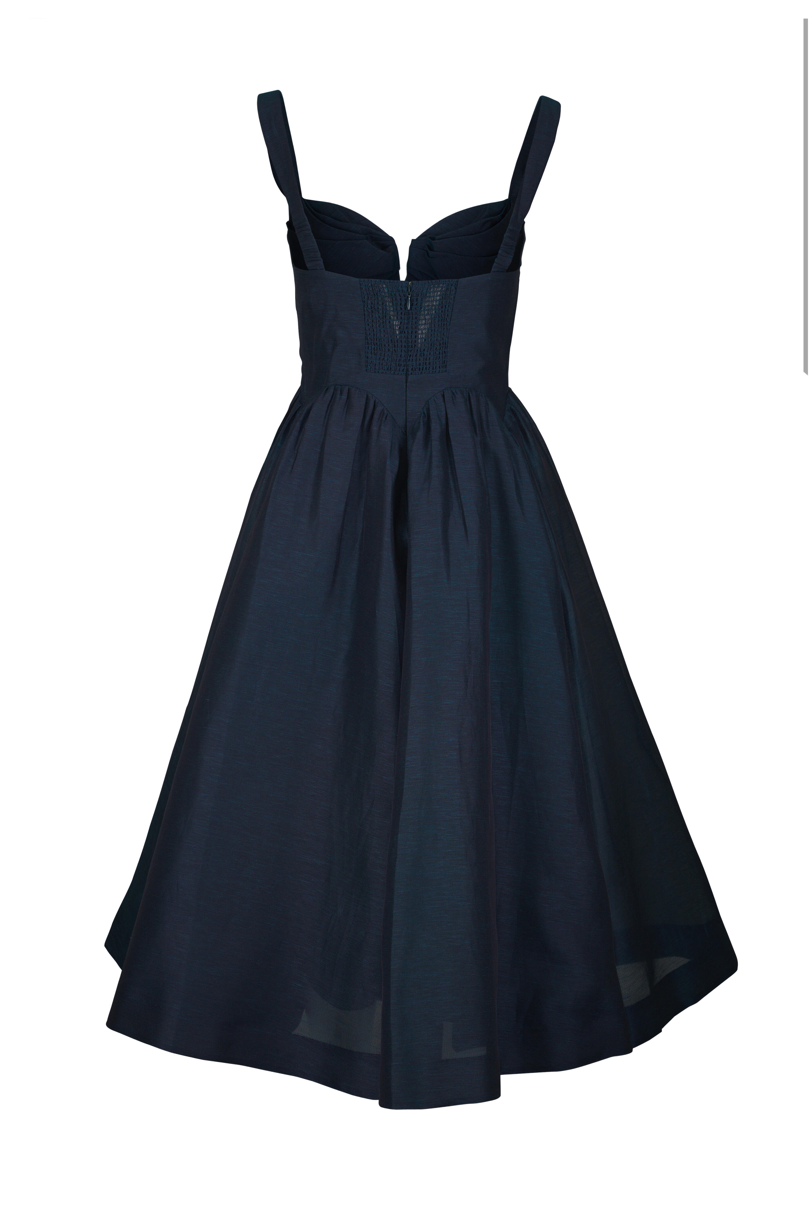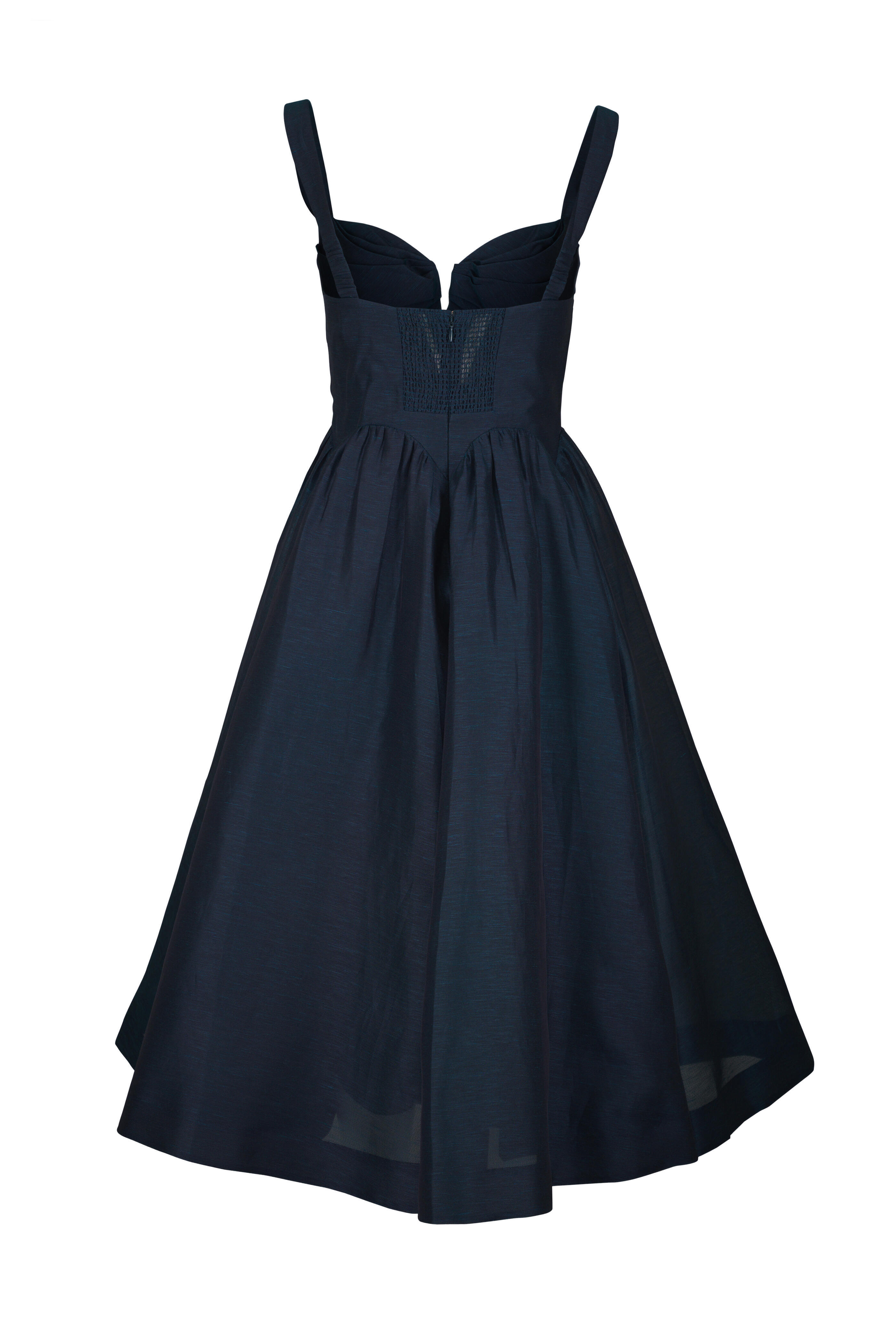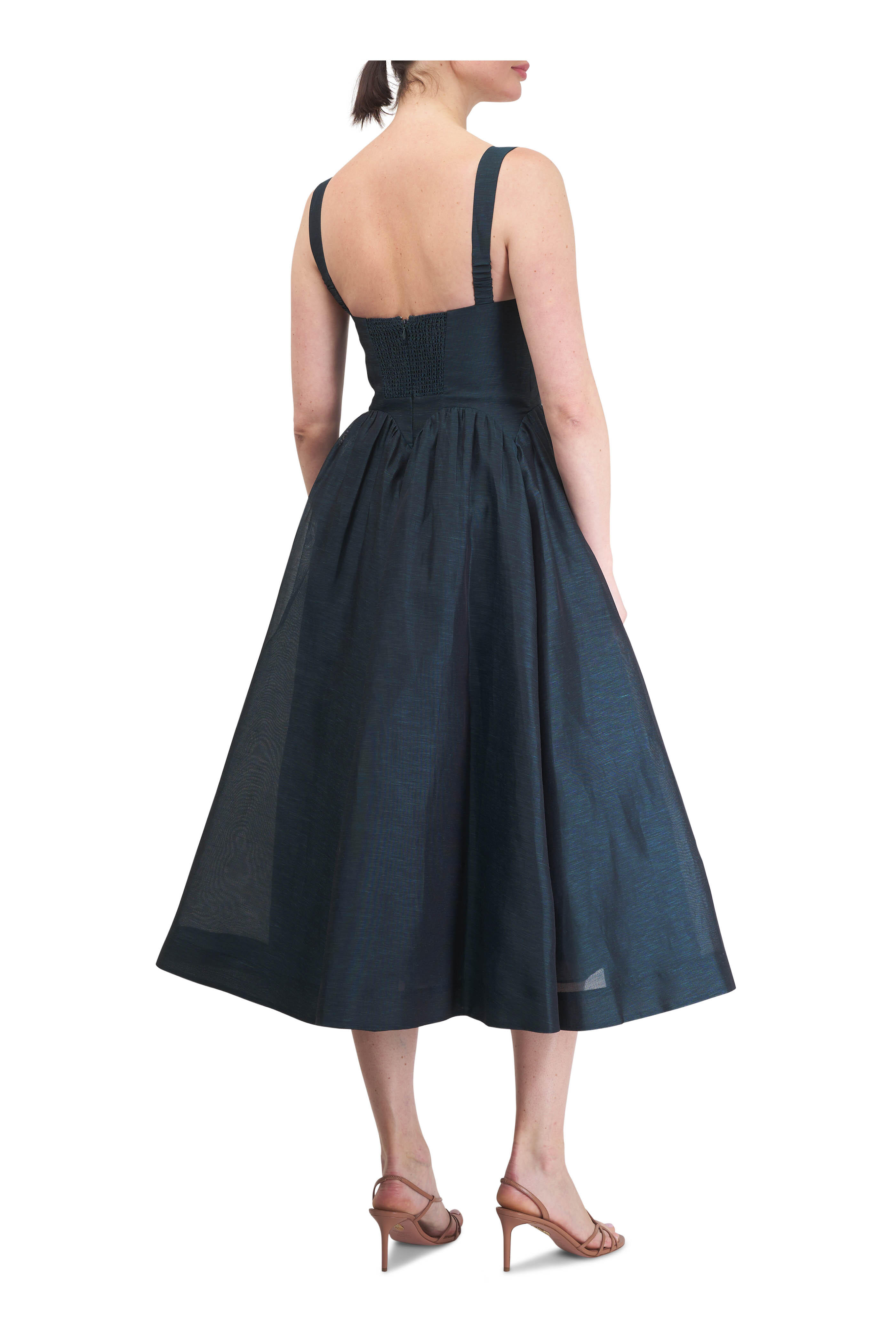 Sweetheart neckline with a keyhole detail. Slip-on style. Full, flared midi hem. Imported. 55% linen, 45% silk; contrast 100% polyester; lining 100% cotton; crinoline 100% polyester. Dry clean only.