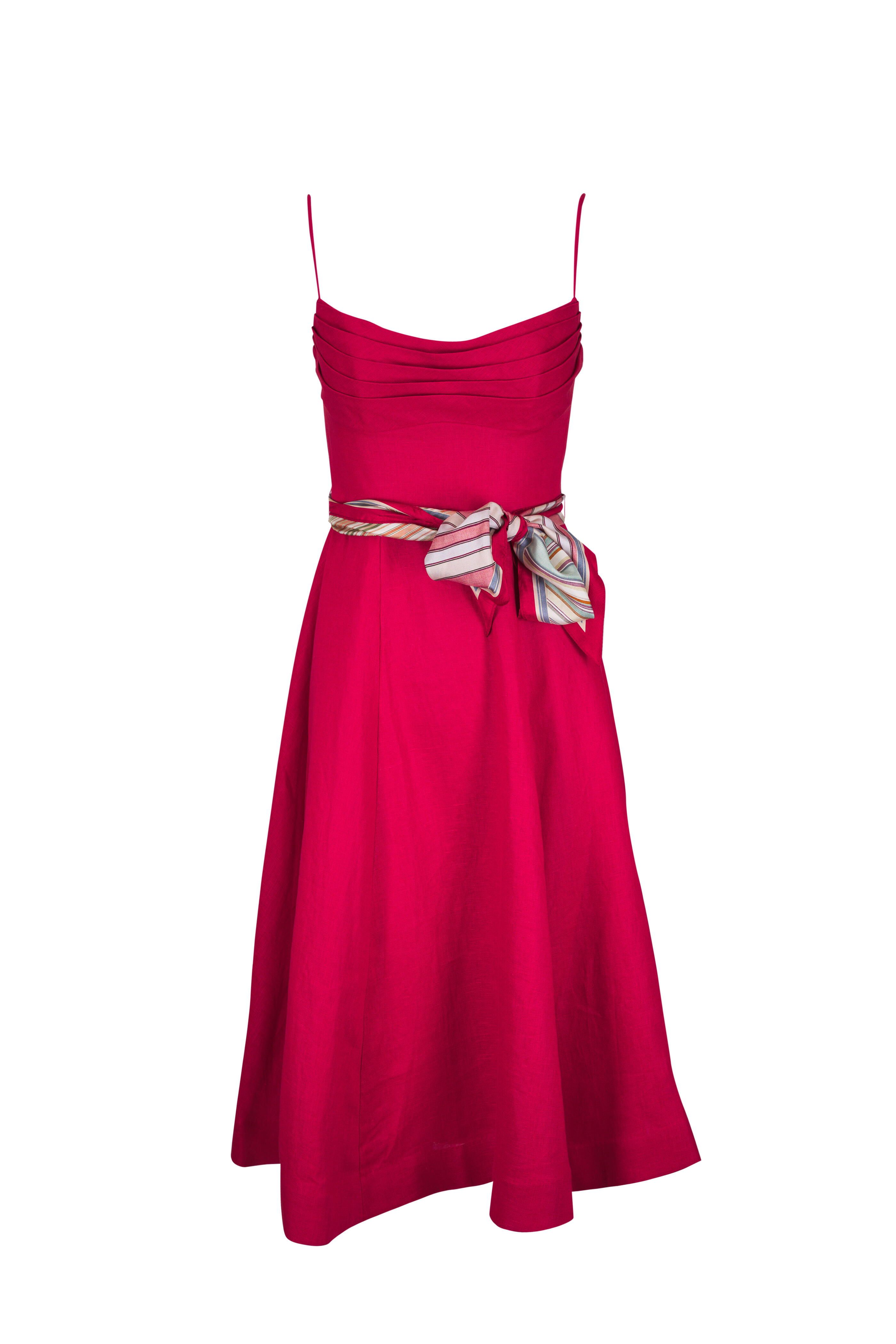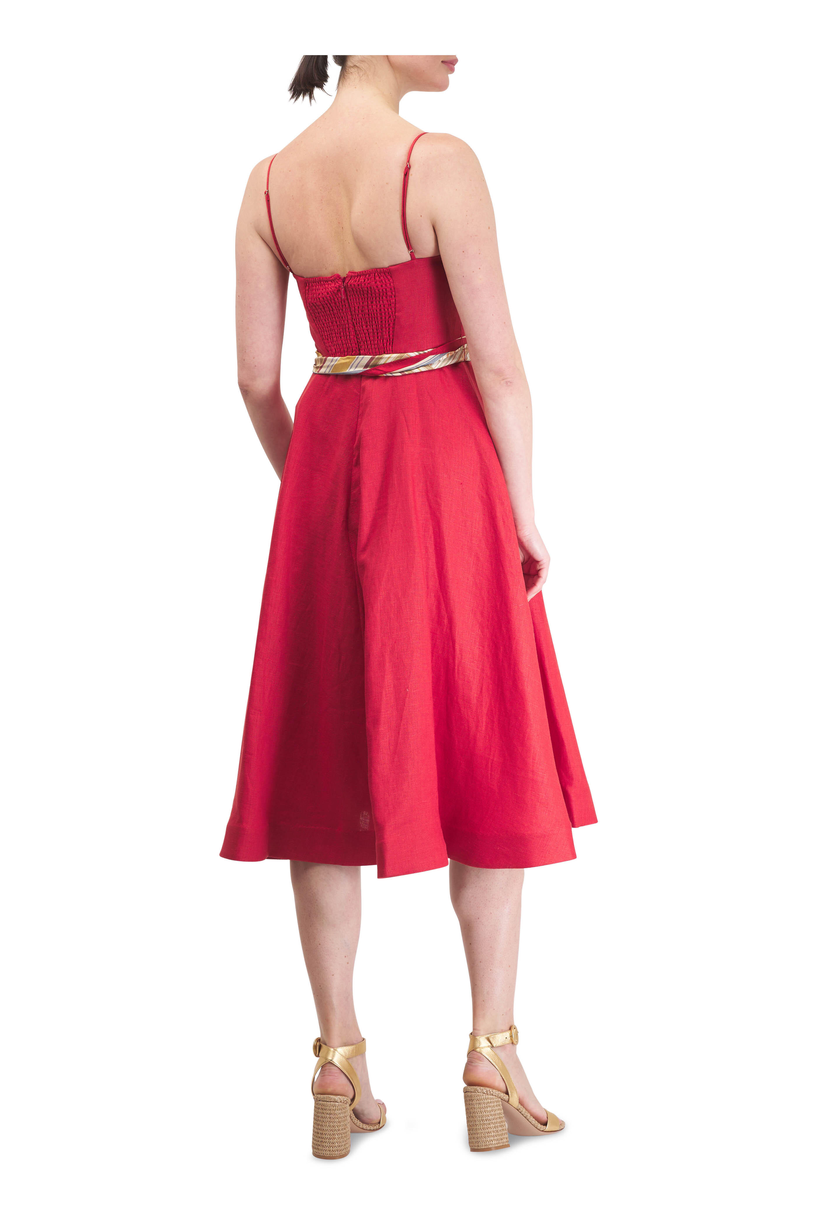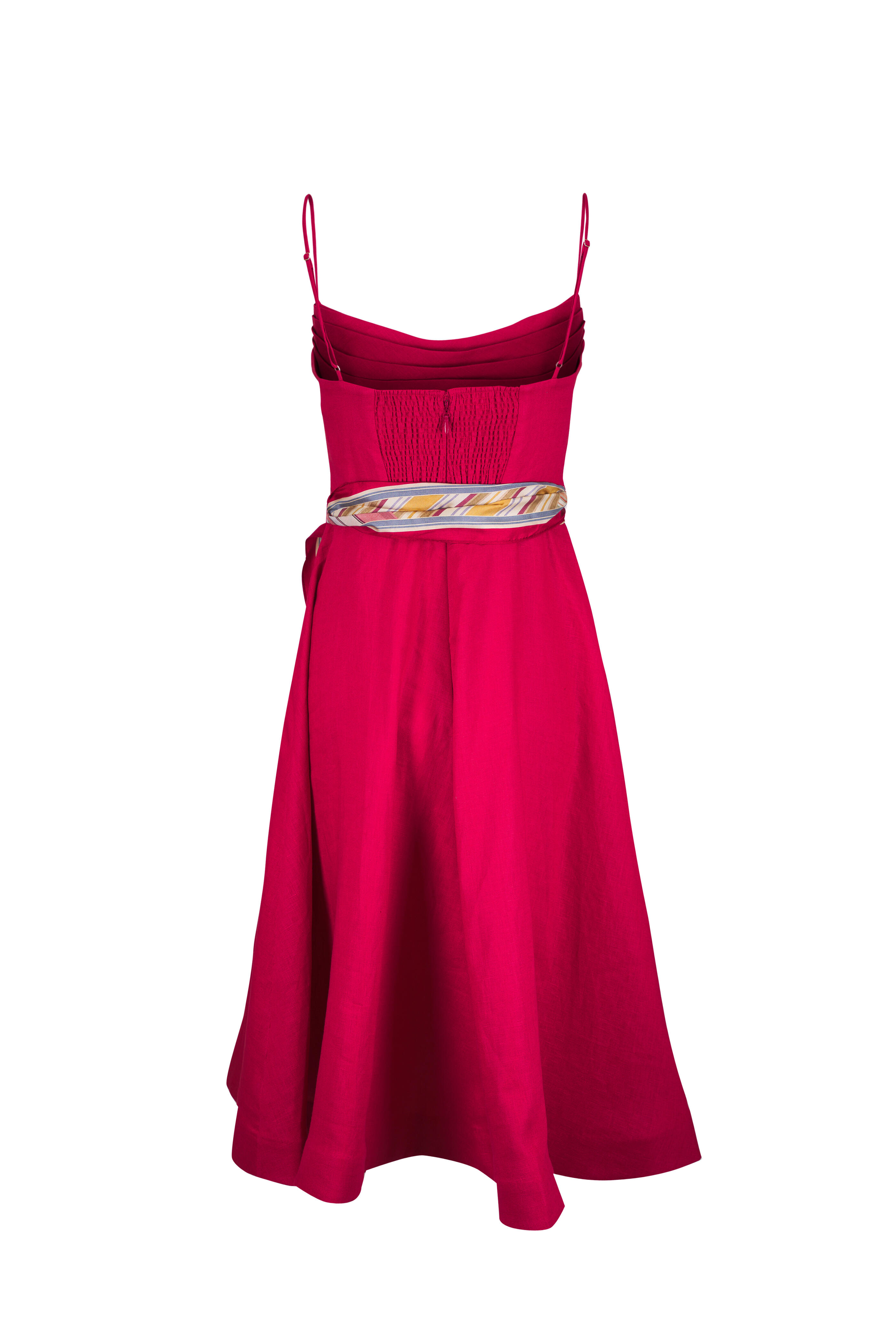 Sweetheart neckline. Concealed back zip. Shirred elastic across center back. Ruching at bust; internal boning at bust. Adjustable straps. Removable self-tie belt. Approximately 47" shoulder to hem (measurements taken from size S). 100% linen; belt: 100% silk; lined. Dry clean.