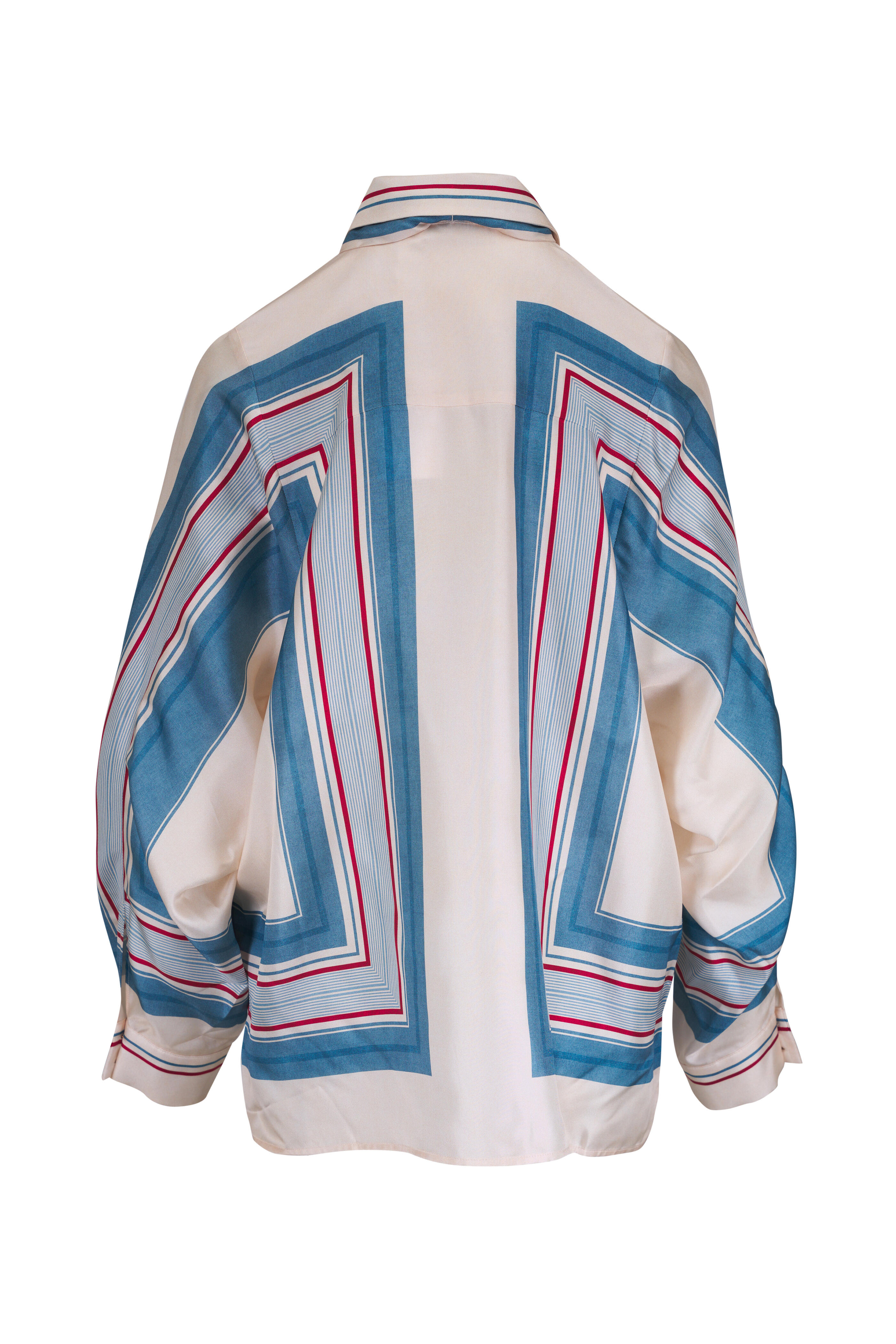 Spread collar; removable silk tie. Front button placket. Double button square cuffs. Side splits at hip panels. Shirttail hem. Imported. Relaxed fit. Shoulder to hem 28" (size xs). 100% Silk. Dry clean.