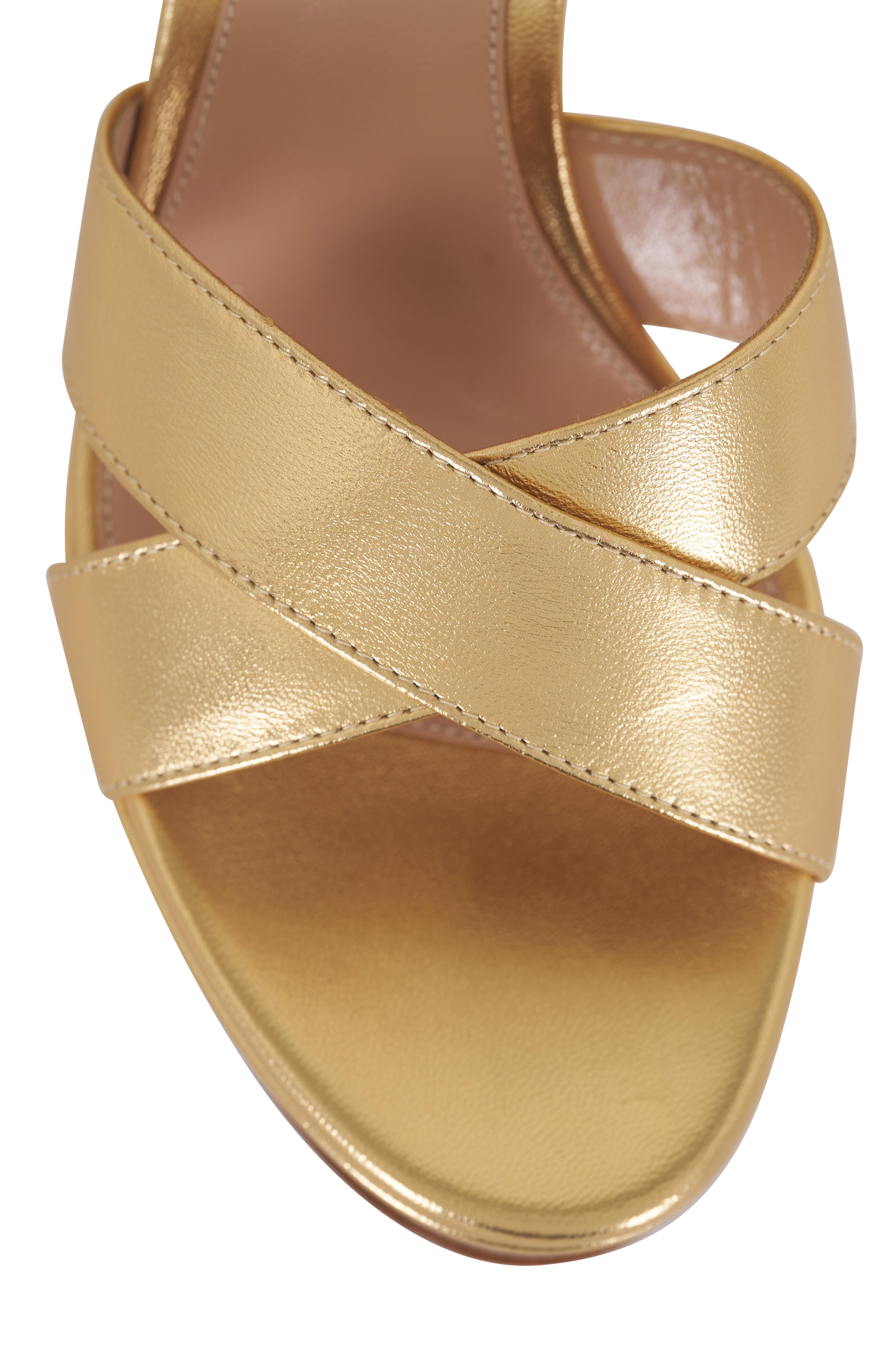 Metallic leather upper. Leather lining and sole. Open toe. Adjustable ankle strap. Criss-cross vamp. Slip-on style. Made in Italy. Heel measurement: 70mm.