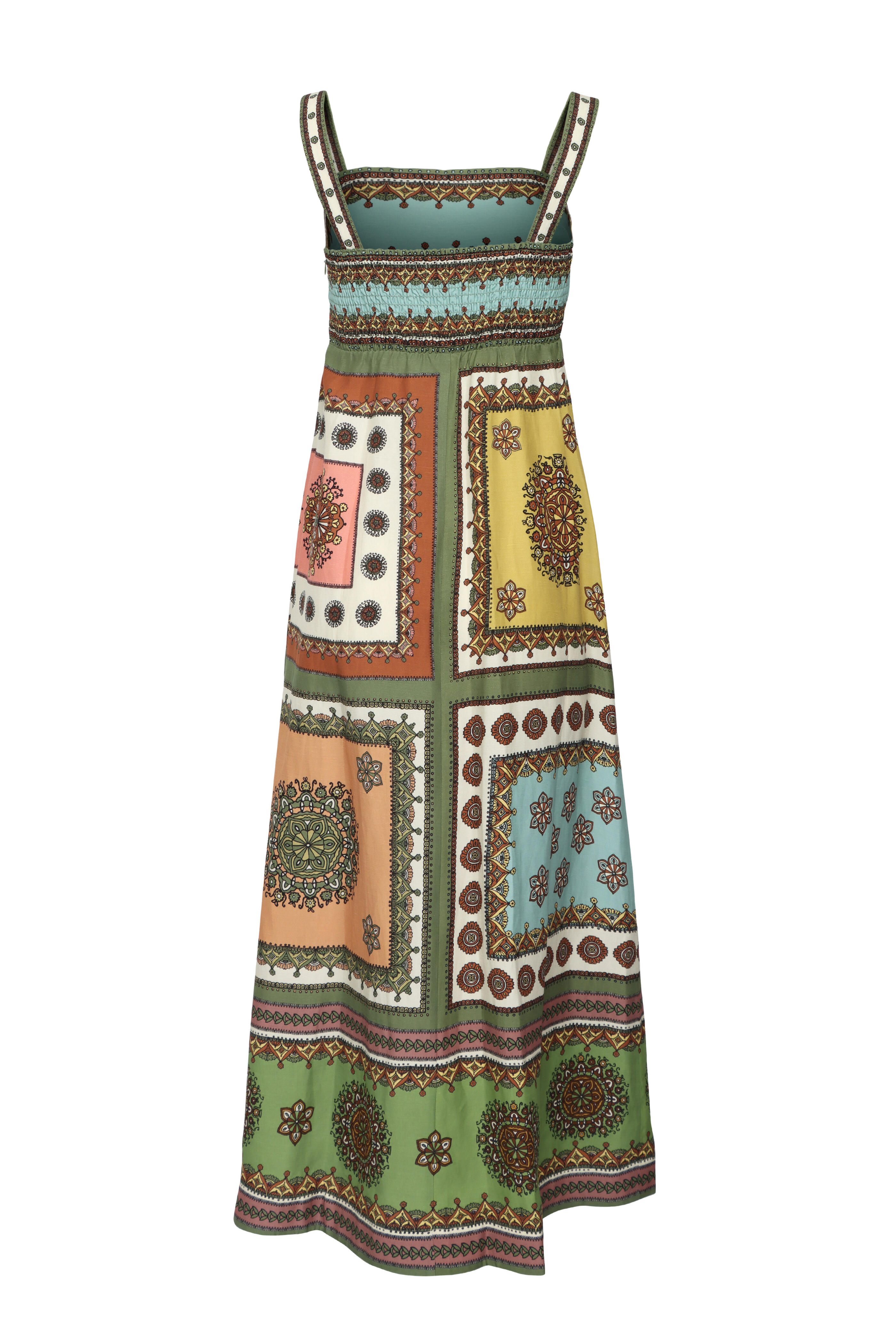Square neck. Square back. Sleeveless. Smocked back panel. Concealed side zip closure. Aline silhouette. Imported. Bust 35.5” (US 4). Waist 29.5” (US 4). Length 47” (US 4). Midi length. 83% viscose, 17% linen. Dry clean.
