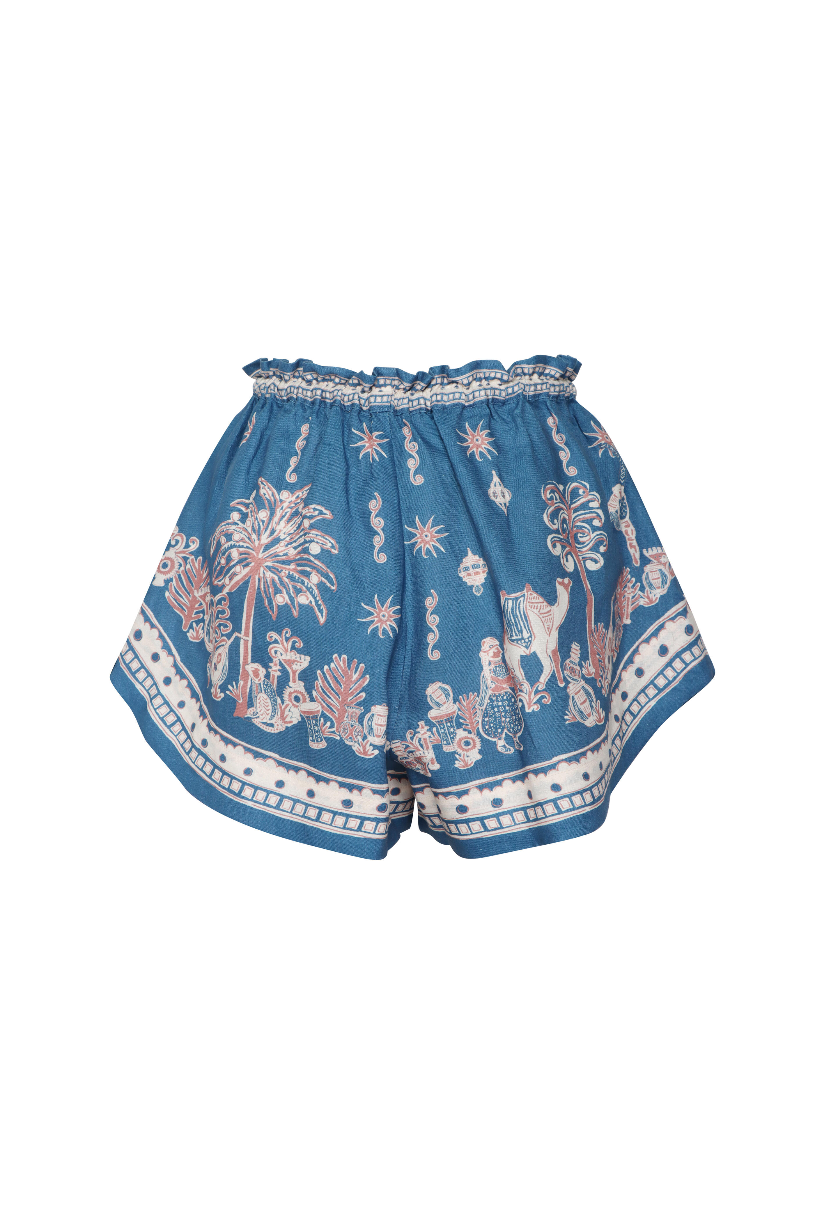High rise. Elastic drawstring waist. Wide through leg. Curved hem. Imported. Rise 30” (US 4). Waist 26.5” (US 4). Length 13.5” (US 4). 100% linen. Handwash.