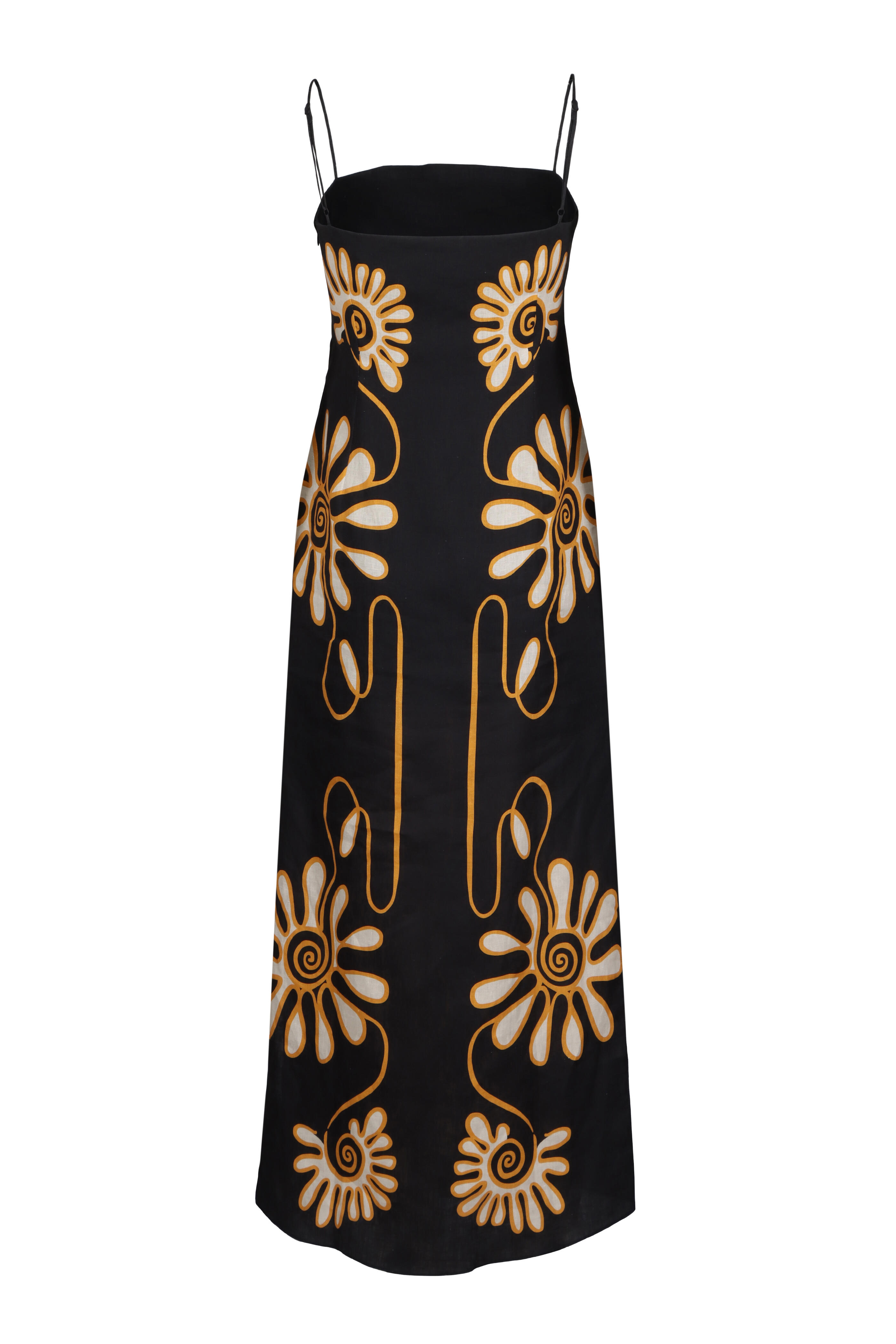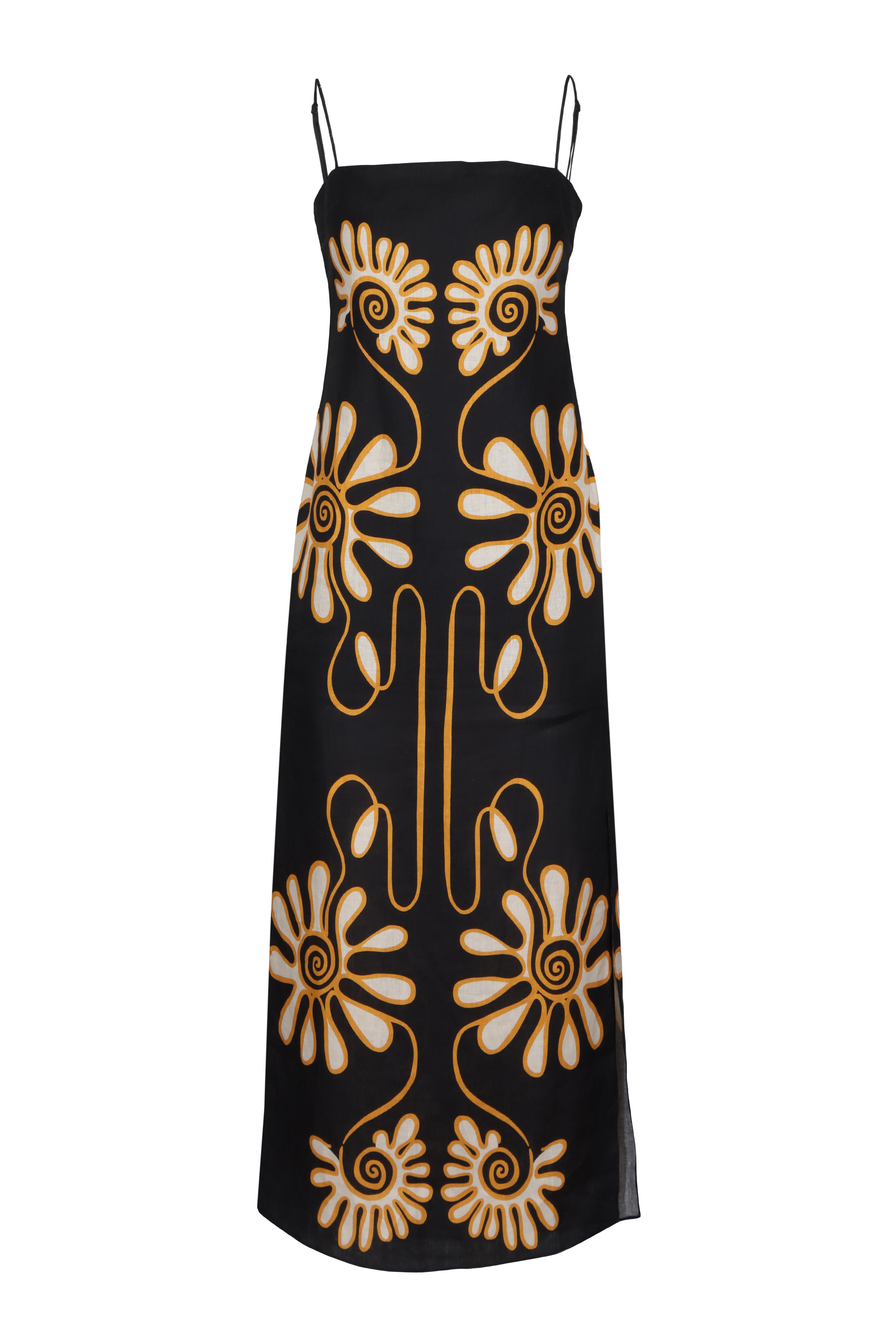 Square neck. Square back. Sleeveless ; thin adjustable shoulder straps. Concealed zip closure. Side slits. Shift silhouette. Imported. 100% linen, 100% cotton lining. Dry clean.