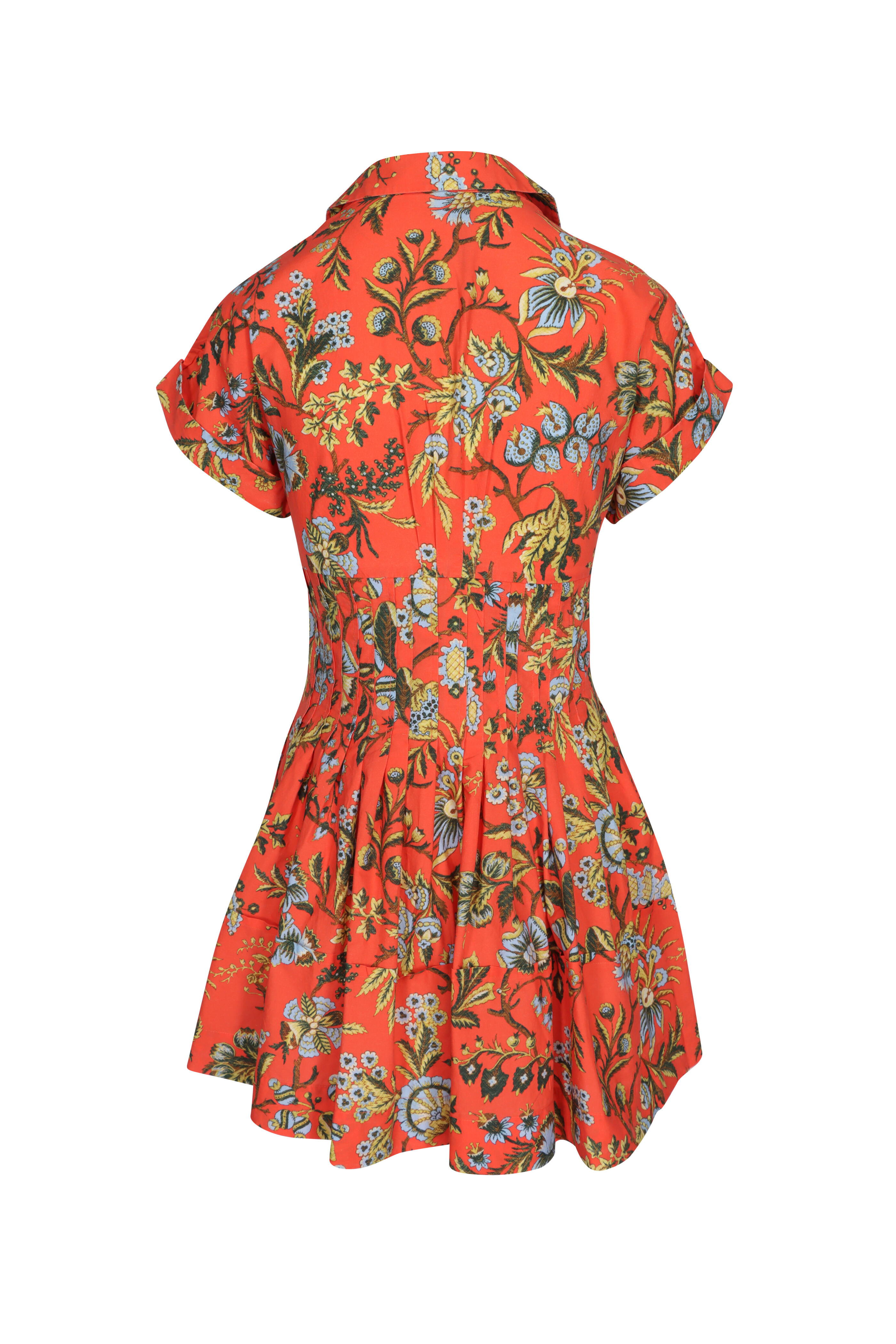 Collar. Short sleeves. Front button closure. Side seam pockets. Imported. Mini length. 100% cotton. Dry clean.