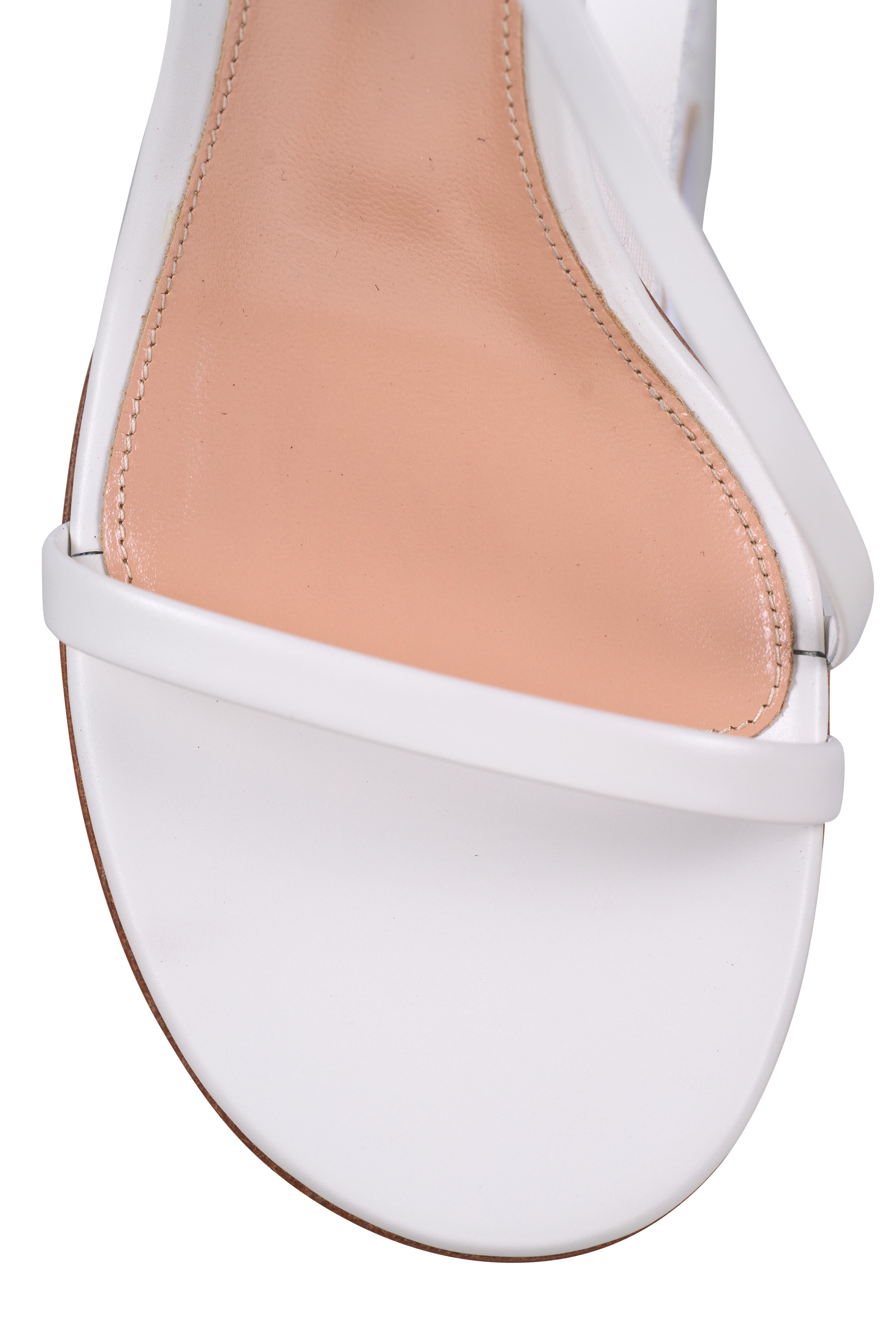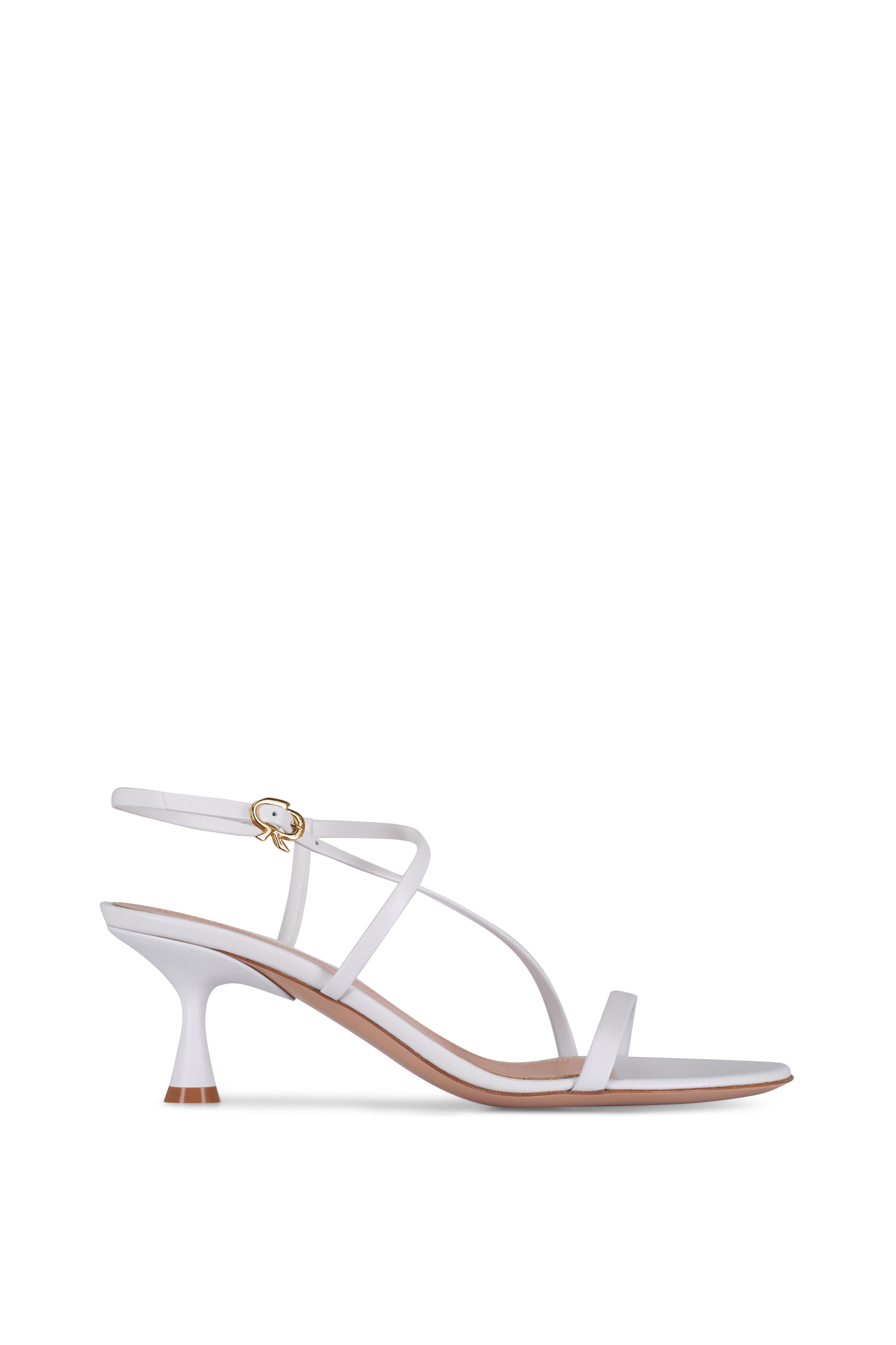 Leather upper. Round, open toe. Adjustable buckle closure. Strappy details across vamp. Leather insole. Self-covered stiletto heel. Leather sole. Made in Italy. Heel measurement: 55mm.