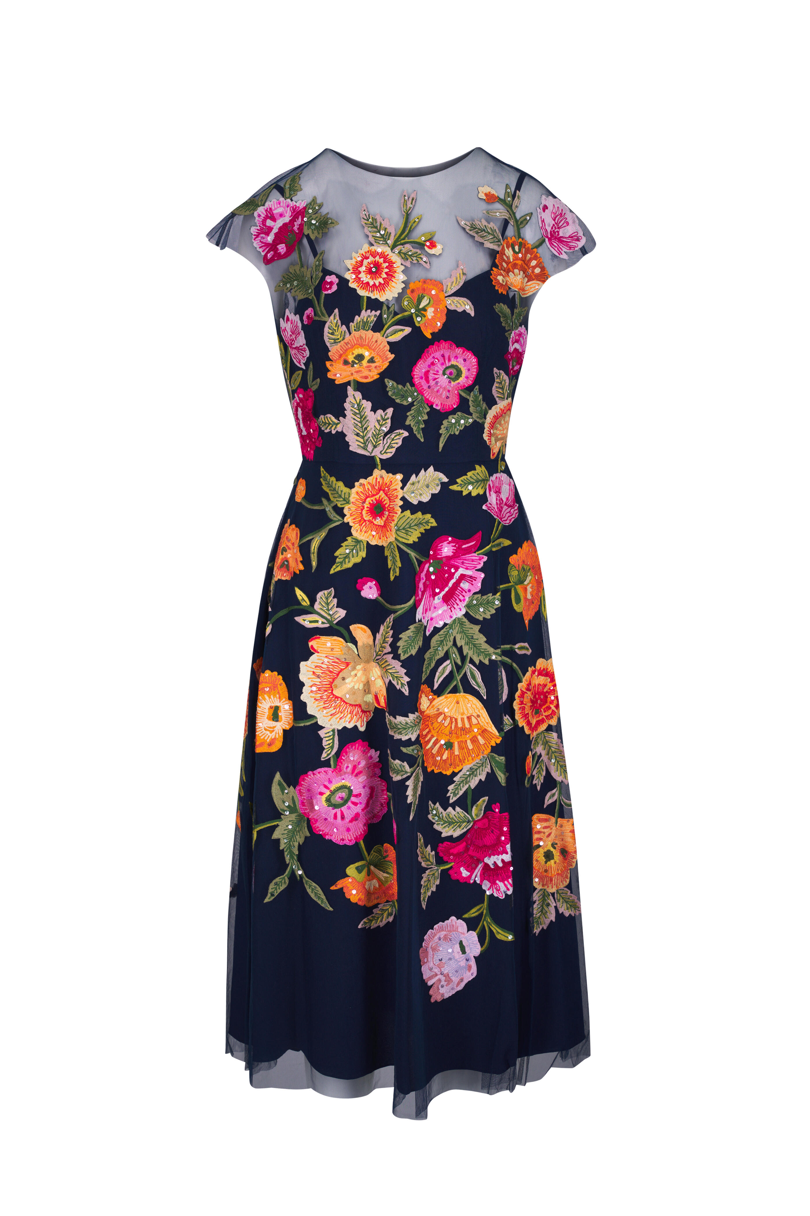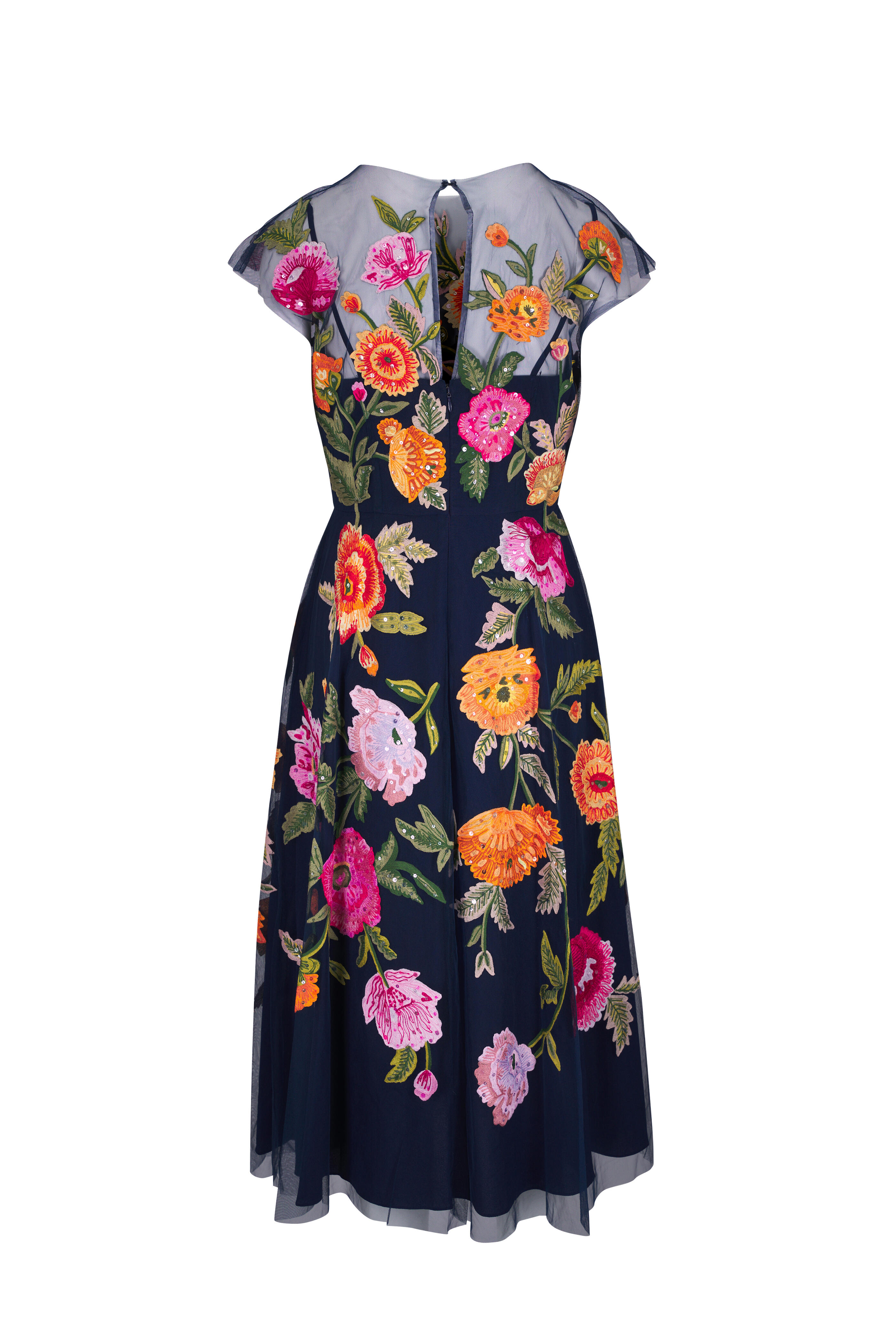 Midnight Multi Floral Embroidered Tulle Midi Dress
