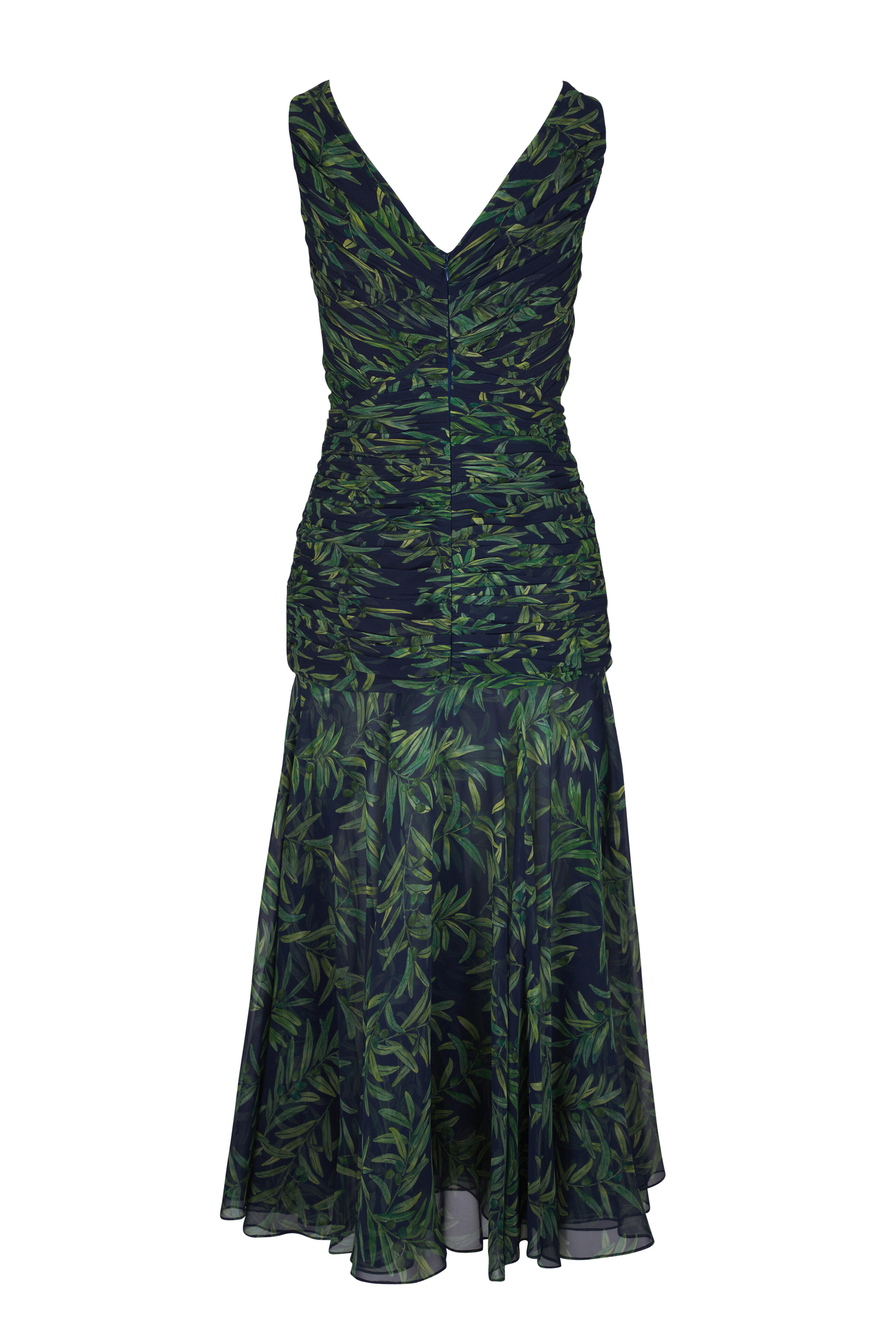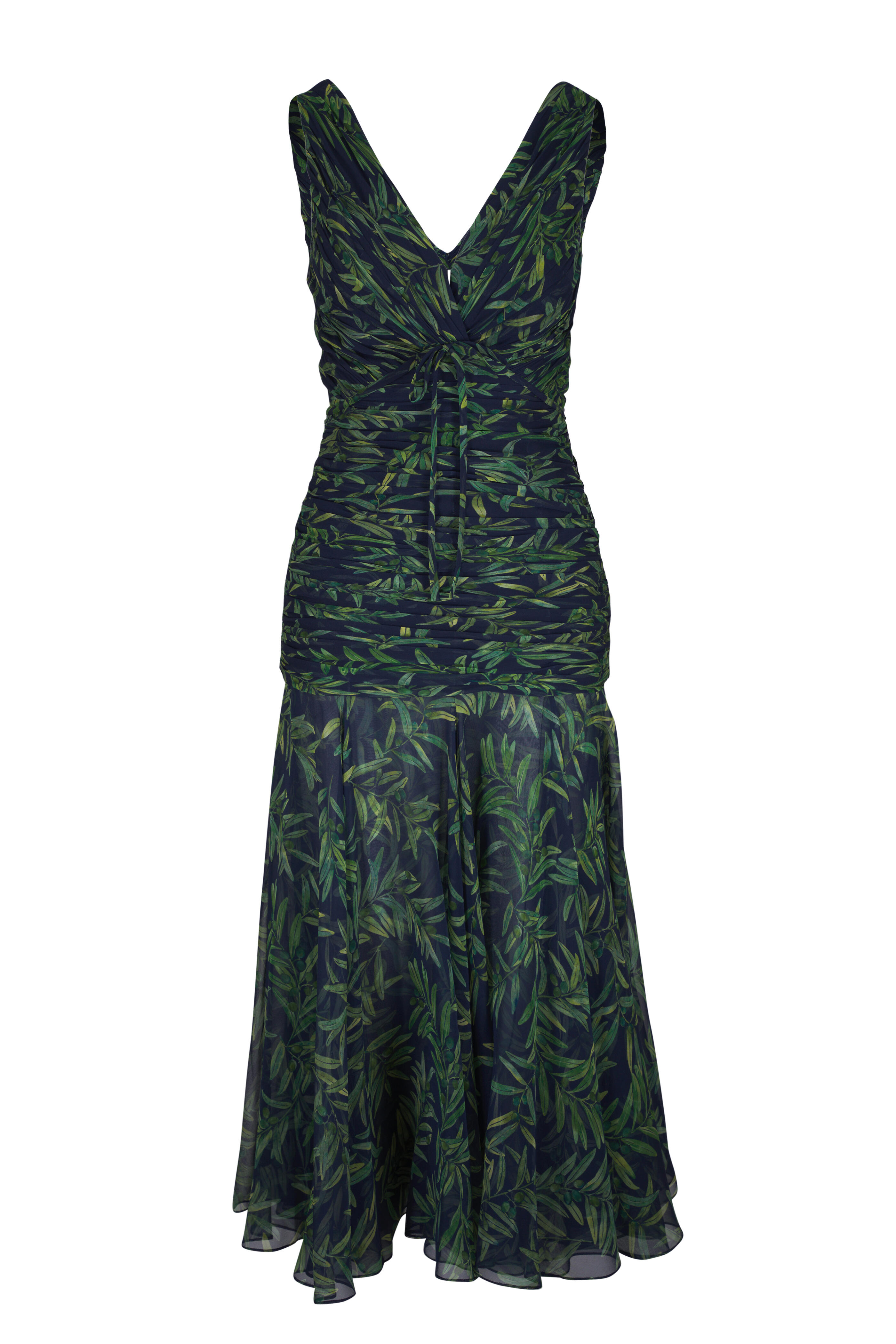 Plunging v-neckline. Concealed back zip. Ruched waist. Decorative bow at center of chest. Made in the USA. Approximately 52" shoulder to hem (measurements taken from size 4). 100% silk, lined. Dry clean.