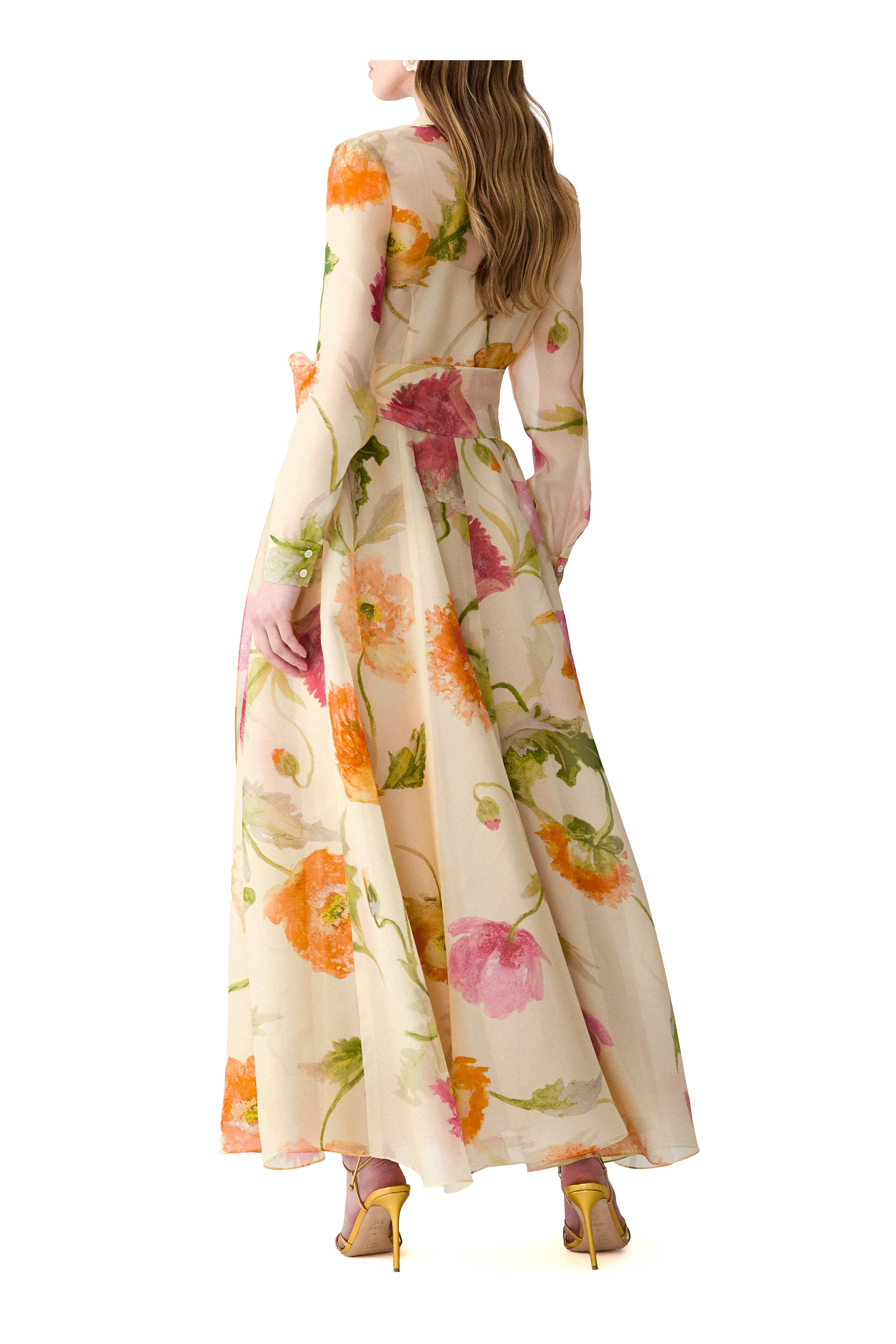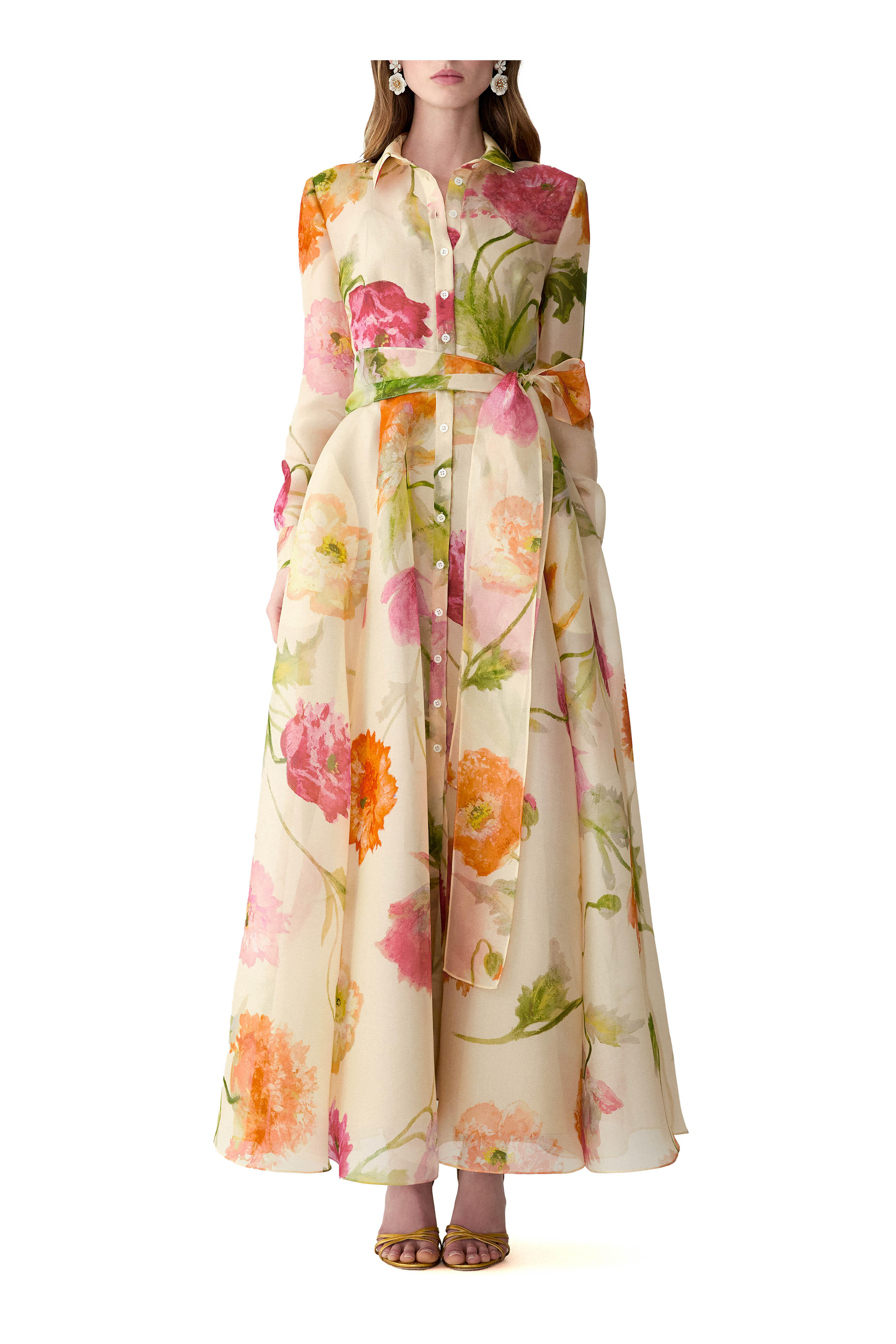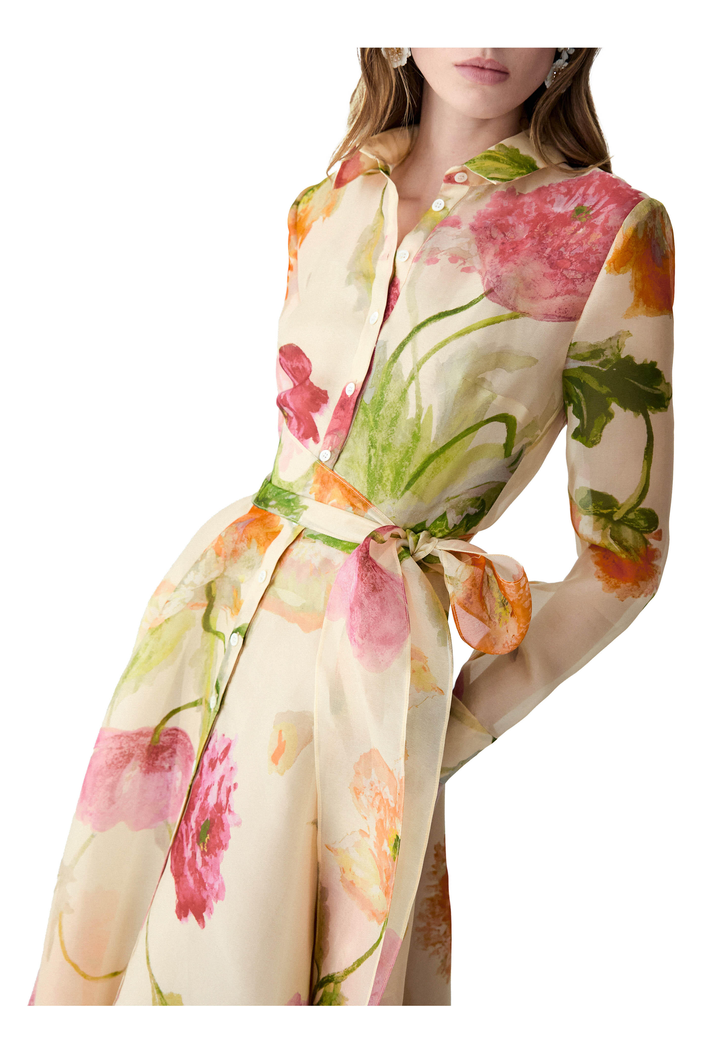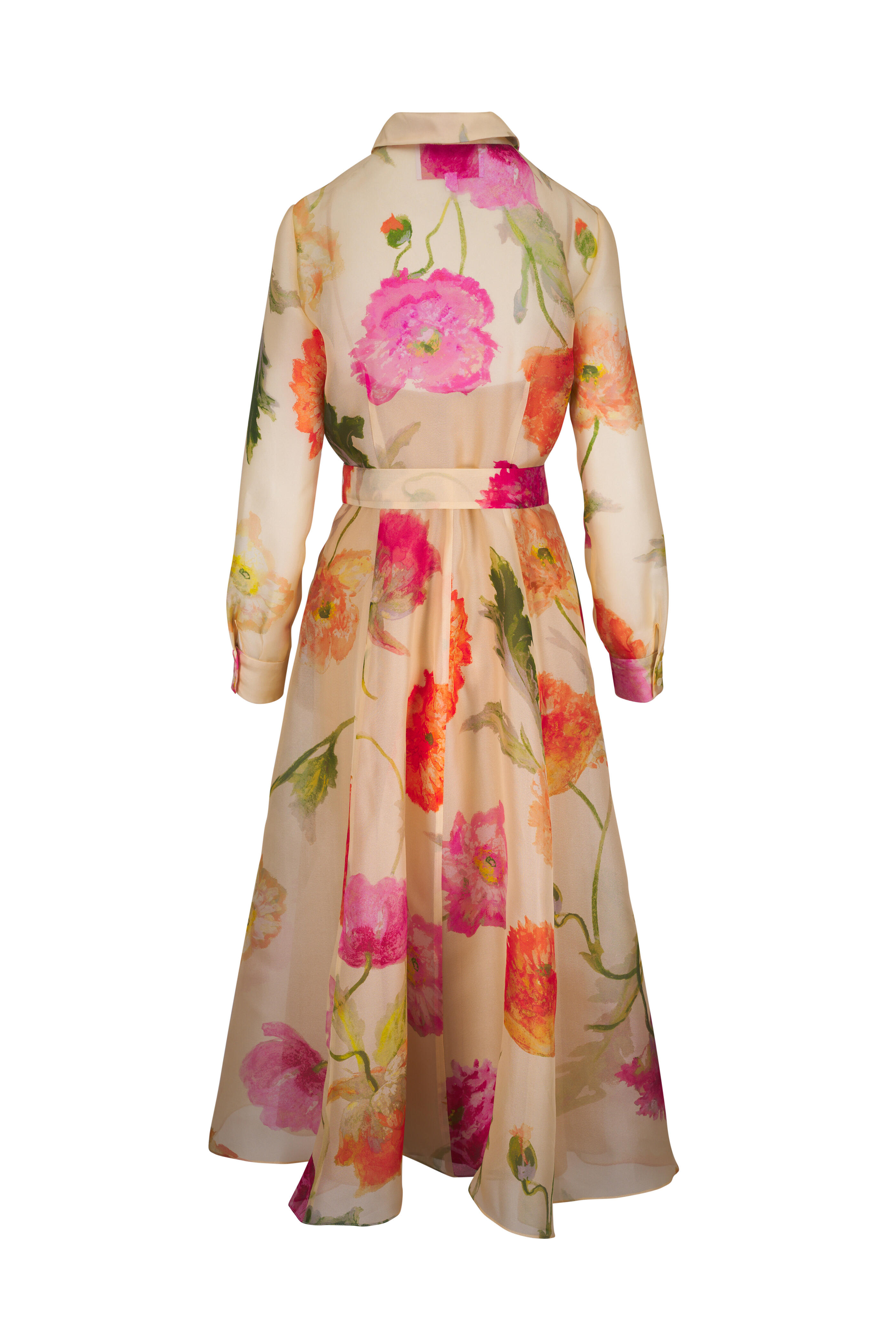 Spread collar. Front button placket. Side slip pockets. Removable self-tie belt. Double button cuffs. Made in the USA. Approximately 52" shoulder to hem (measurements taken from size 8). 100% silk; lined. Dry clean.