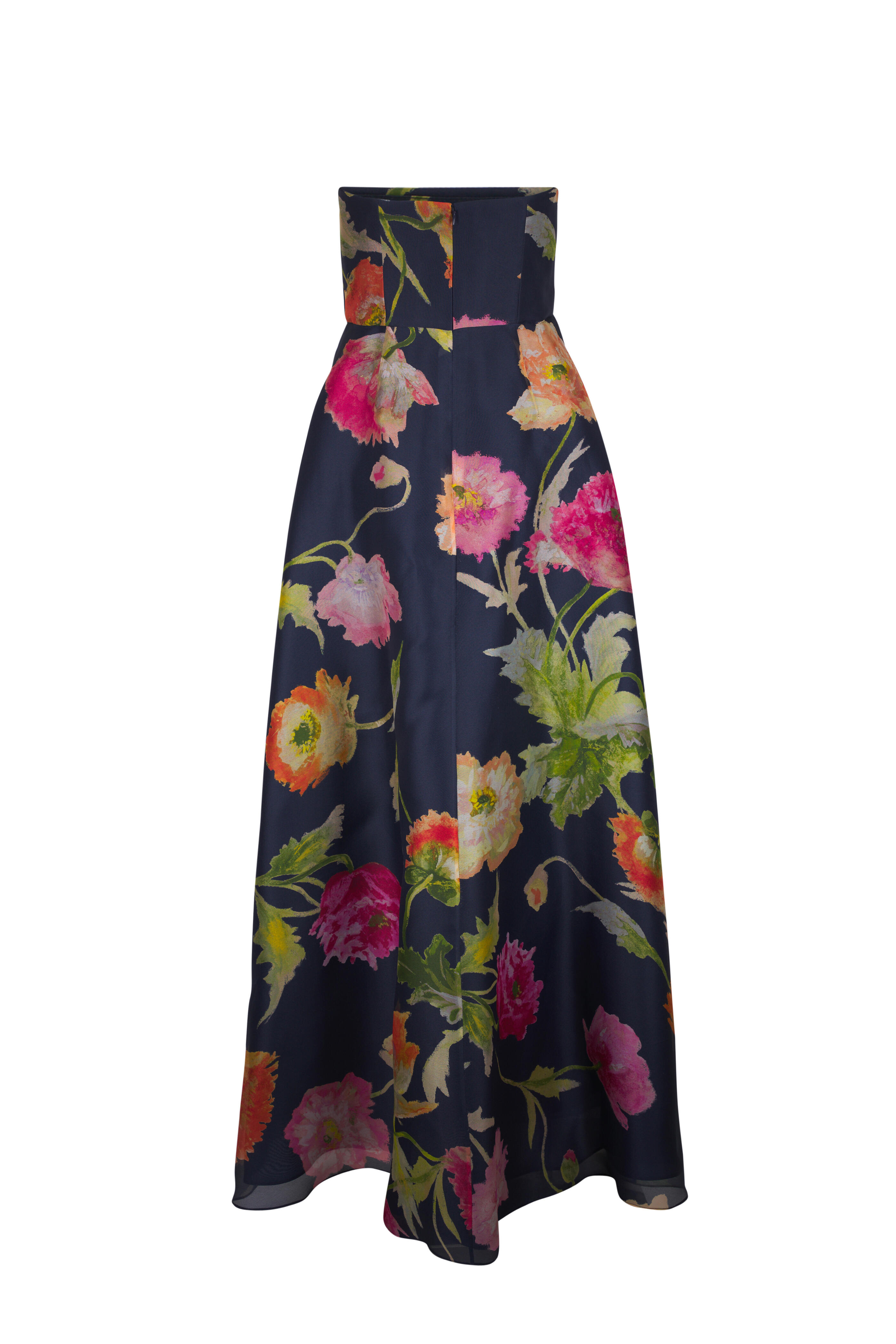 Strapless neckline. Concealed back zip. Pullover style. Straight hem. Made in USA. Shoulder to hem 57" (size 6). 100% Silk; lined. Dry clean.