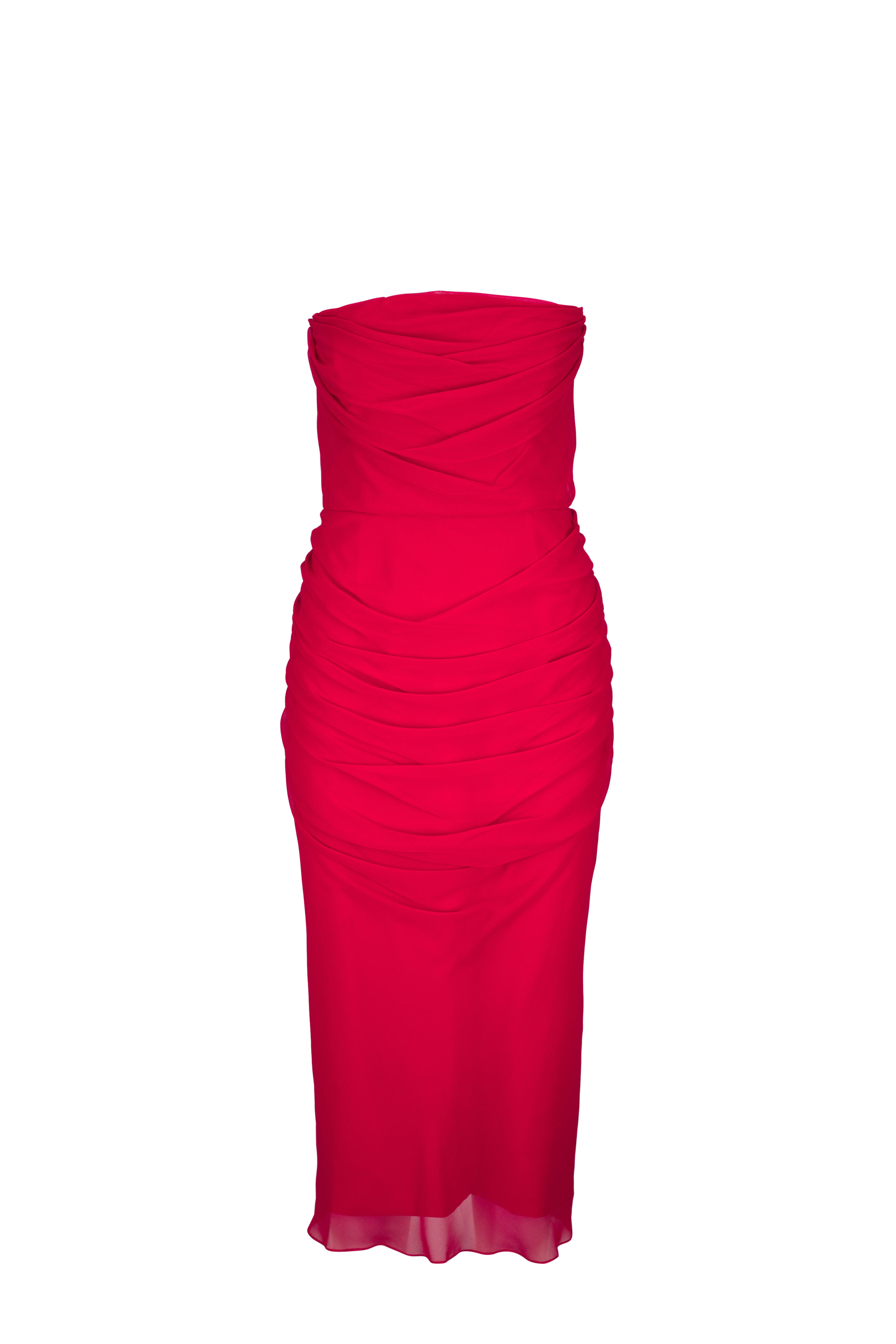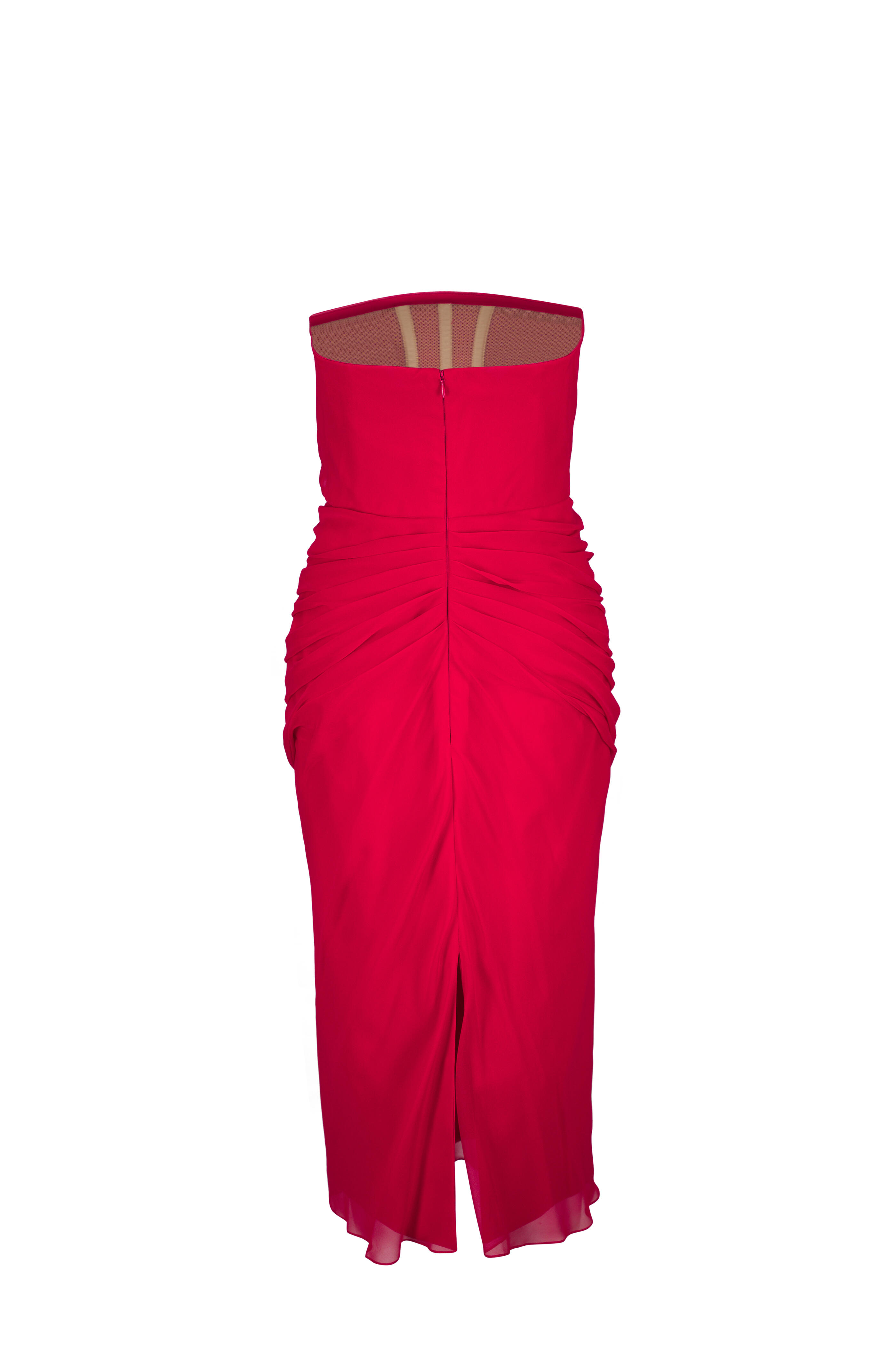 Strapless neckline. Concealed back zip. Back slit. Lightweight silk-chiffon. Made in the USA. Close-fitting column silhouette. Midi length. 100% silk. Dry clean.