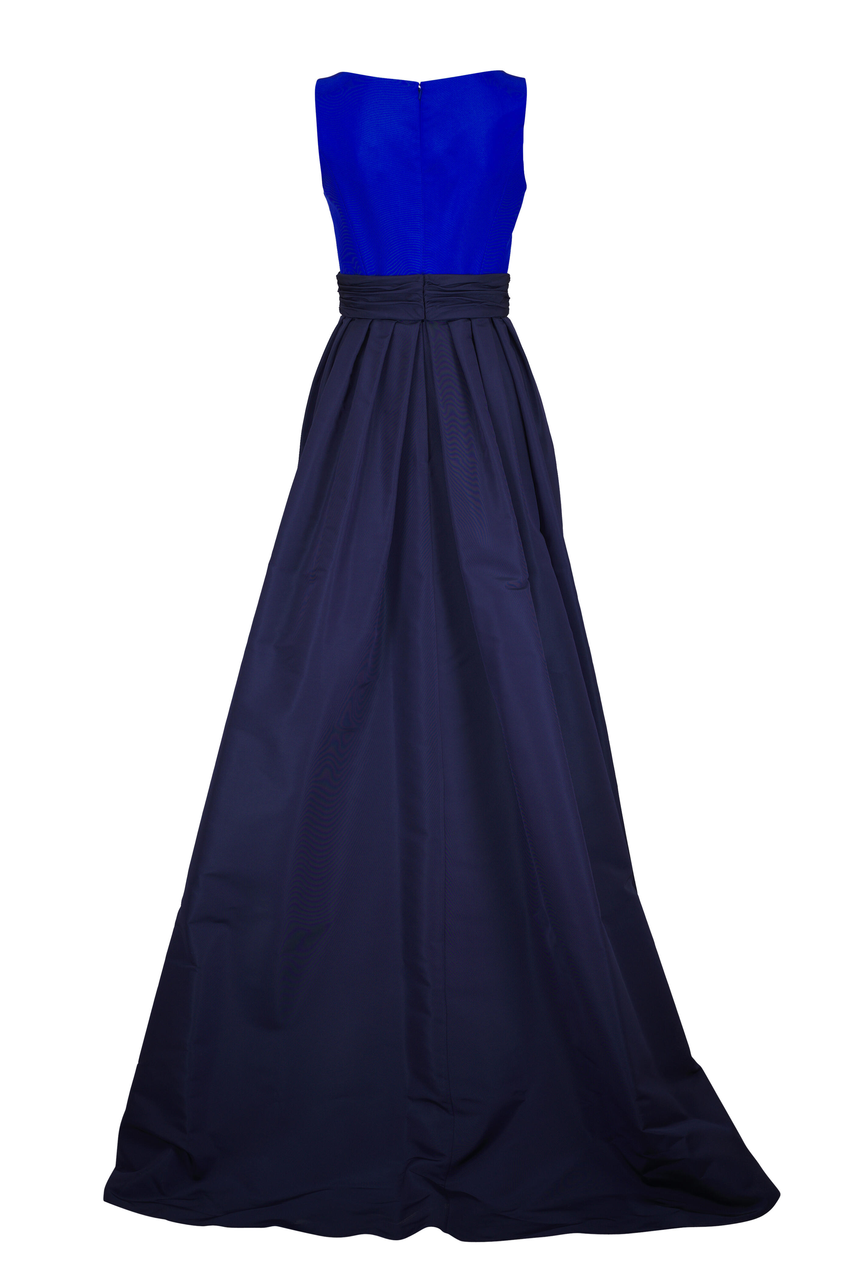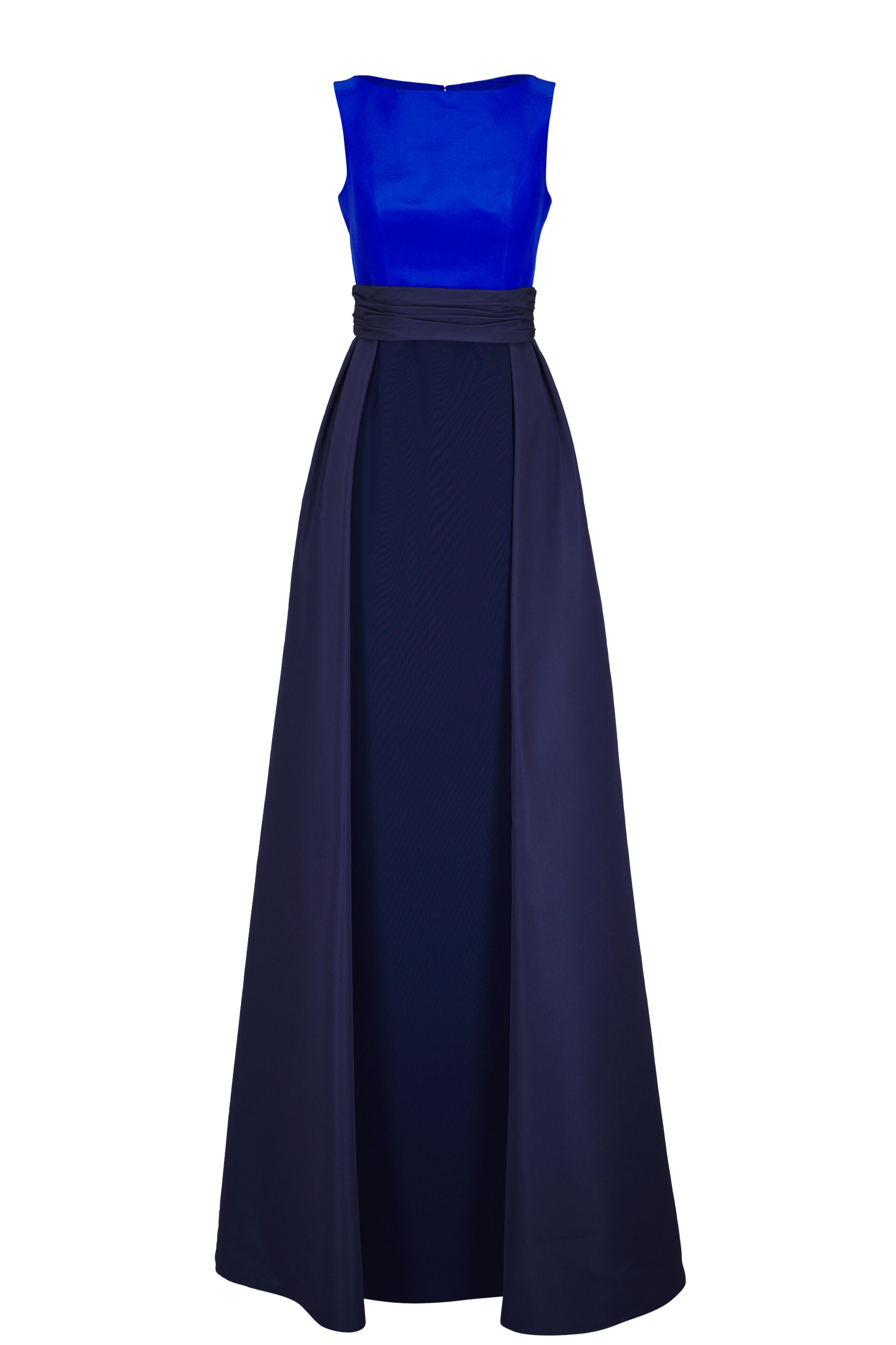 Bateau neckline. Concealed back zip; hook and eye placket. Back vent; removable taffeta overlay. Made in the USA. 100% silk; fabric 2: 92% polyester, 8% polyurethane; fully lined. Dry clean.