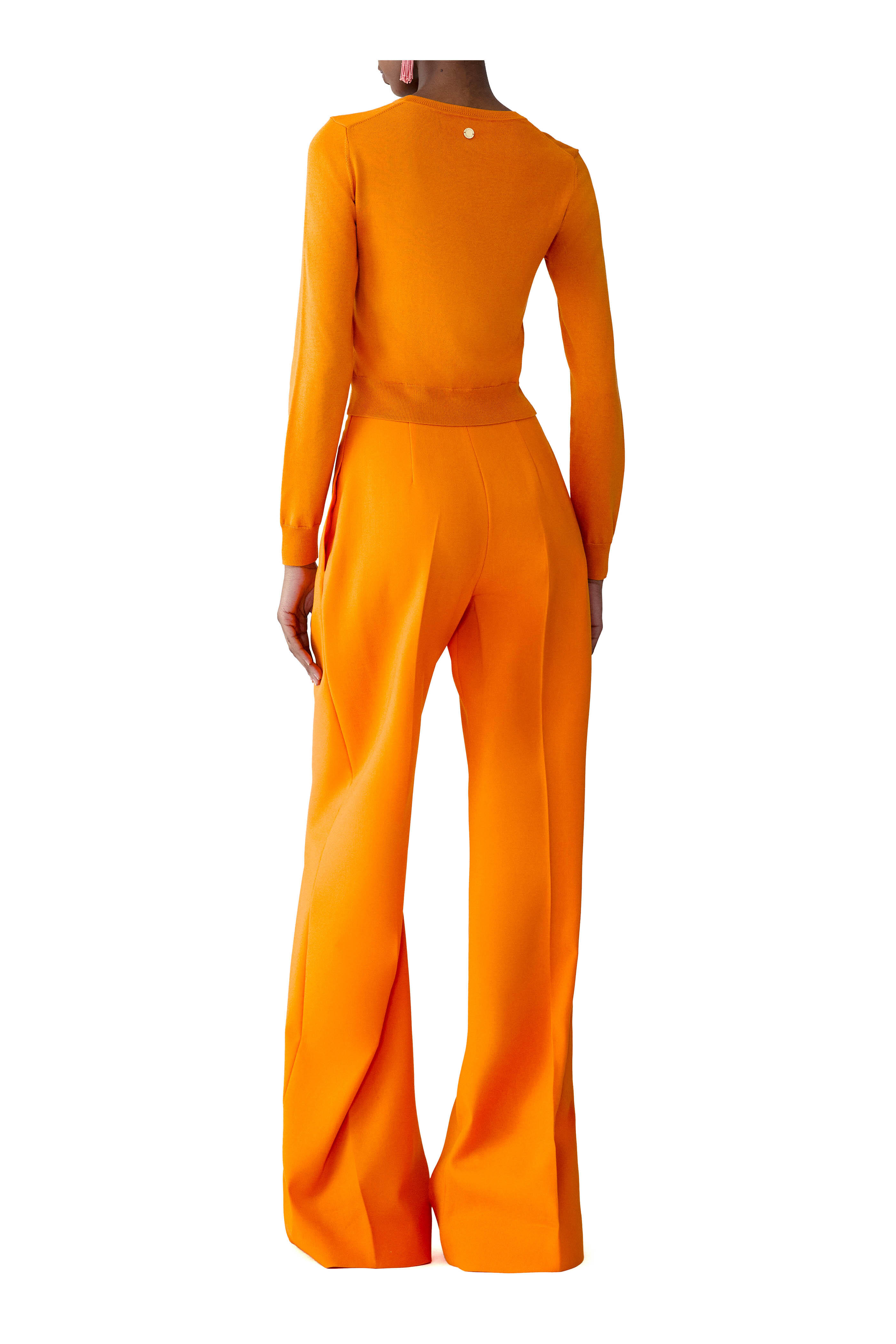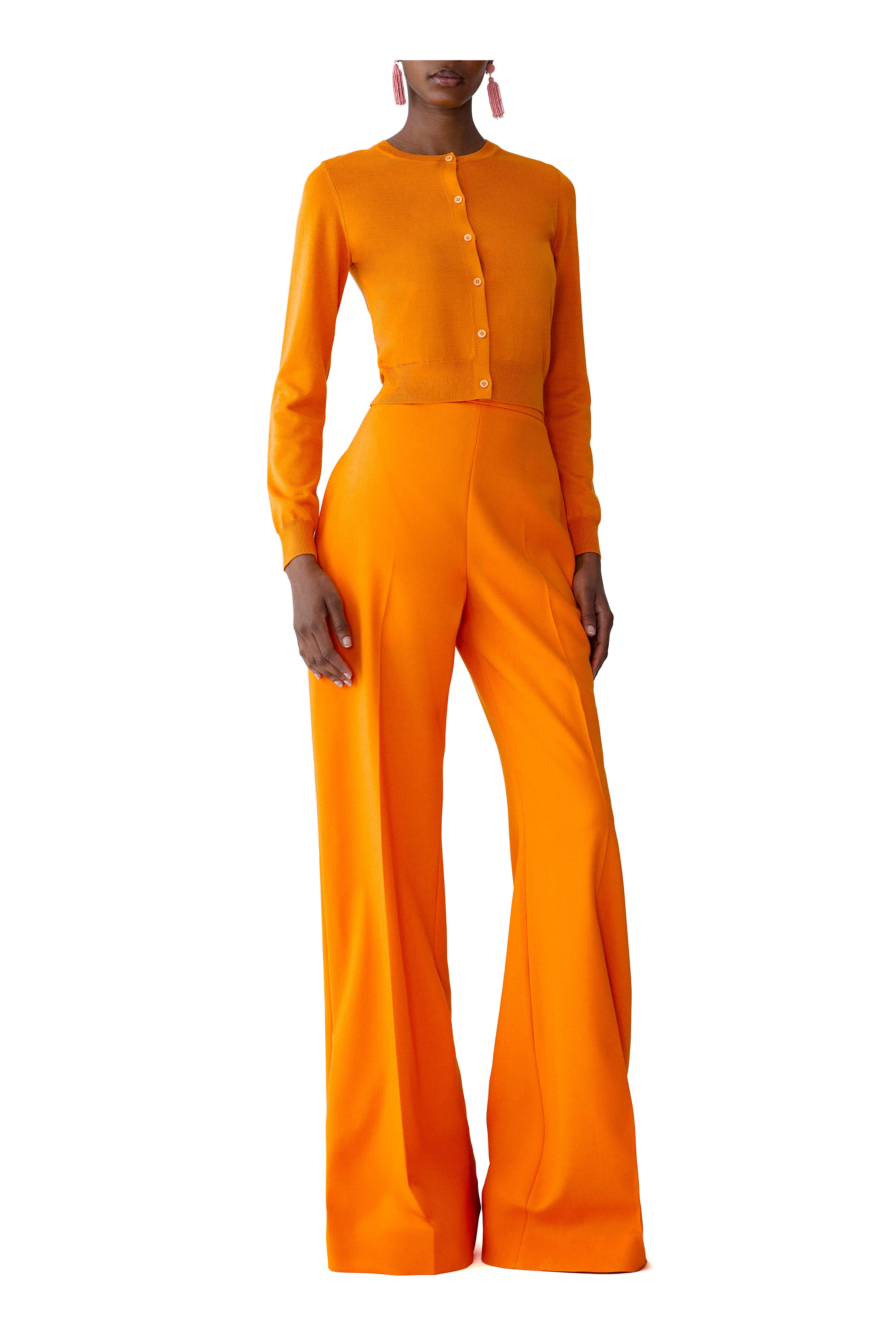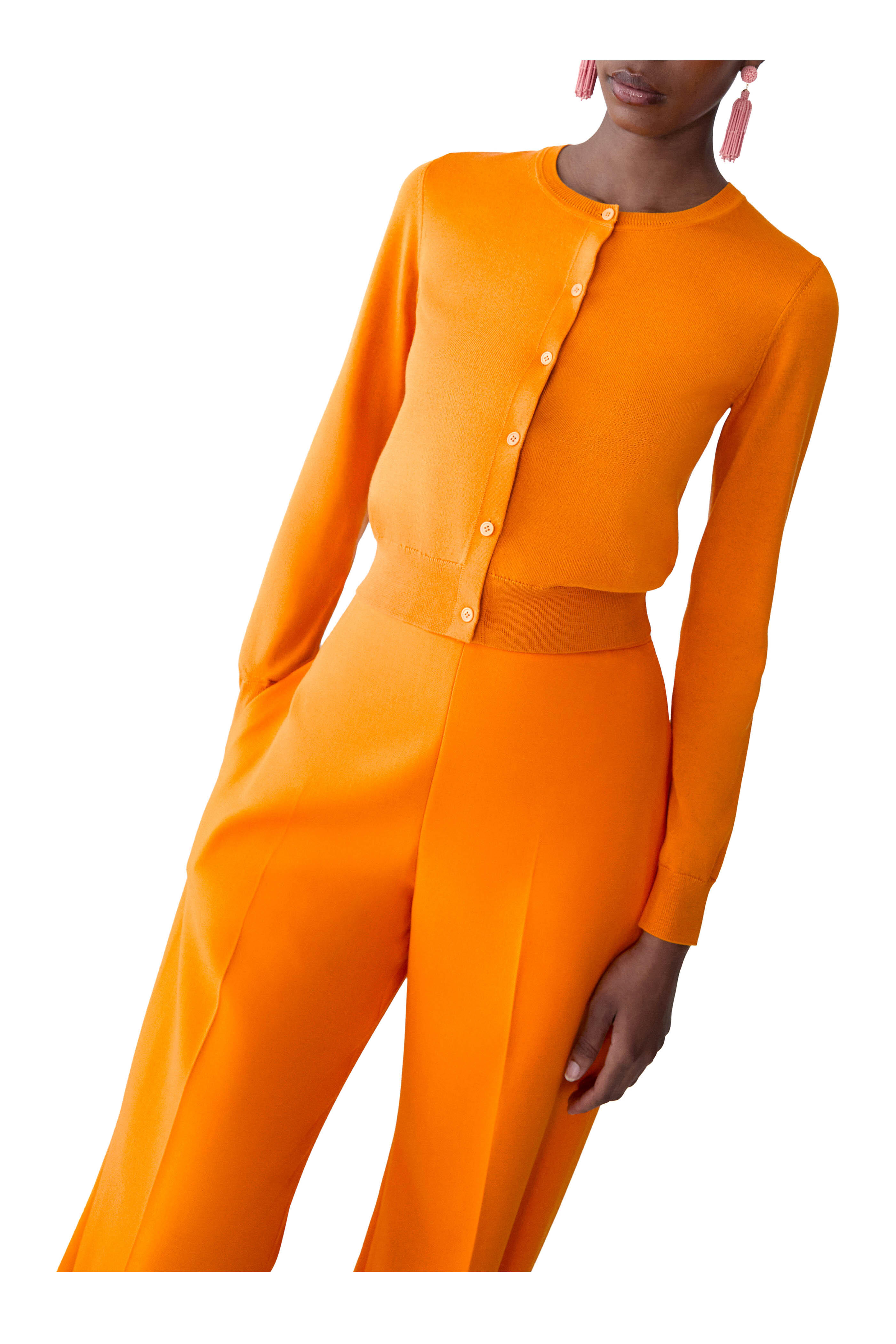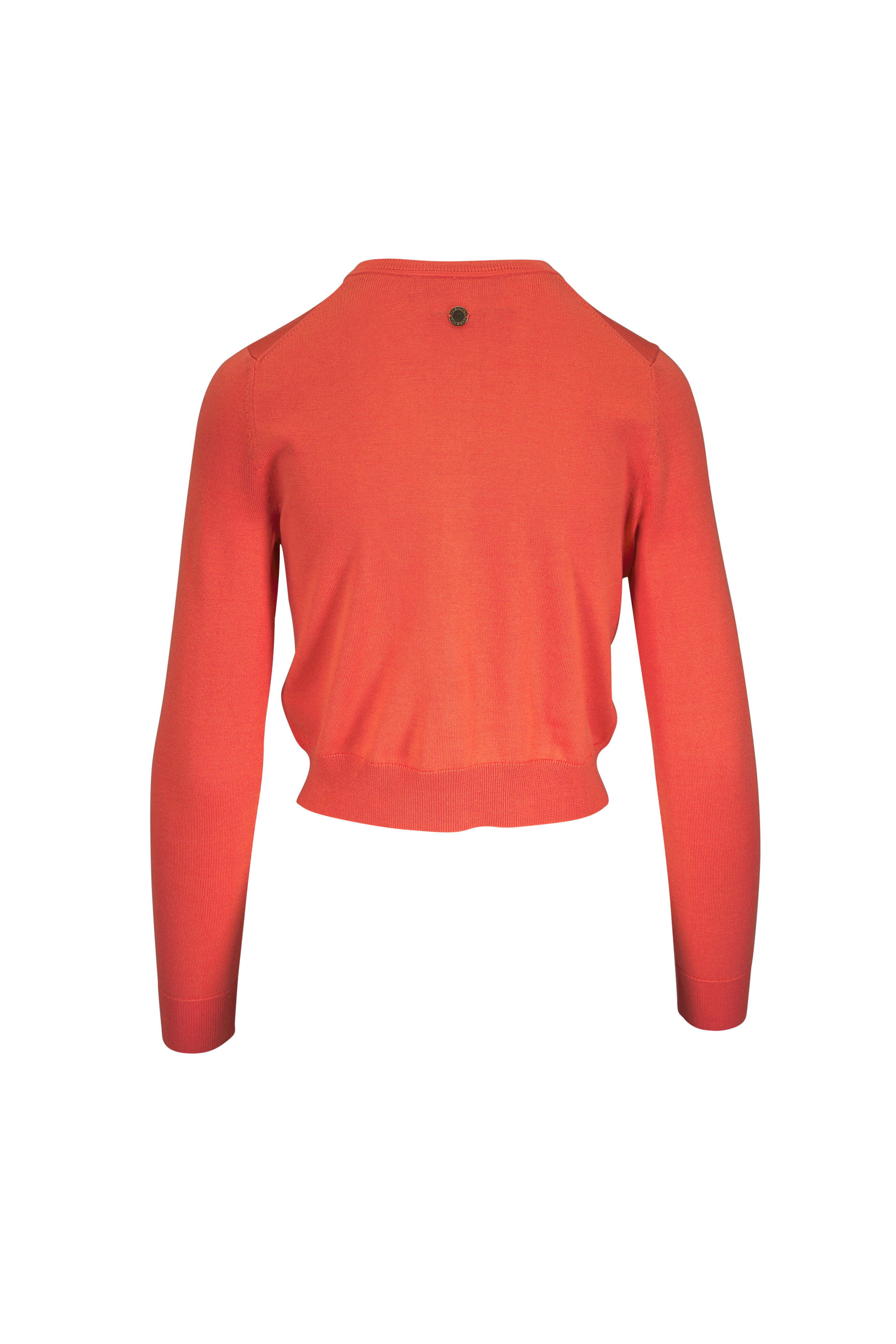 Crew neckline. Front button placket. Ribbed trims. Imported. 55% silk, 45% cotton. Dry clean.