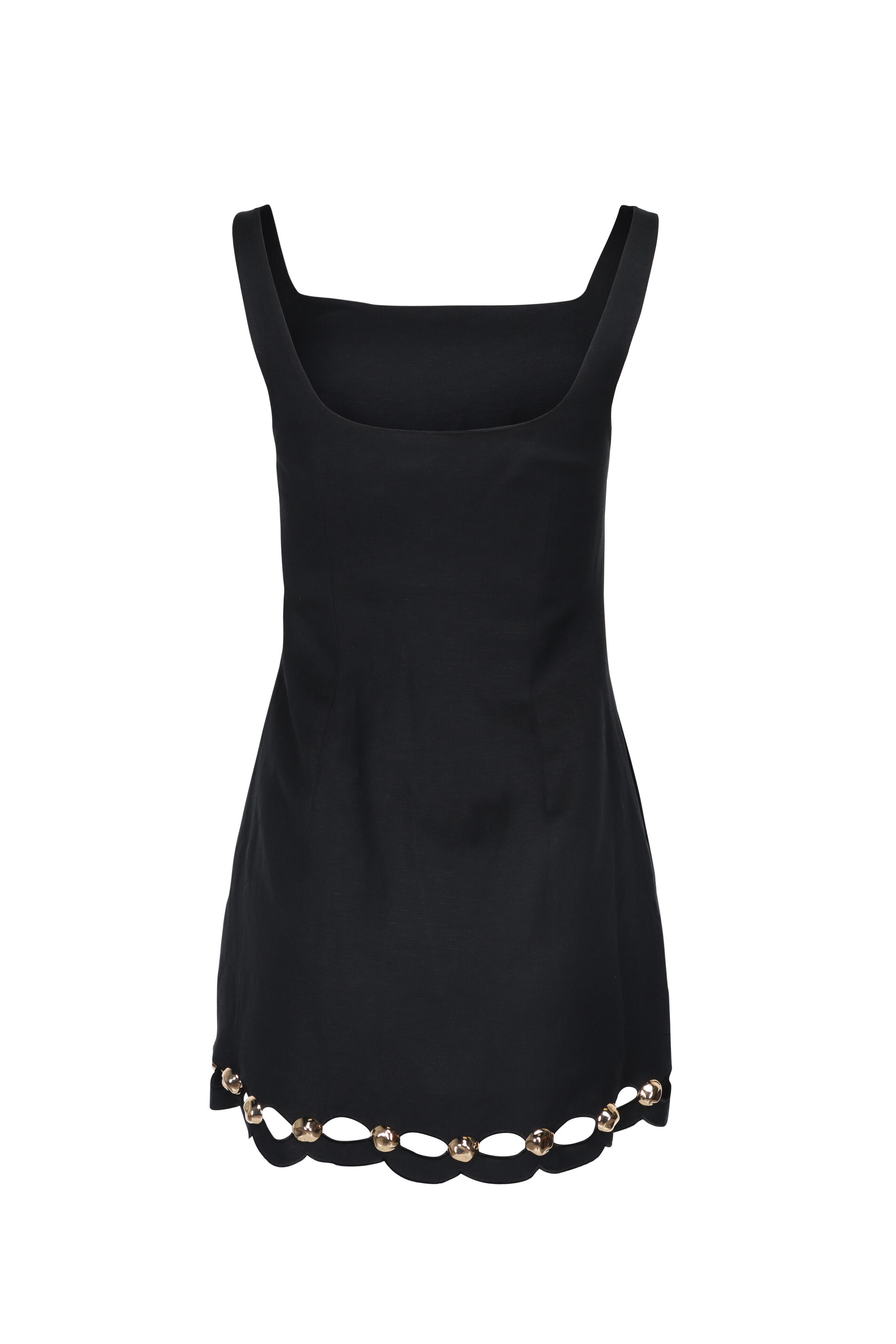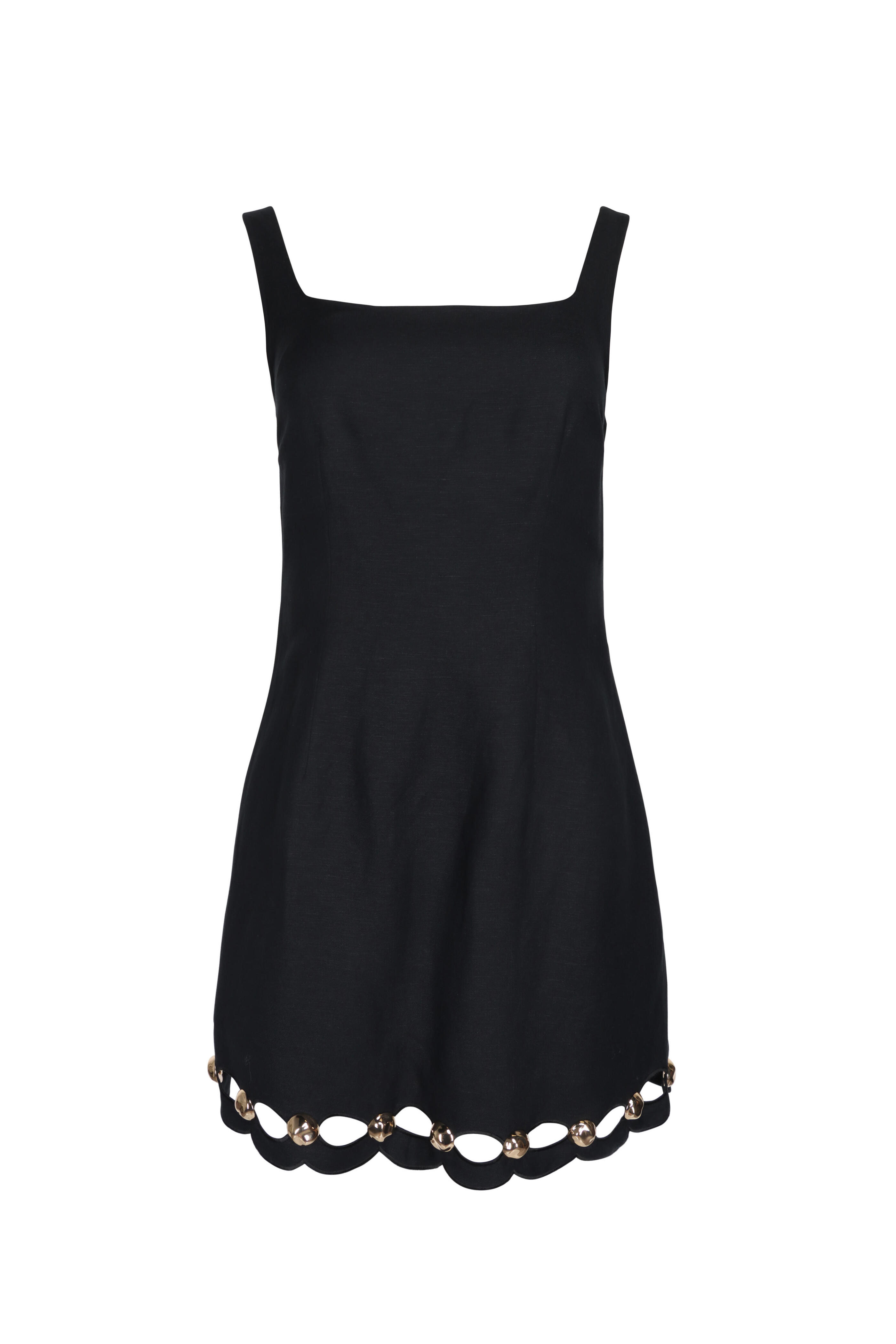 Scoop neck. Scoop back. Sleeveless. Concealed side zip closure. Side slip pockets. Slim silhouette. Cutout detail; gold tone hardware. Imported. Mini length. 55% linen, 45% viscose outer, 100% cotton lining. Dry clean.