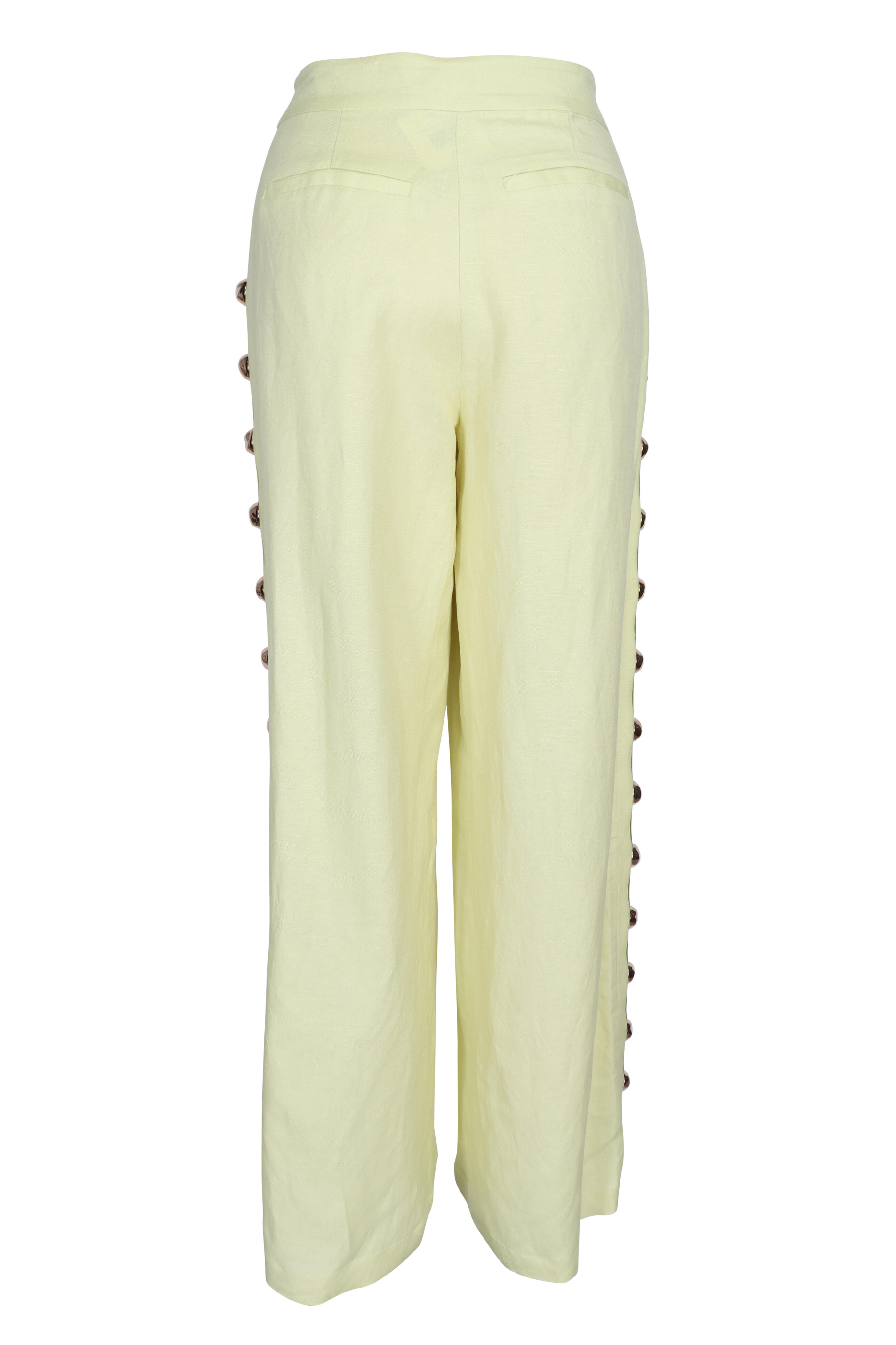 Mid rise. Hook and eye closure. Zip fly. Belt loops. Side slip pockets. Back welt pockets. Wide through leg. Cutout detail; gold tone hardware. Imported. Full length. 55% linen, 45% viscose outer, 100% cotton lining. Dry clean.
