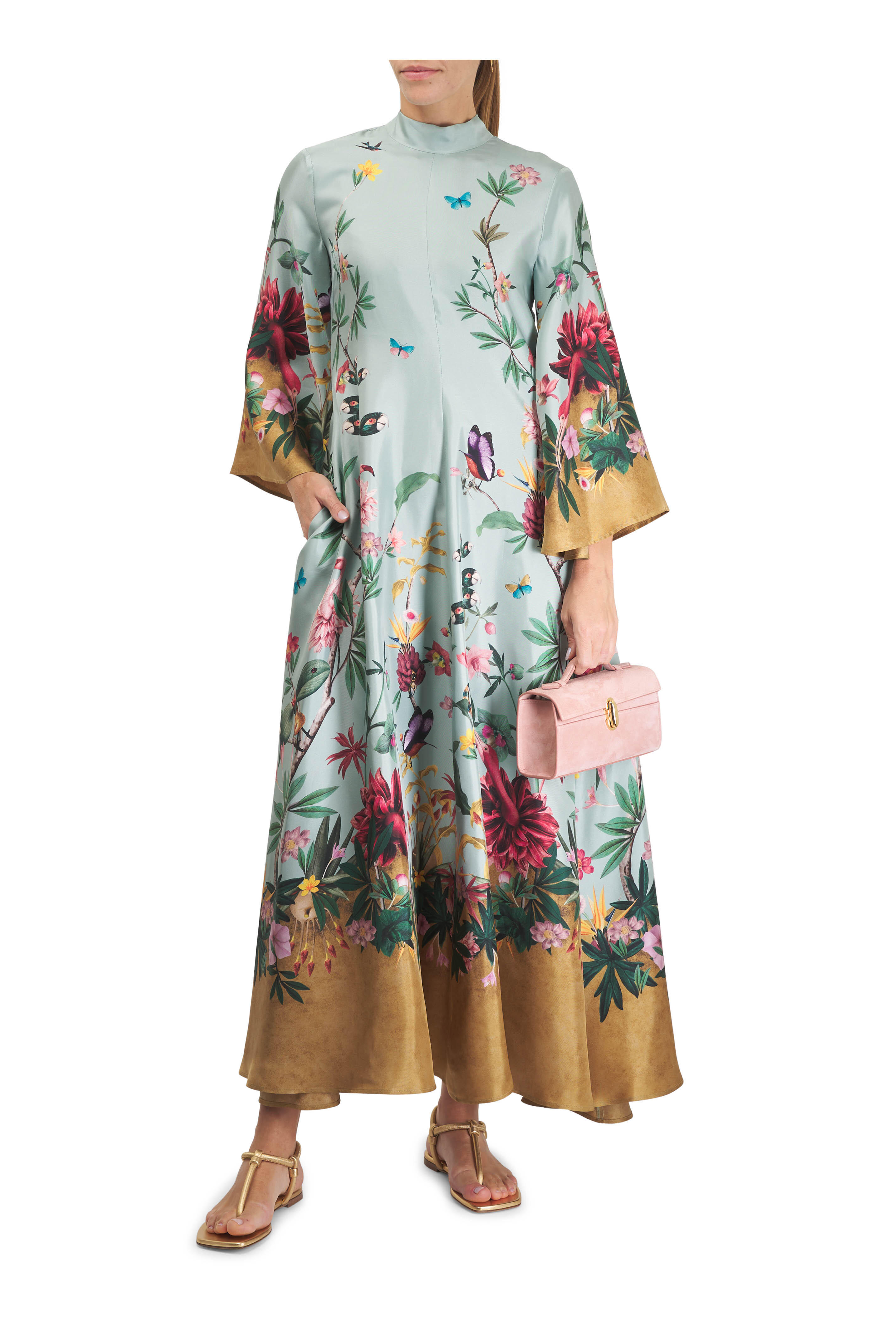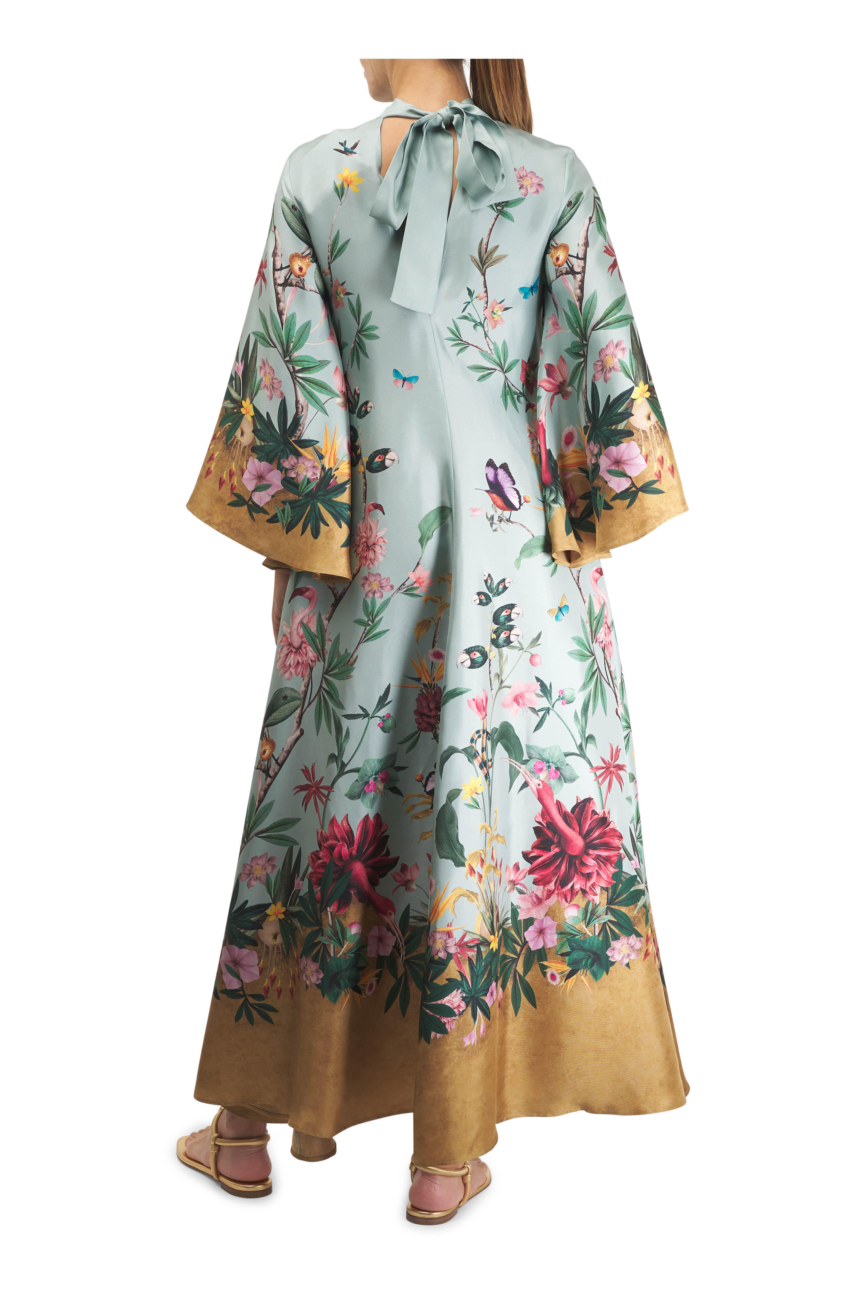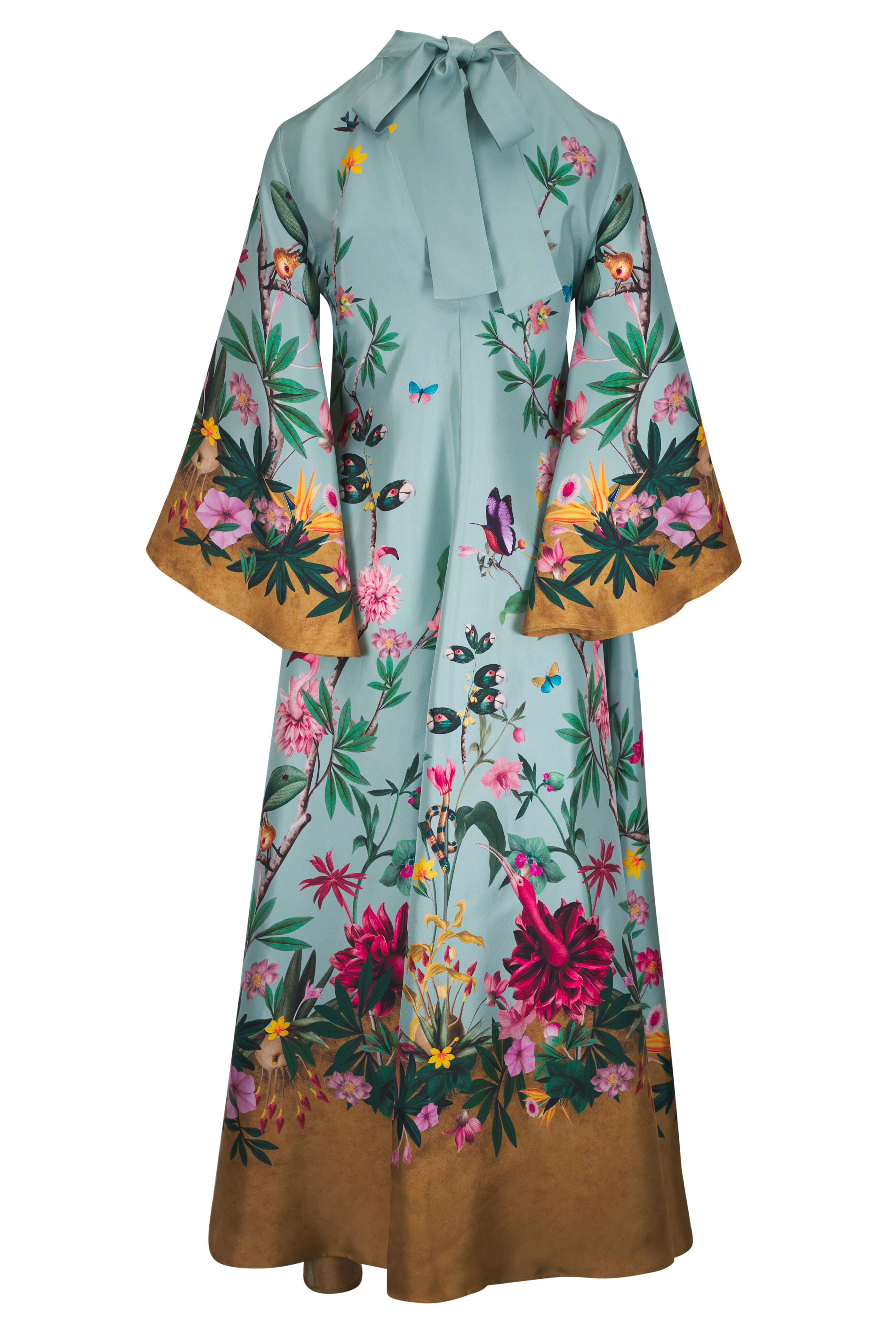 Stand collar or V-neckline; self tie sash. Waterfall sleeves. Made in Italy. 55" shoulder to hem. 100% silk. Dry clean.