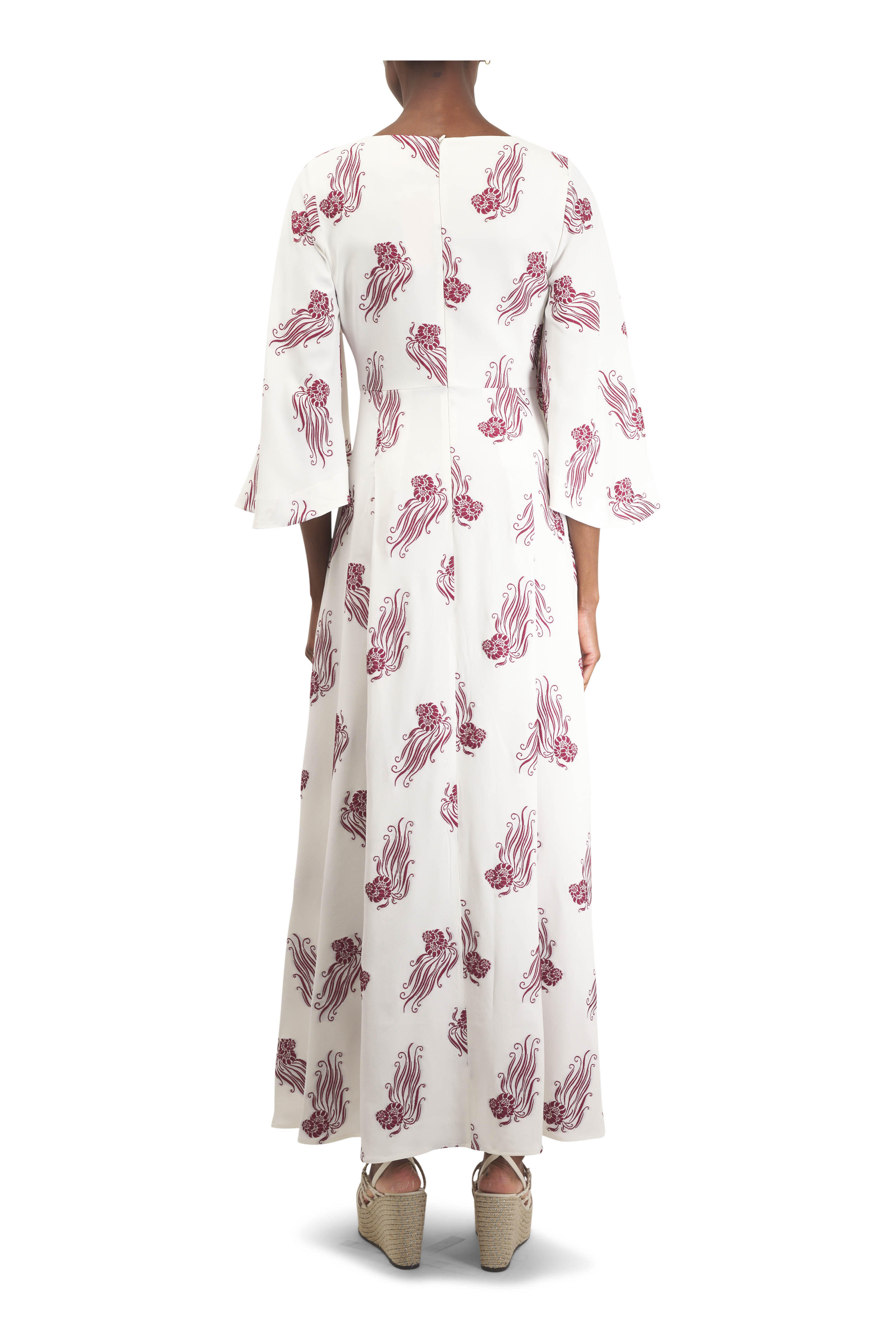 Convertible neckline; hook & eye closure. Concealed back zip. Made in Italy. 60" shoulder to hem. 67% acetate, 18% viscose, 12% polyester, 3% elastane. Dry clean.
