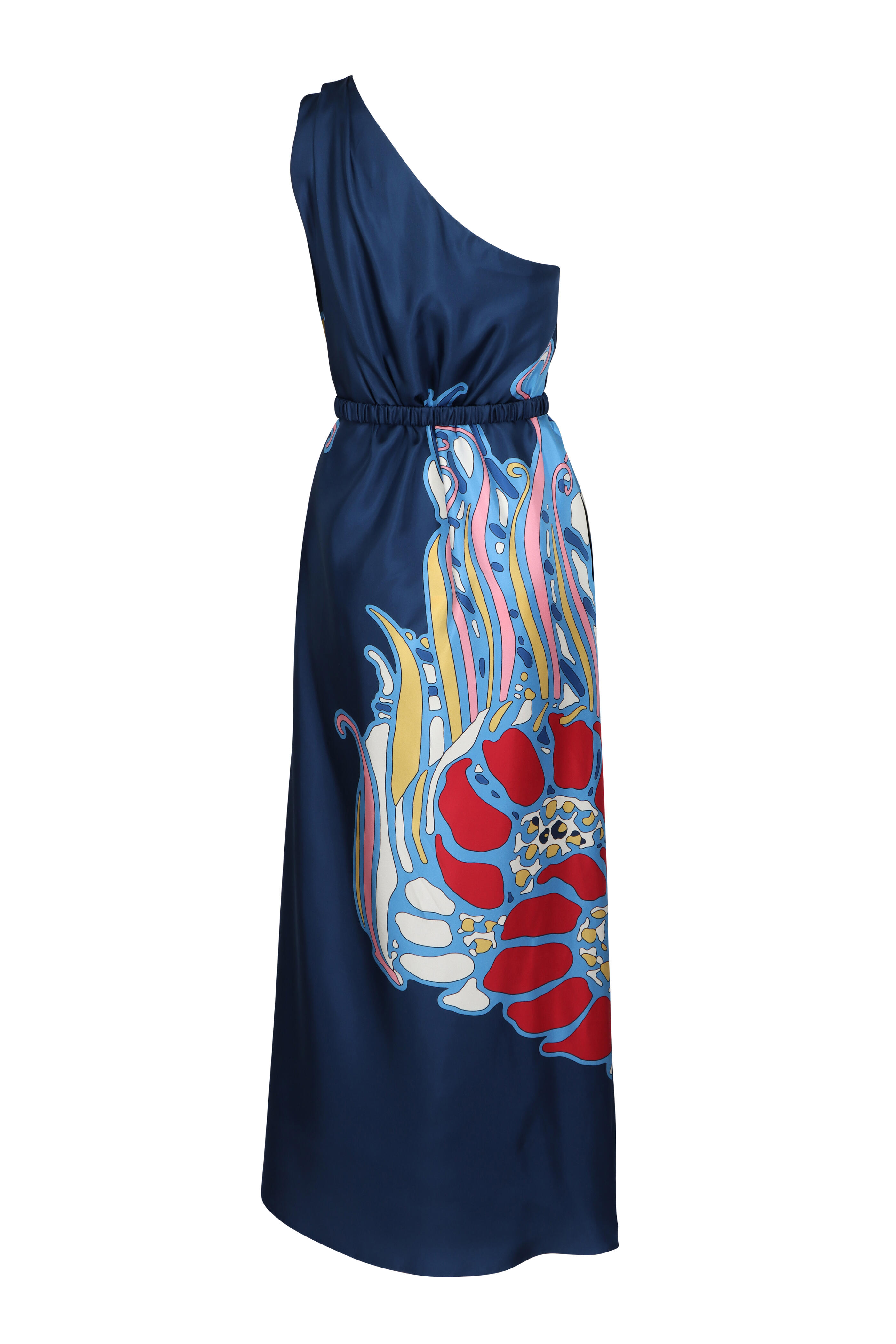 One shoulder neckline. Concealed side zip. Side slip pockets. Removable belt. Imported. 58" shoulder to hem. 100% silk. Dry clean.