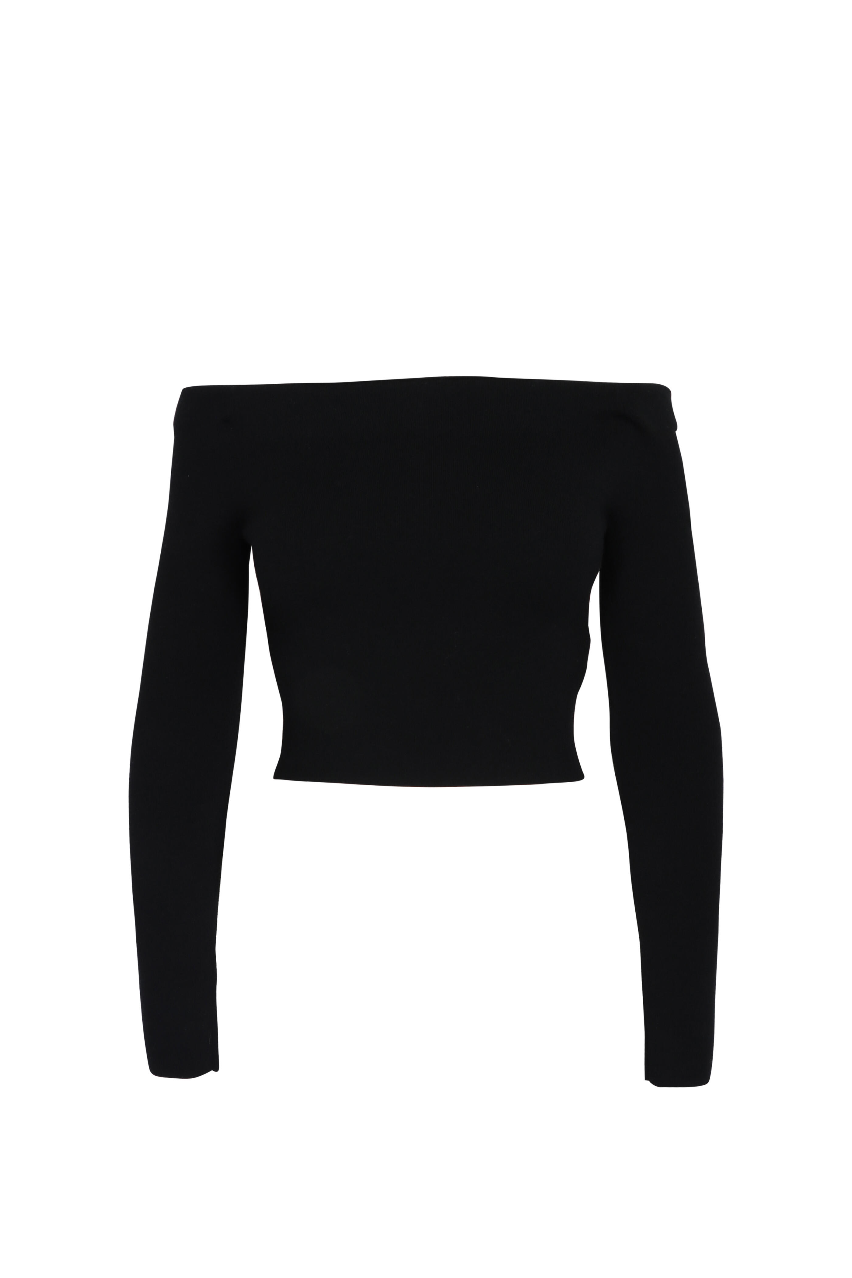 Off the shoulder neckline. Long sleeves. Slim silhouette. Stretch knit fabrication. Imported. Cropped length. Bust 27” (Size S). Waist 23.5” (Size S). Length 18.125” (Size S). 87% merino wool, 13% polyester. Dry clean.