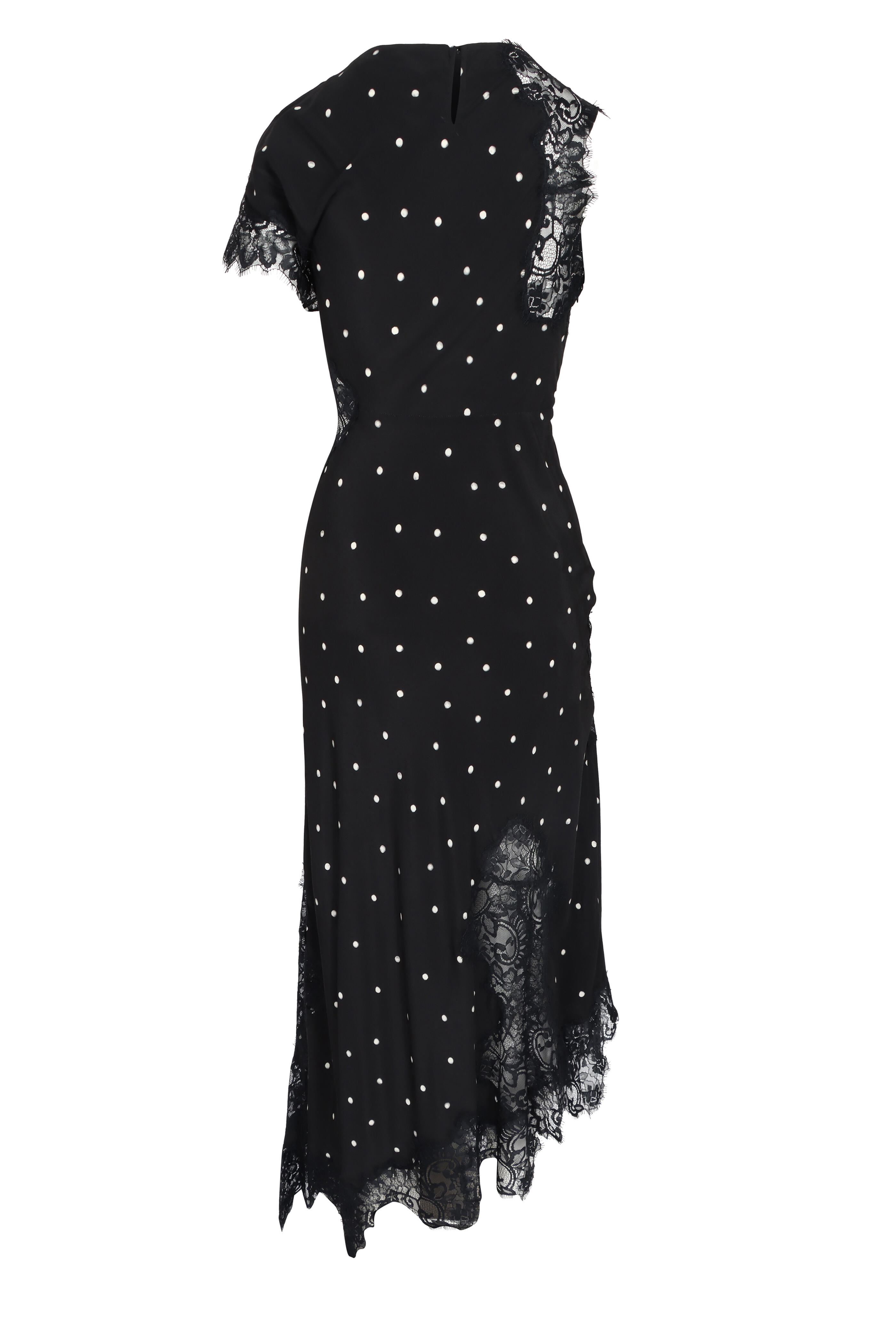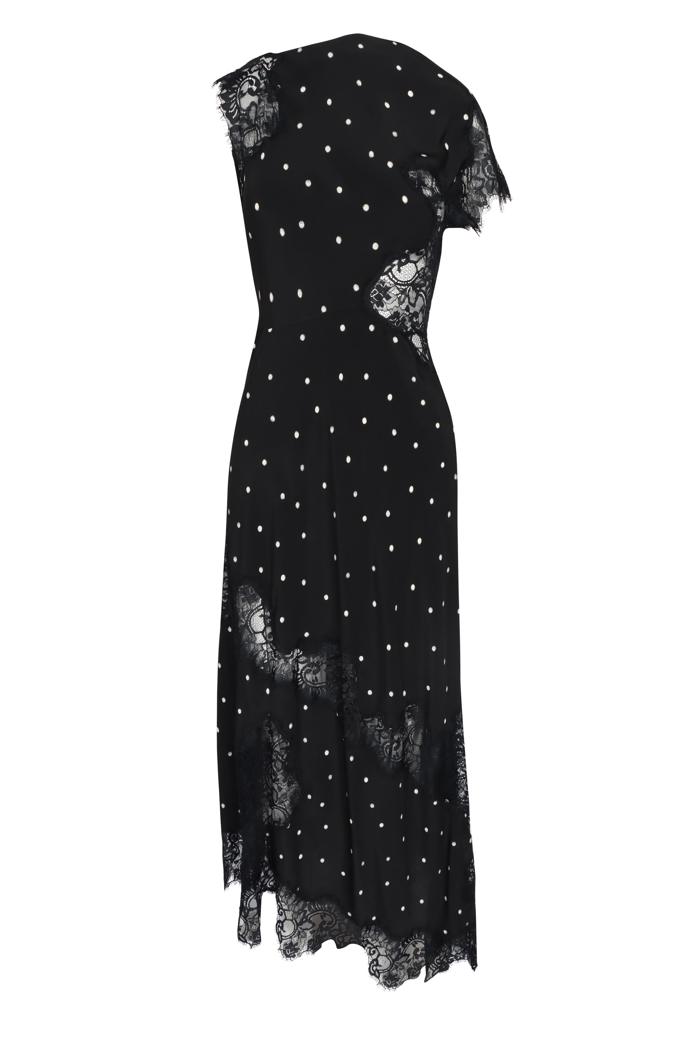 Boatneck. Button closure; keyhole detail. Single short sleeve. Slim through waist. Aline silhouette. Asymmetrical hem. Lace trim detail. Imported. Bust 32” (US 4). Waist 28” (US 4). Hip 37.25” (US 4). Maxi length. 100% viscose outer 1, 100% nylon outer 2. Dry clean.