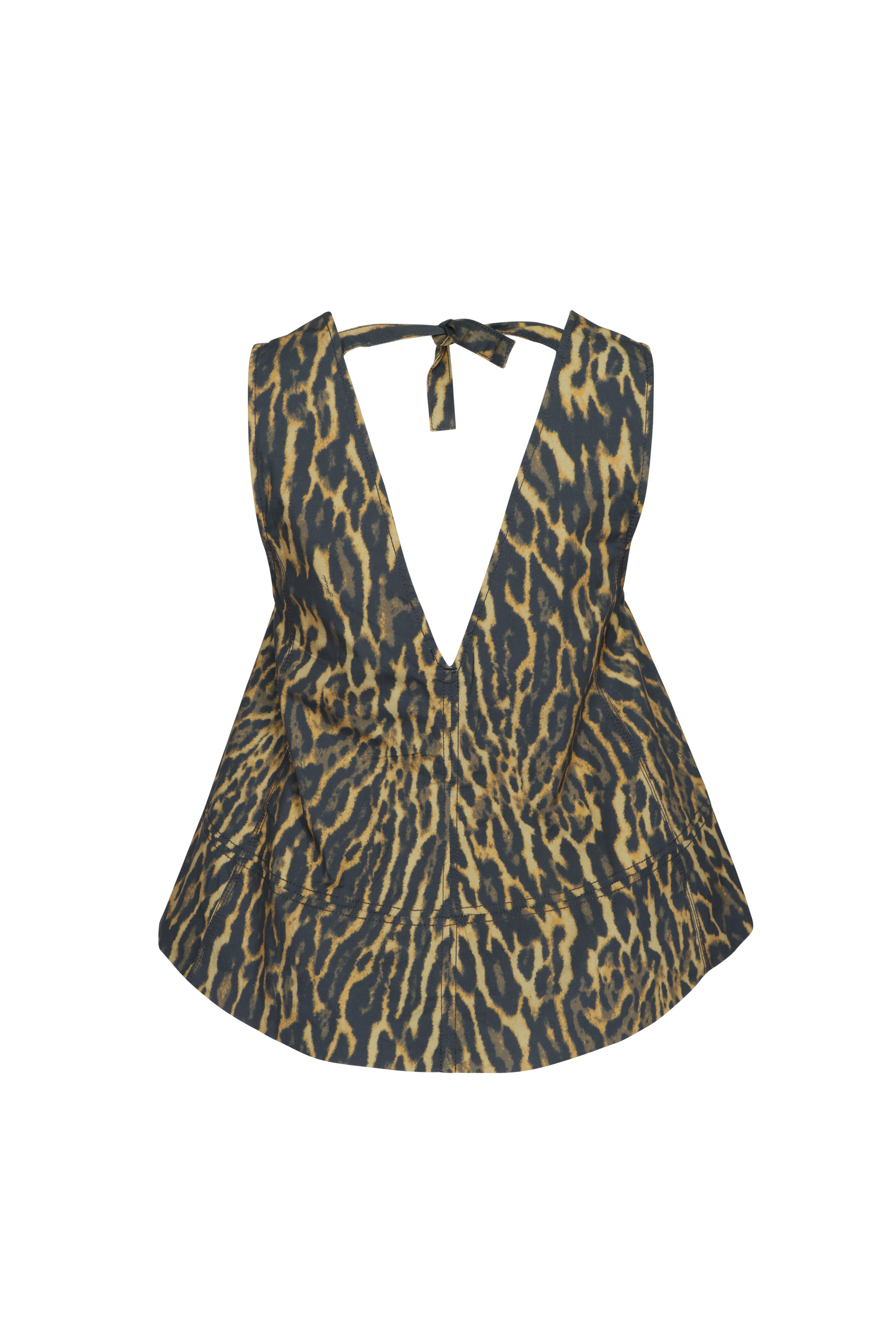 V neck. V back; self-tie closure. Sleeveless. Aline silhouette. Imported. 97% organic cotton, 3% elastane. Dry clean.