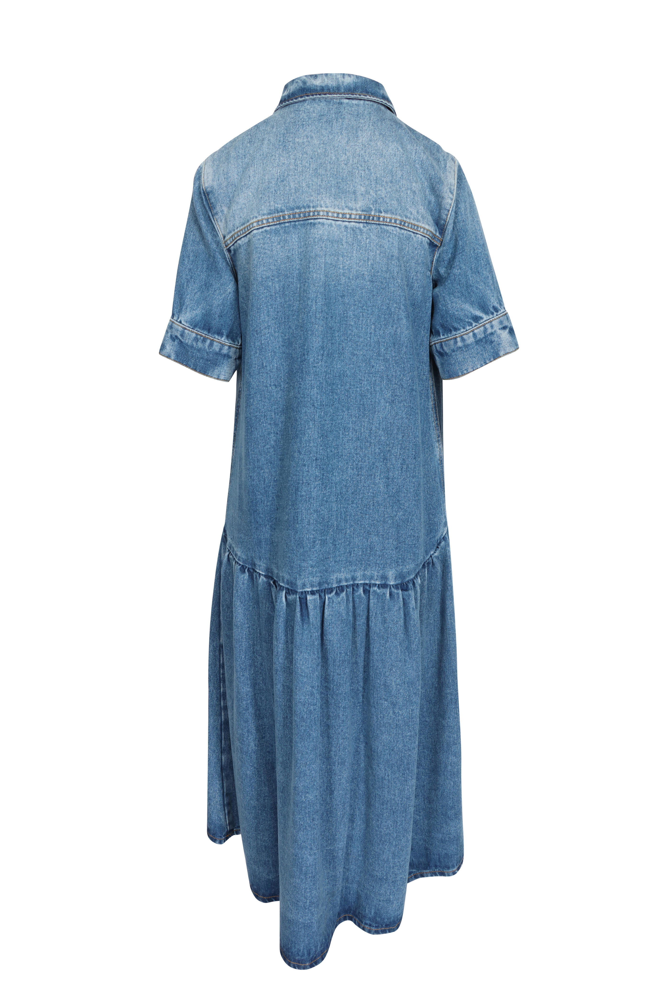 Collar. Short sleeves. Quarter button placket. Chest patch pockets; button closure. Drop waist. Aline silhouette. High low hem. Denim fabrication. Imported. Midi length. 100% cotton. Machine washable.