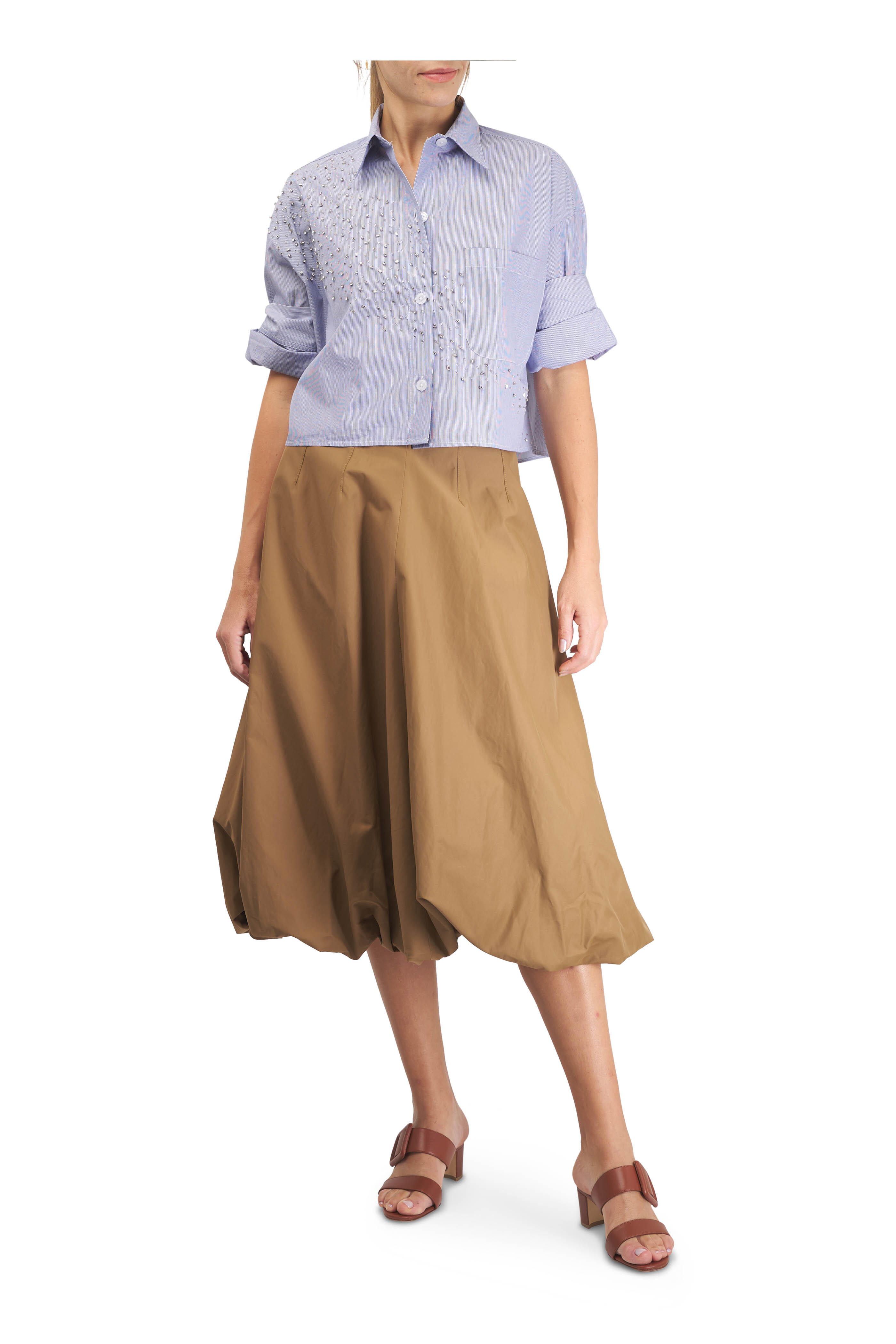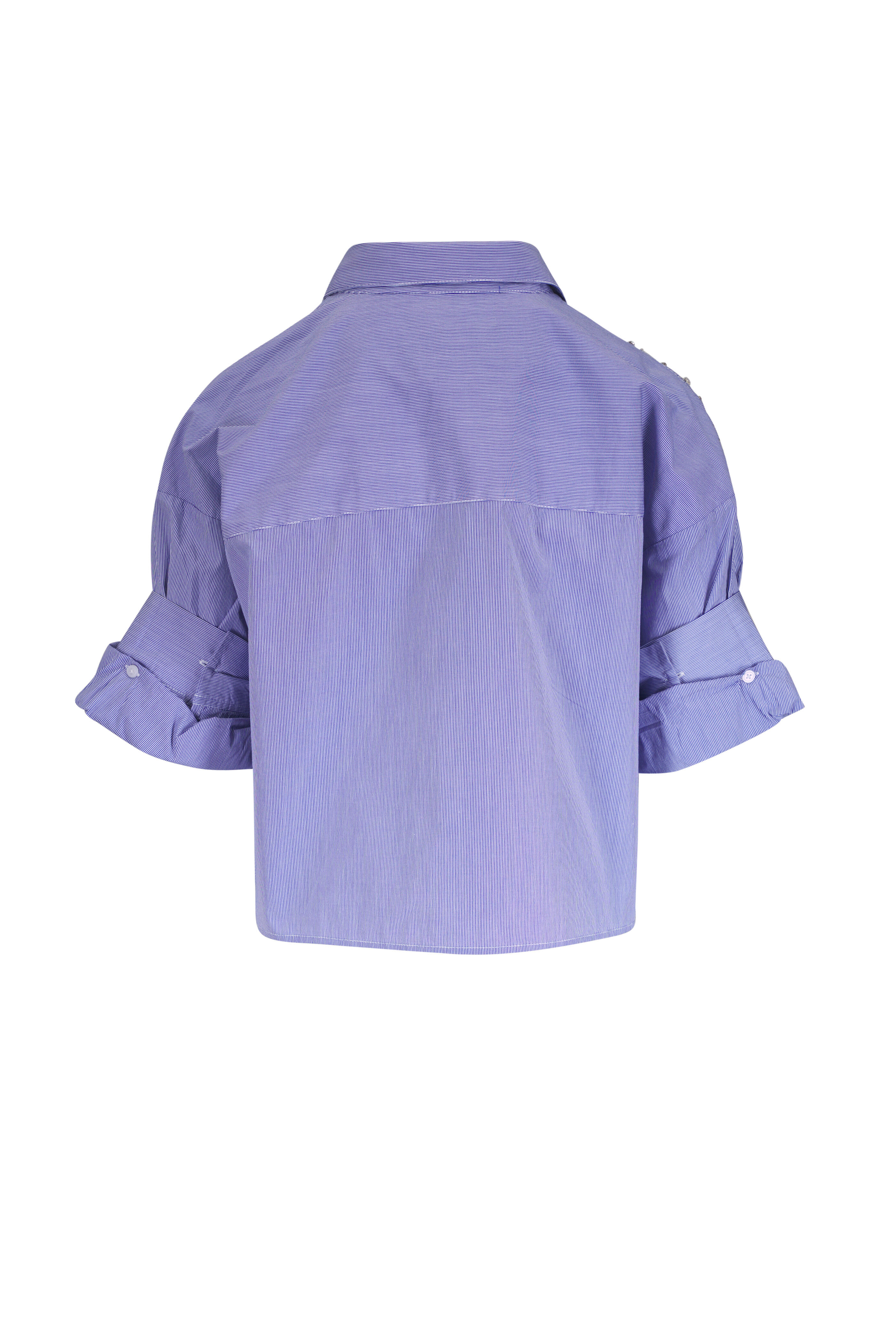 Spread collar. Front button placket. Double roll button cuffs. Chest patch pocket. Cascading crystal detailing. Imported. 100% cotton. Dry clean.