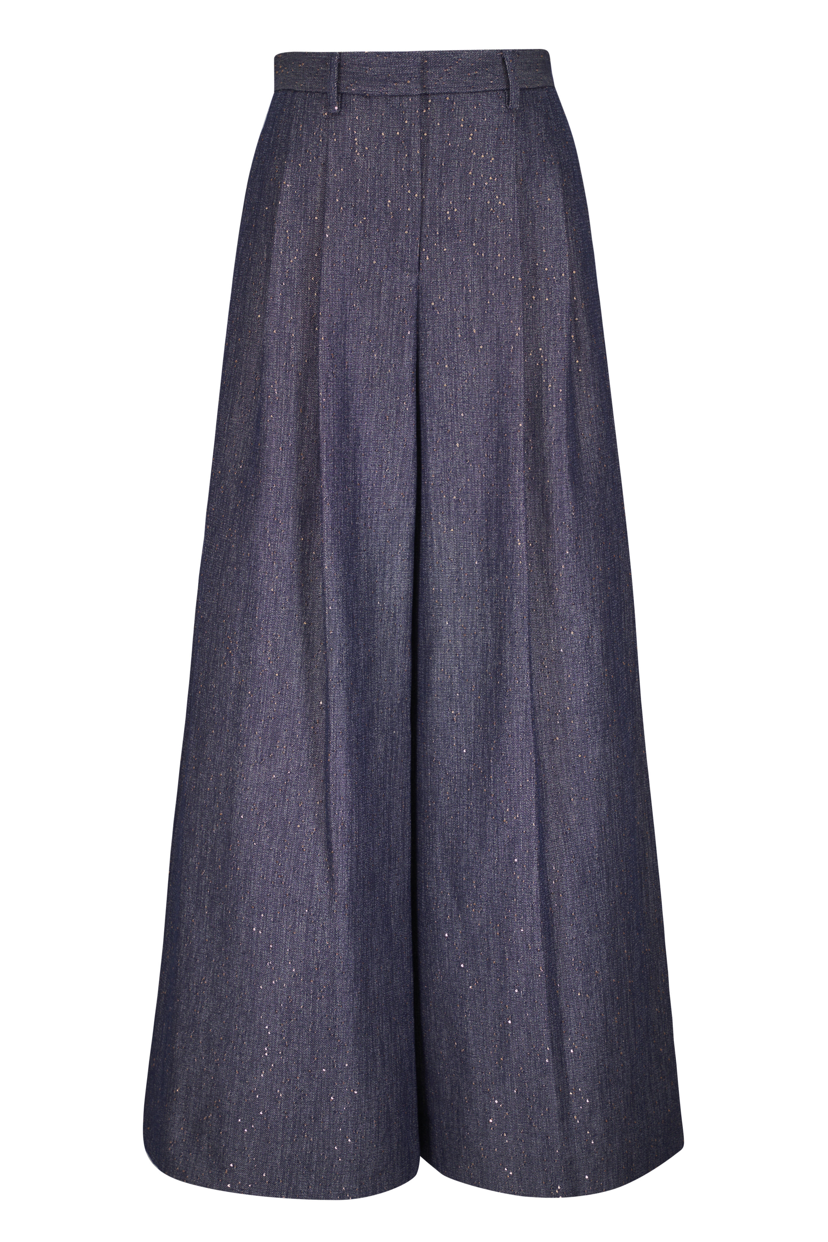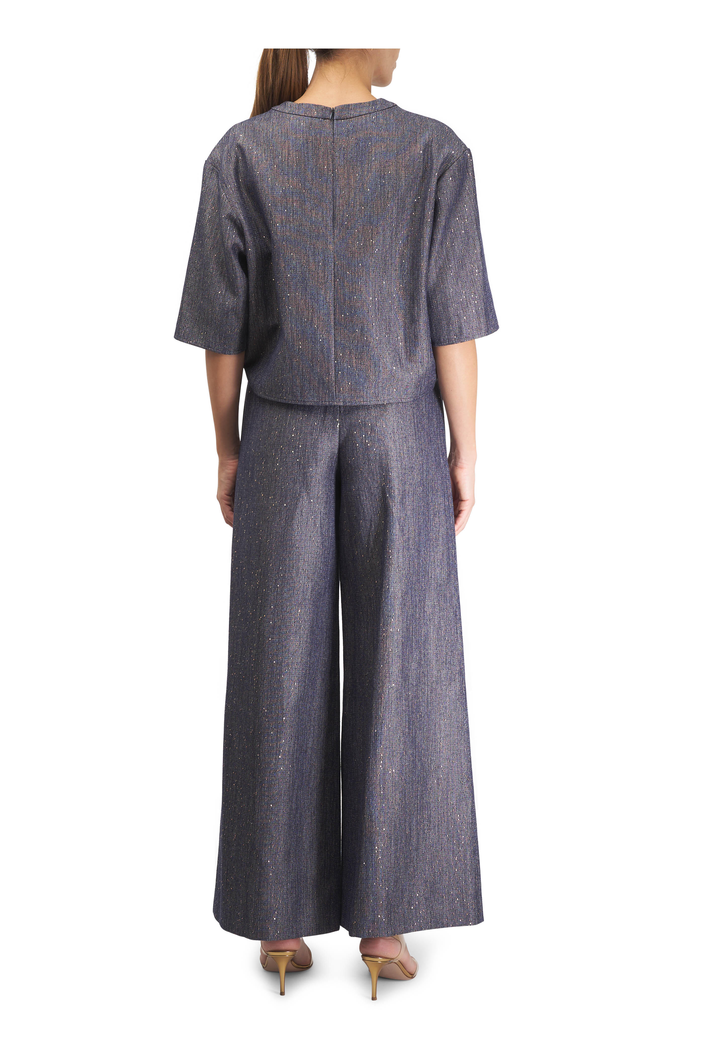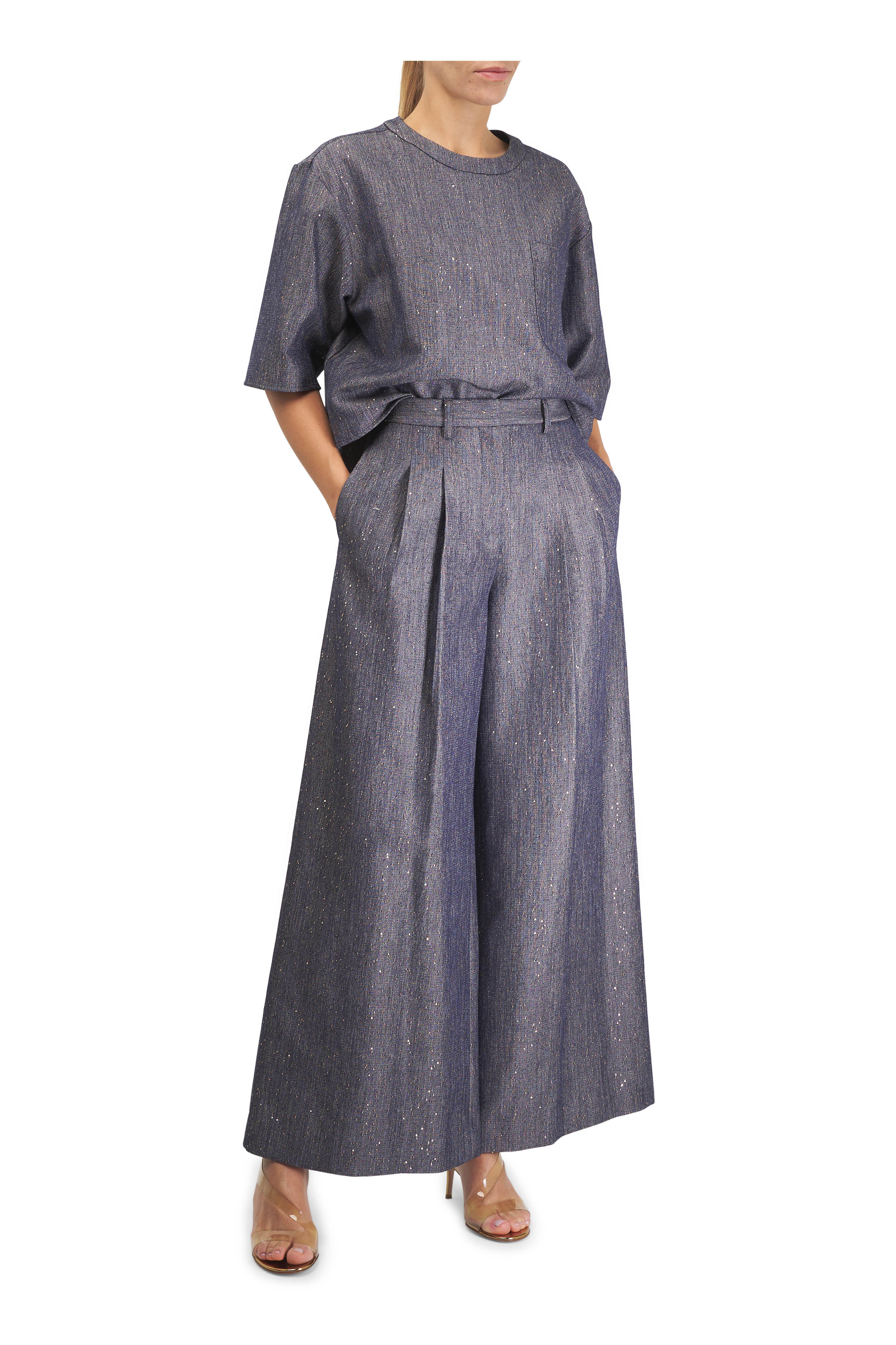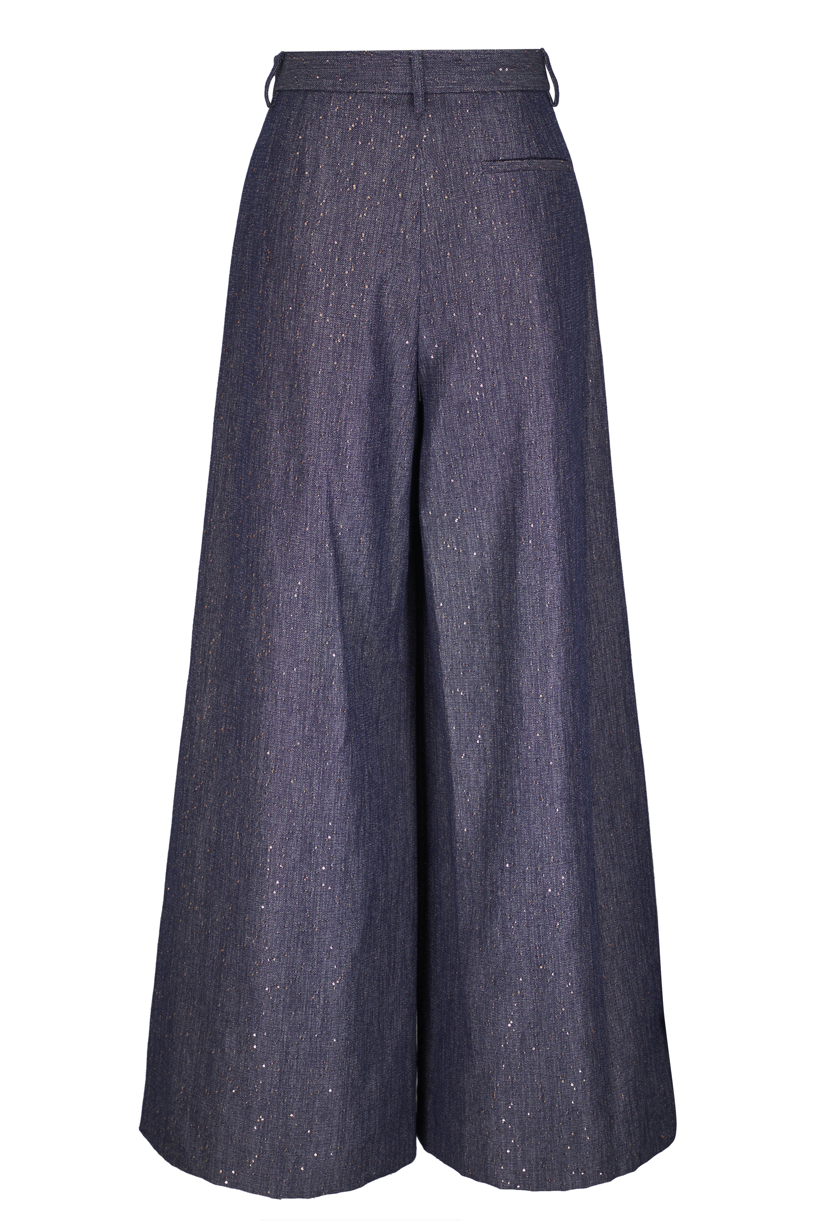 Zip fly; hook and eye closure. Belt loops. Side slip pockets; single back welt pocket. Front pleat detail. Wide through leg. Made in USA. 31" Inseam (size 2). 40% cotton, 38% polyester, 16% linen, 6% viscose. Dry clean.