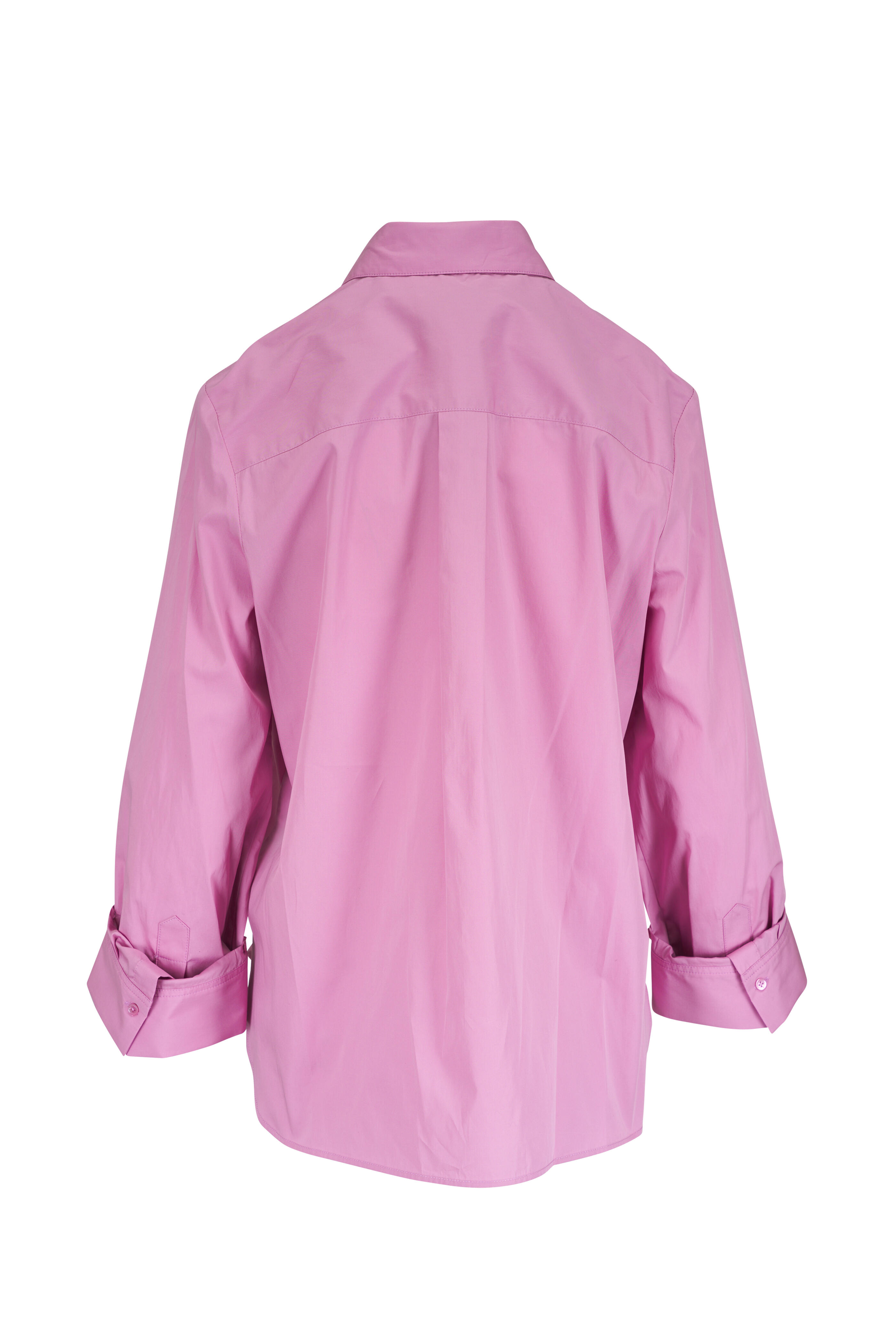 Spread collar. Front button placket. Chest patch pocket. Single roll button cuffs. Center box pleat at the back. Rounded hem. Made in the USA. Approximately 27" shoulder to hem (measurements taken from size XS/S). 100% cotton. Machine wash.