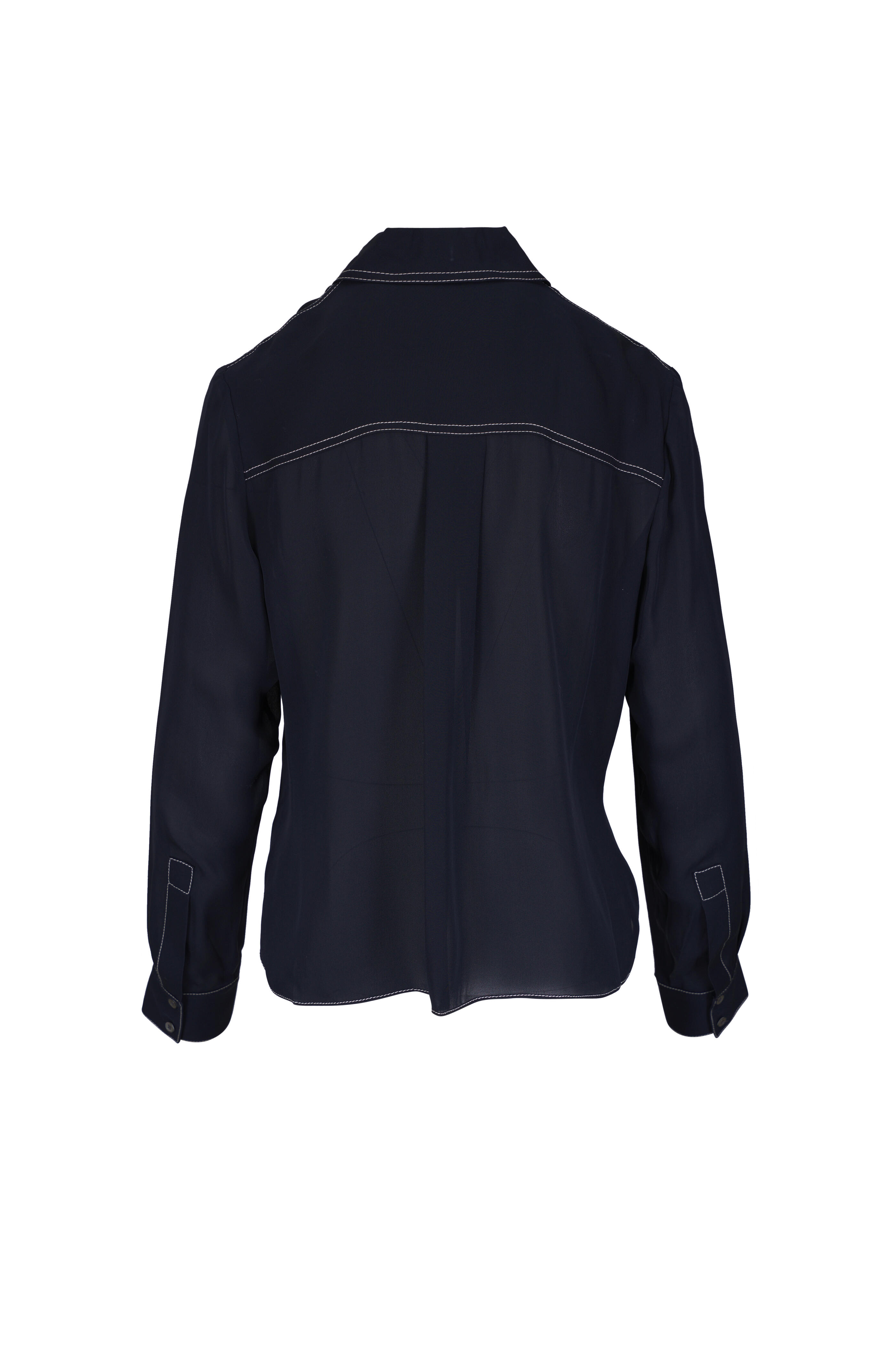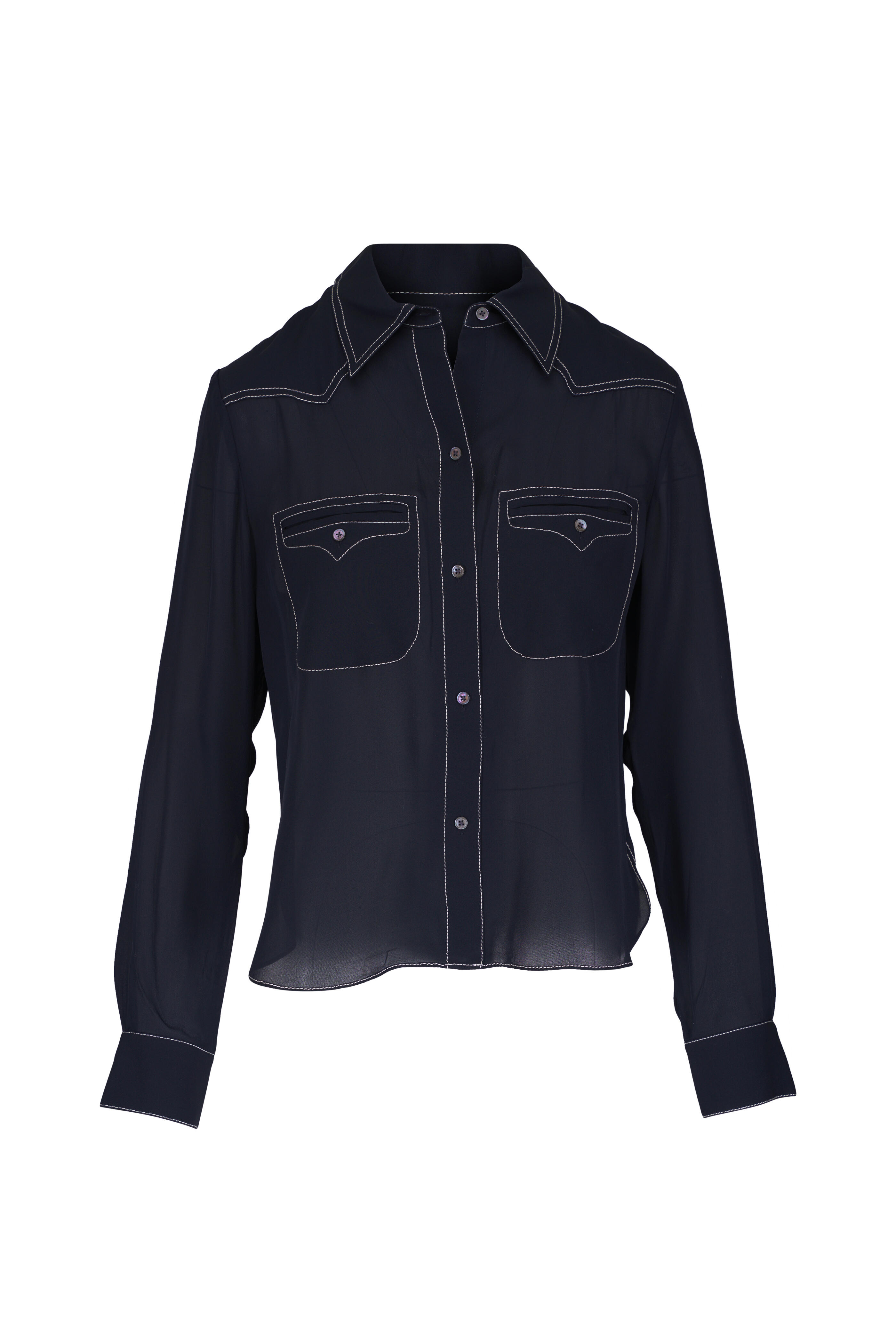 Classic shirt collar. Button-front placket. Dual flap chest pockets. Imported. 100% silk. Dry clean.