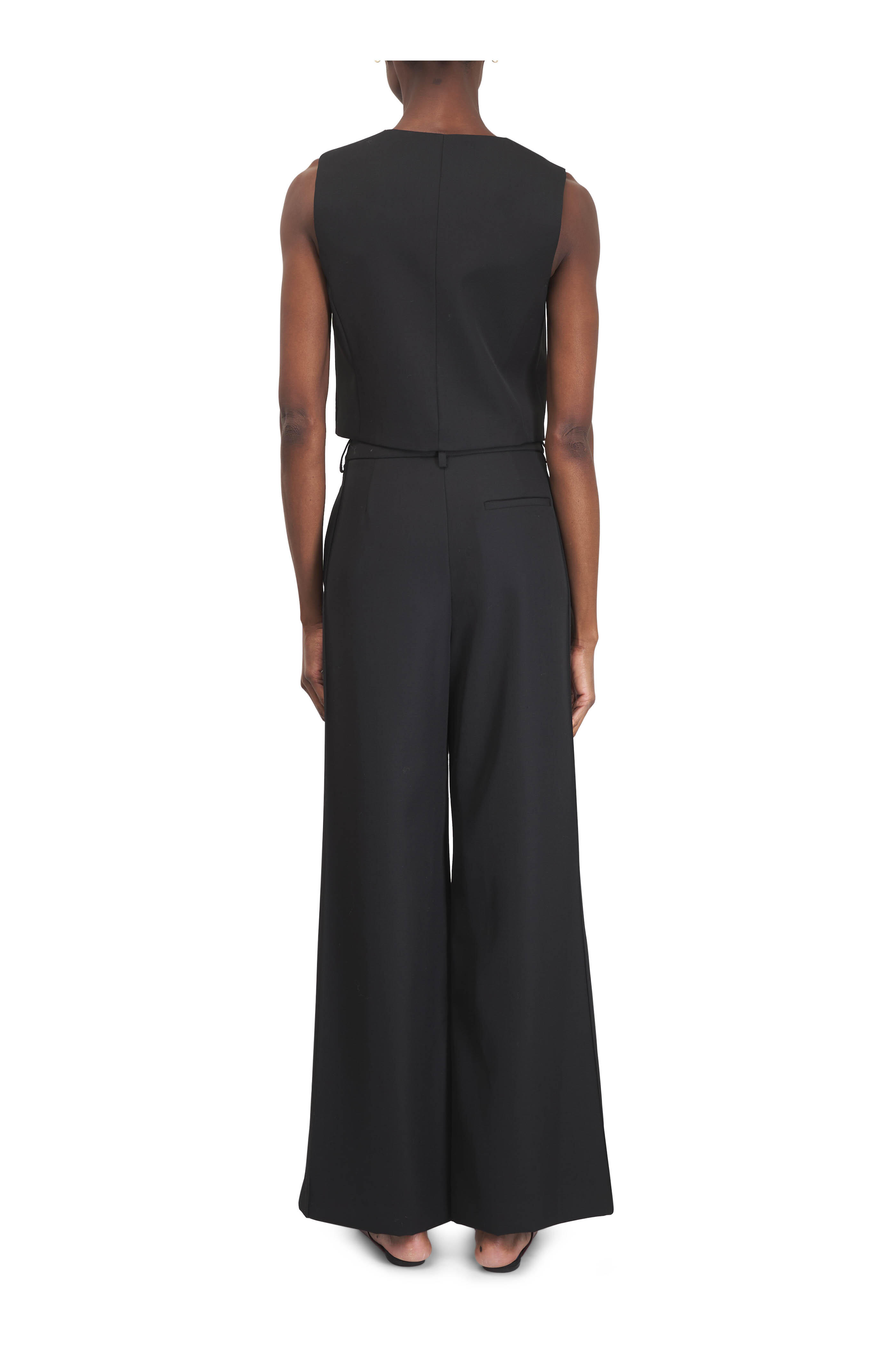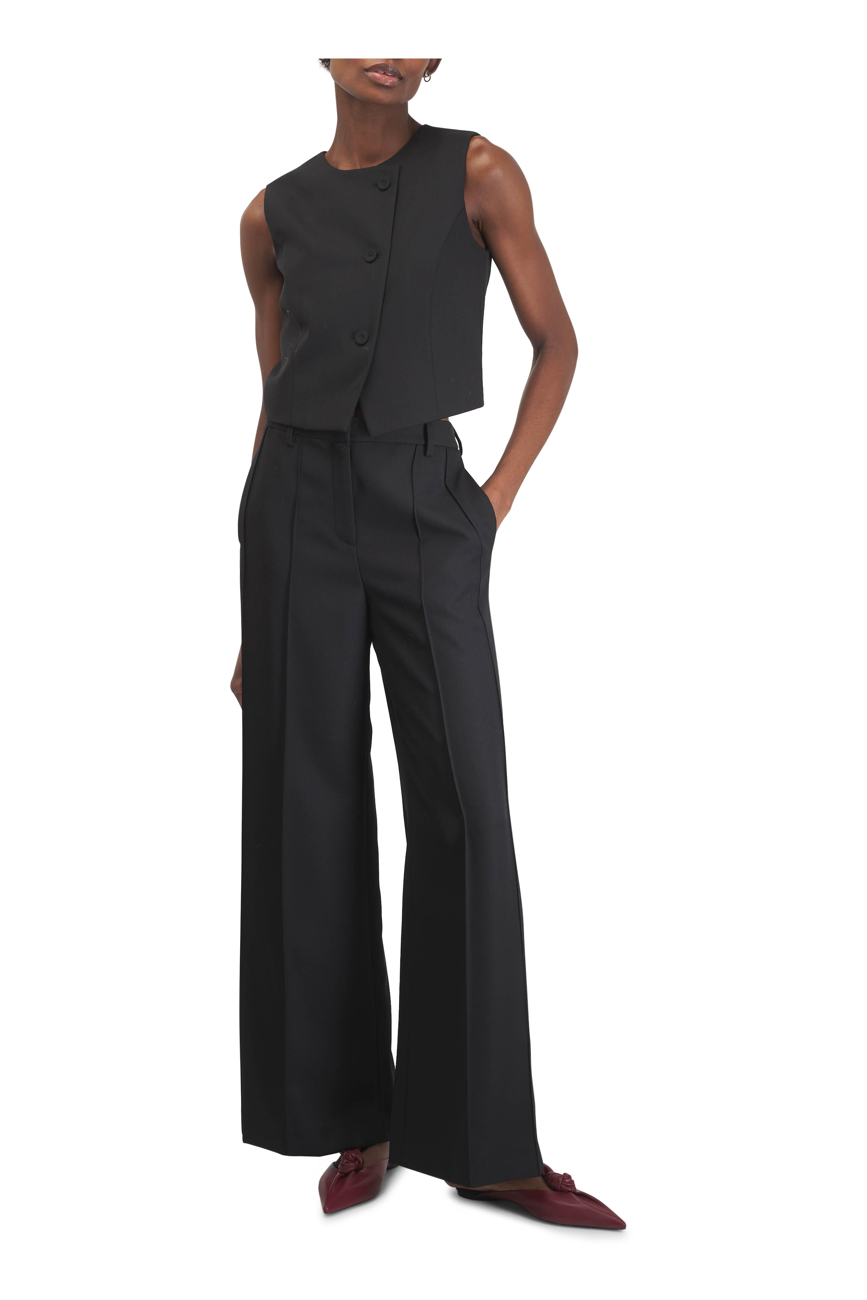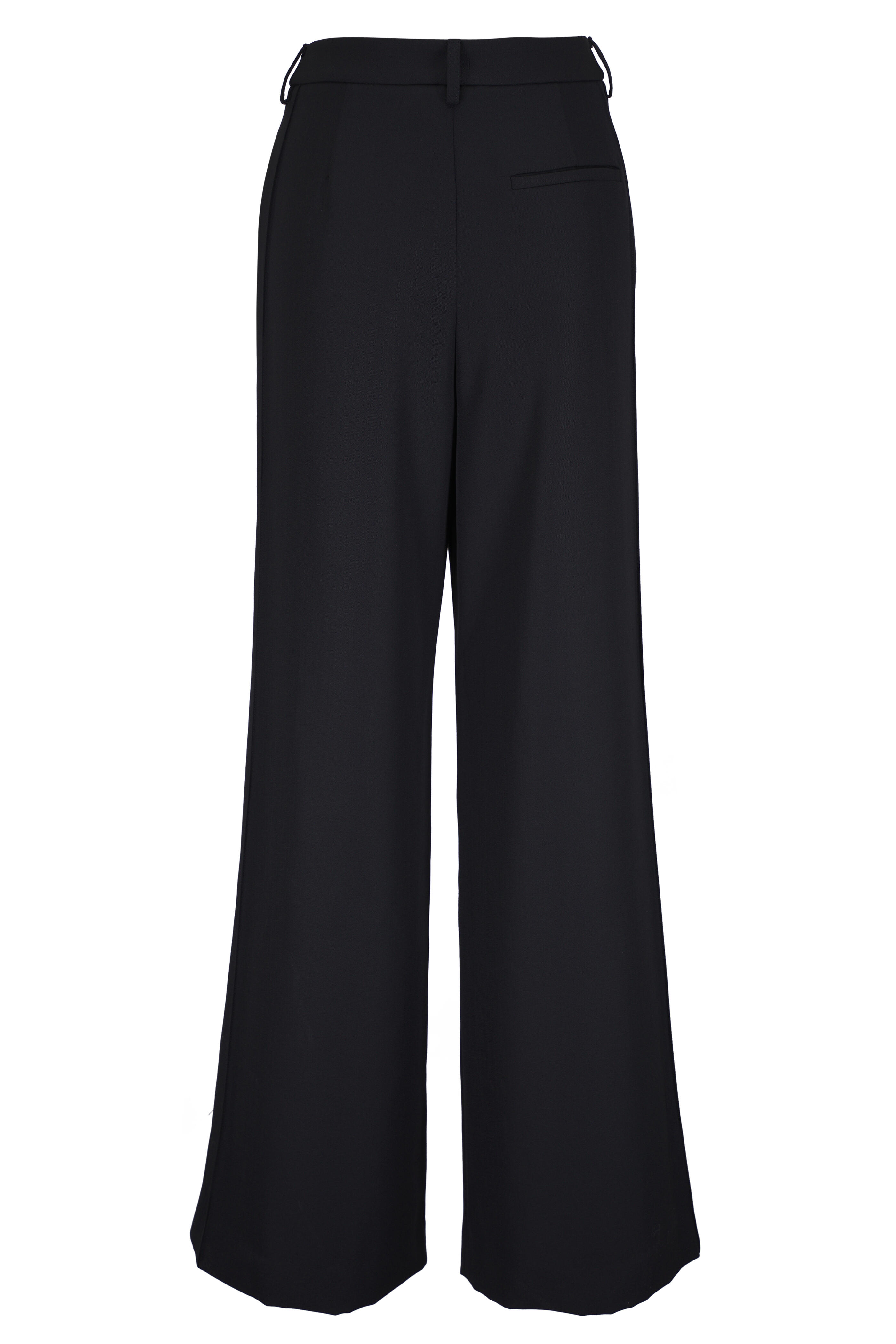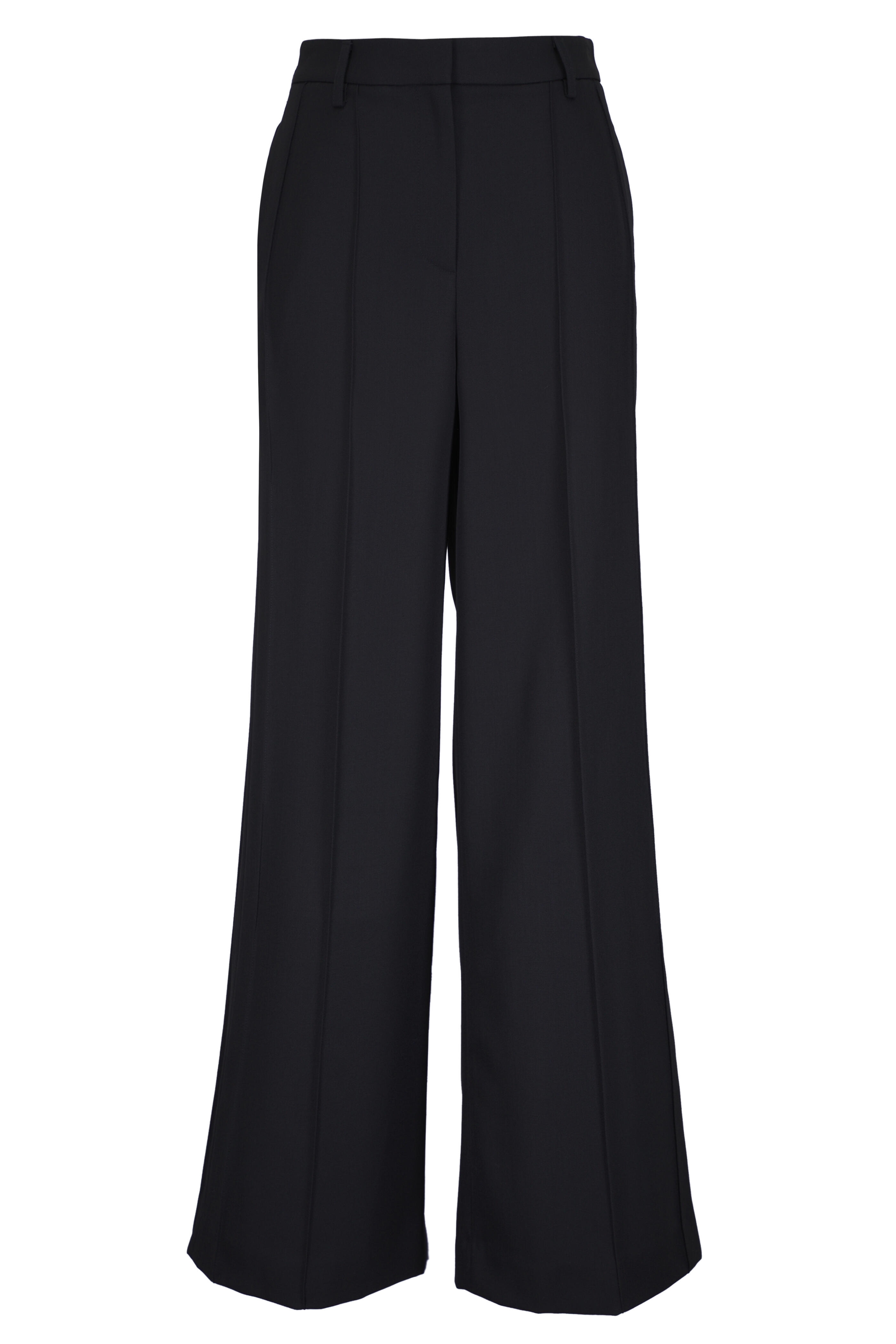 Zip fly; hook-and-bar closure. Pleated front. Side slip pocket; back right welt pocket. Straight hem. Made in the USA. 31" Inseam (size 0). 100% Virgin wool. Dry clean.