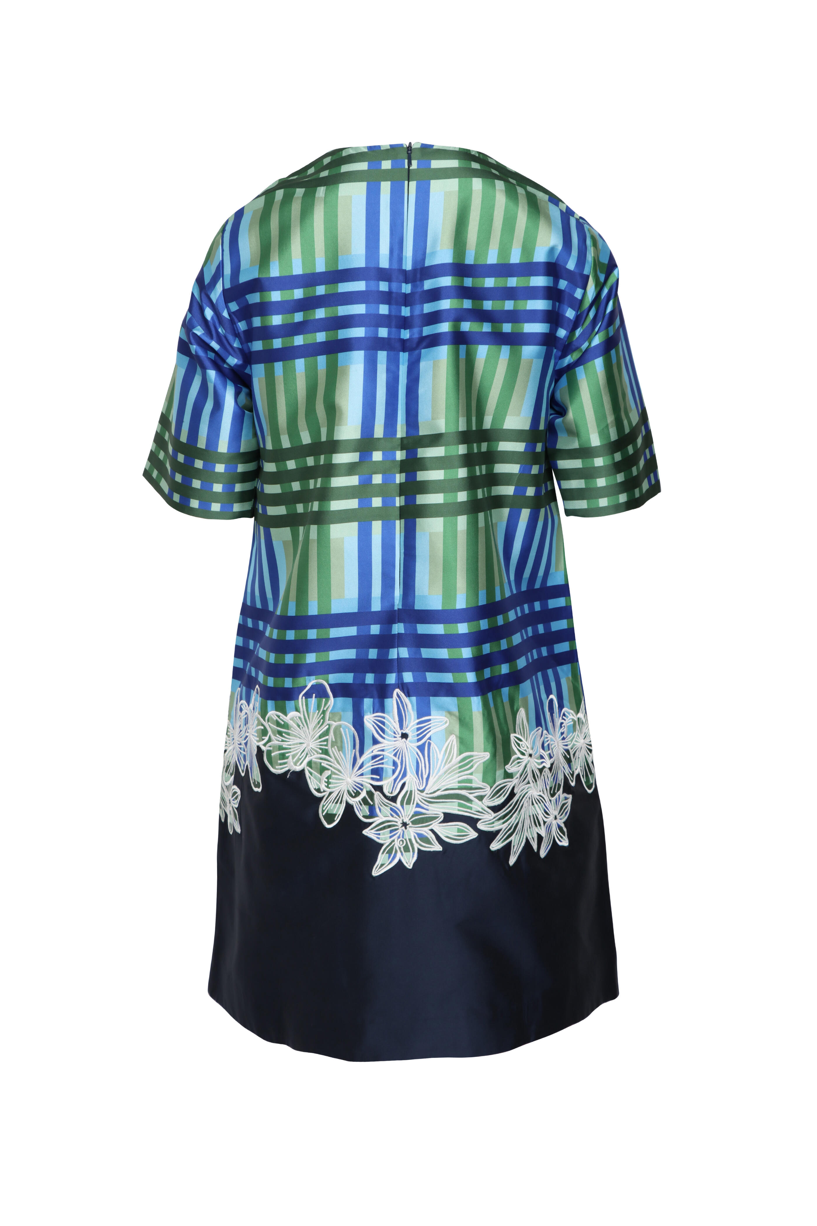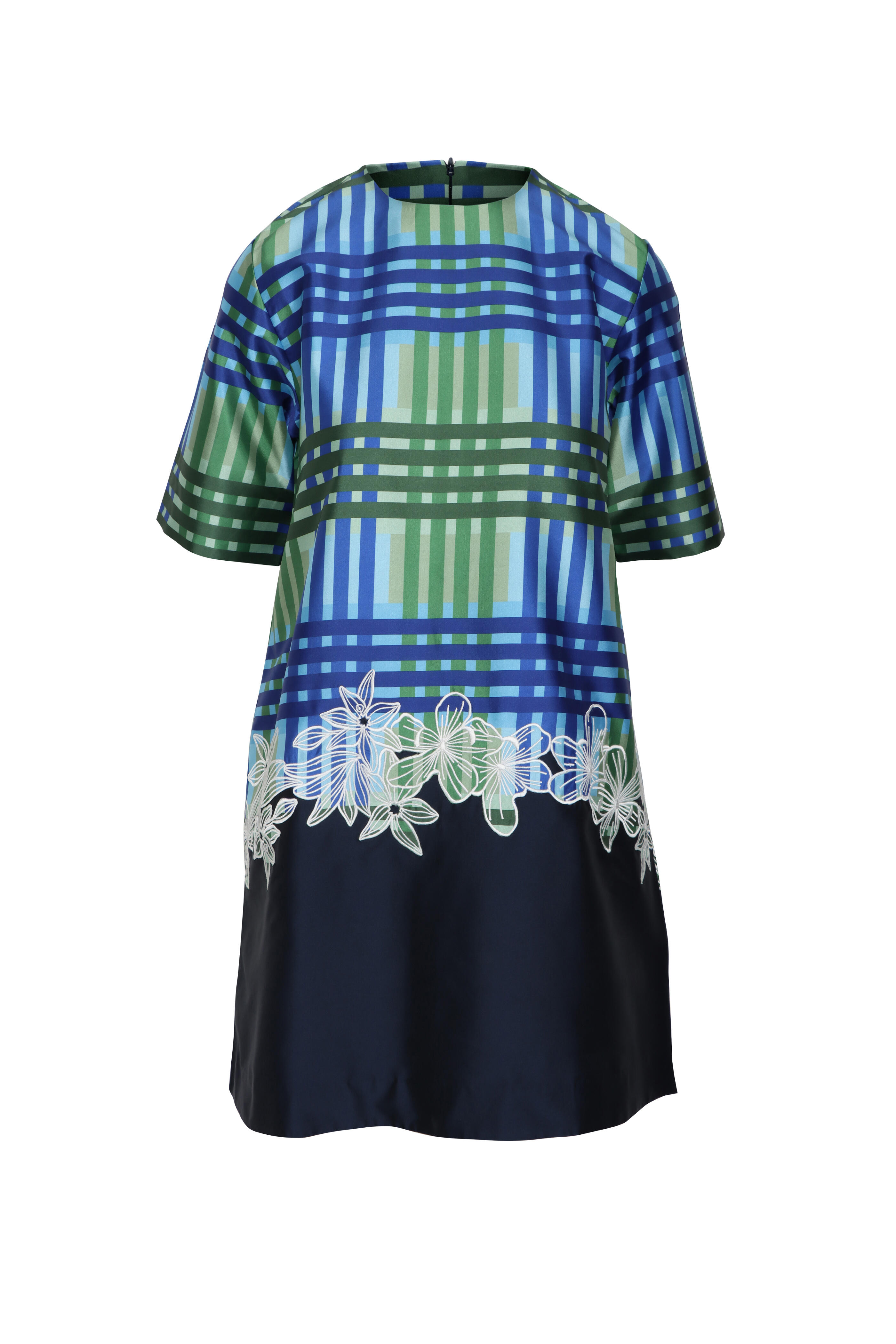 Round neck. Short sleeves. Concealed back zip closure. Side slip pockets. Aline silhouette. Imported. Mini length. 100% polyester outer, 100% viscose lining. Dry clean.
