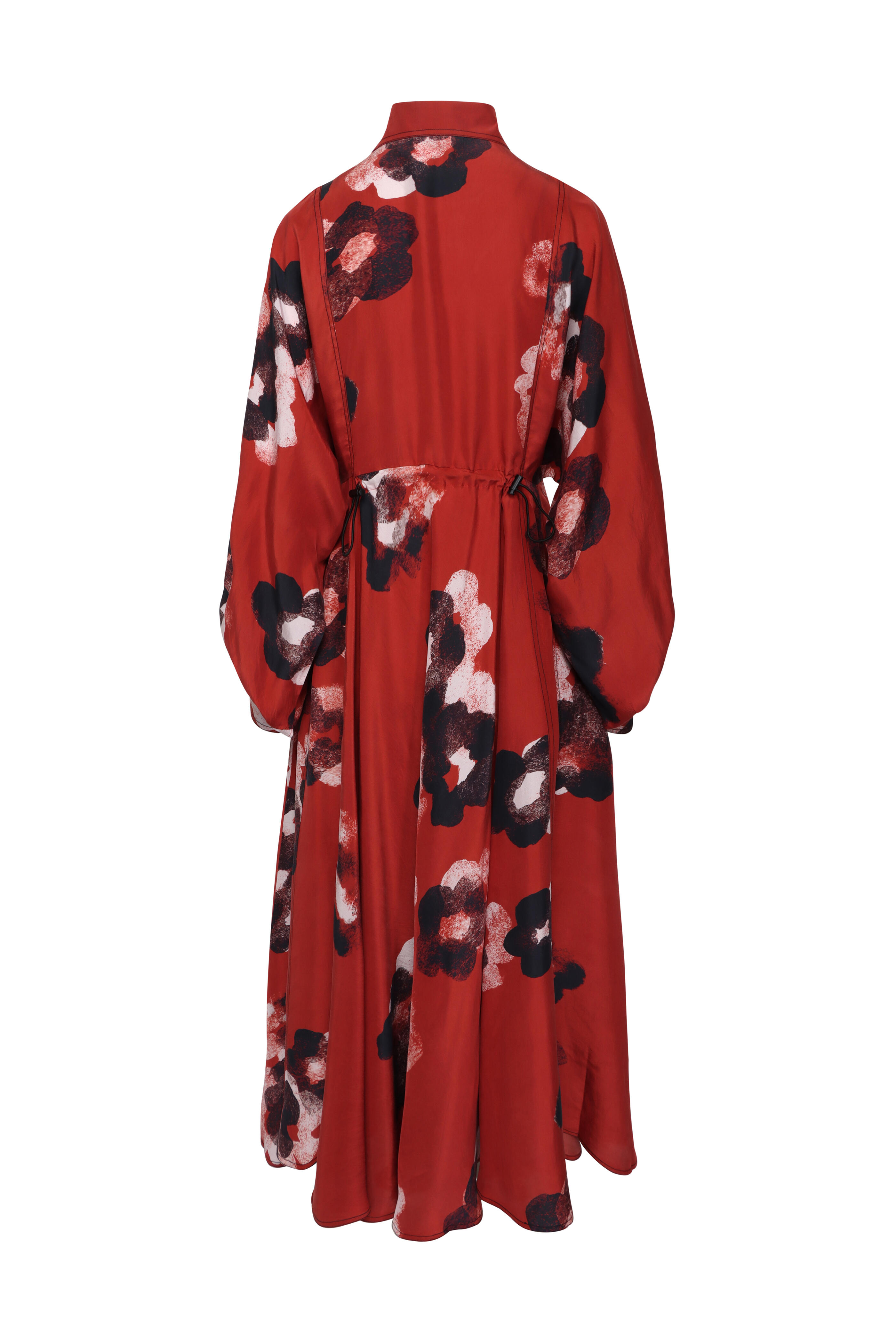 Collar. Long dolman sleeves; button cuffs. Quarter button placket. Elastic drawstring waist detail. Aline silhouette. Imported. Maxi length. 100% silk. Dry clean.