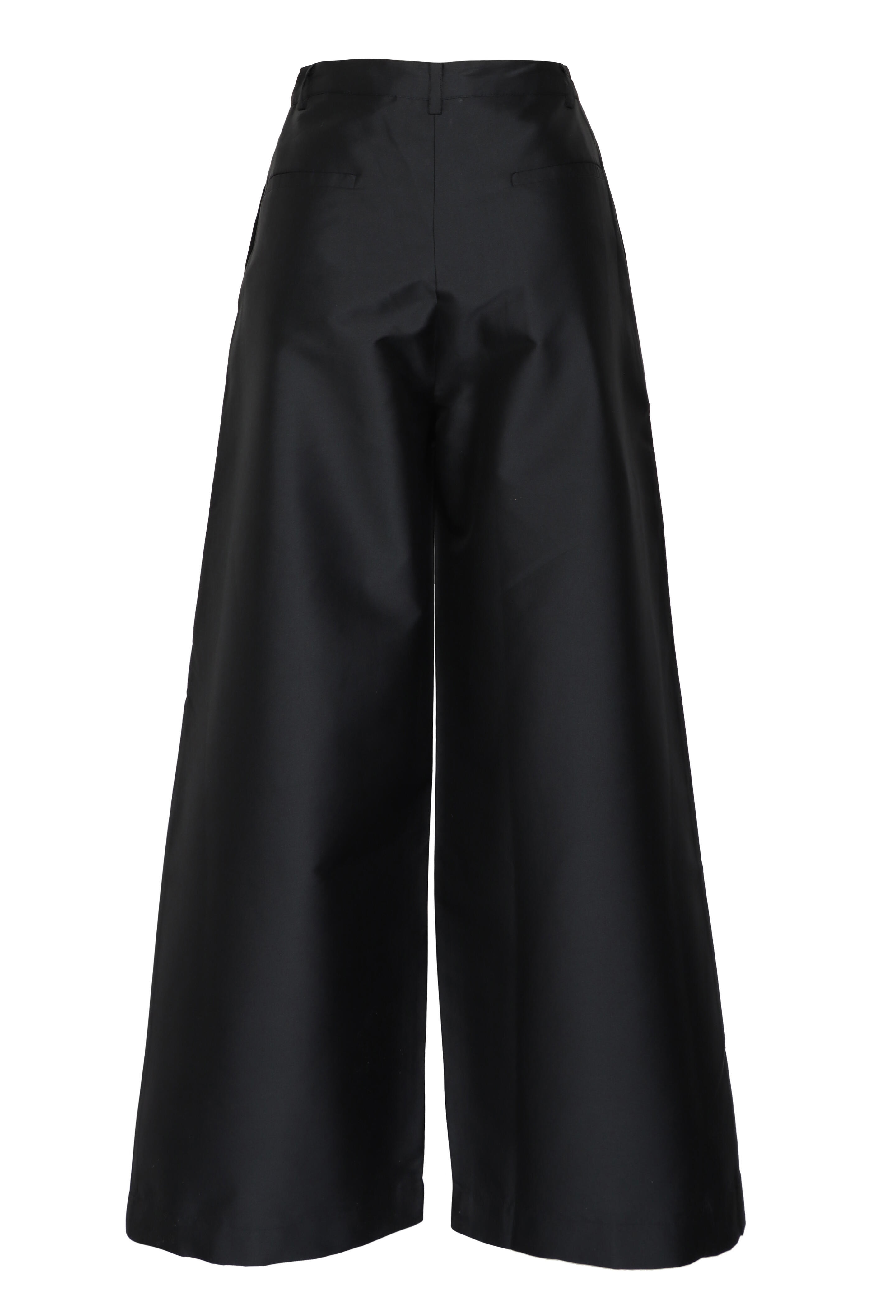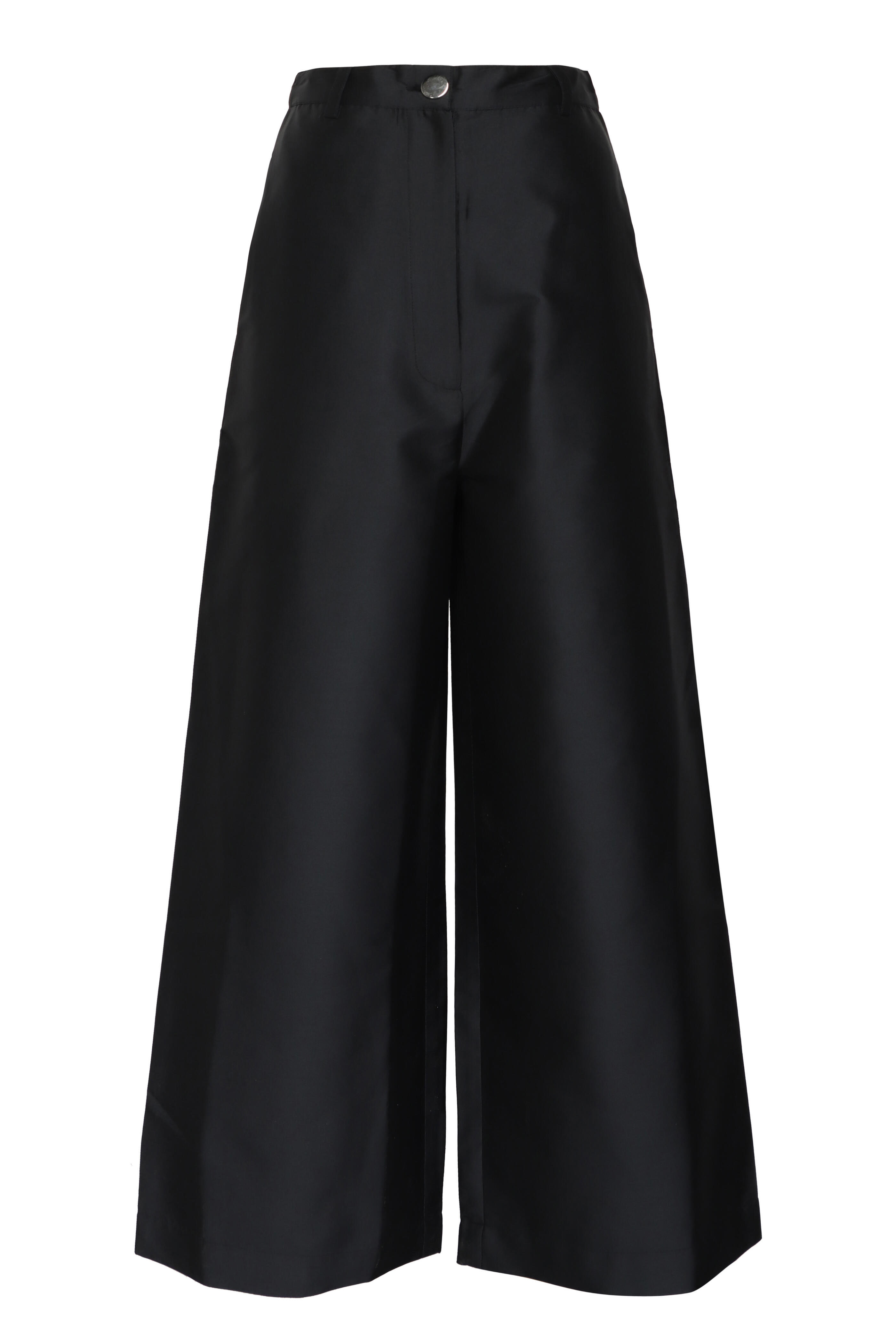High rise. Button closure. Zip fly. Belt loops. Side slip pockets. Back welt pockets. Wide through leg. Imported. Full length. 100% polyester. Dry clean.