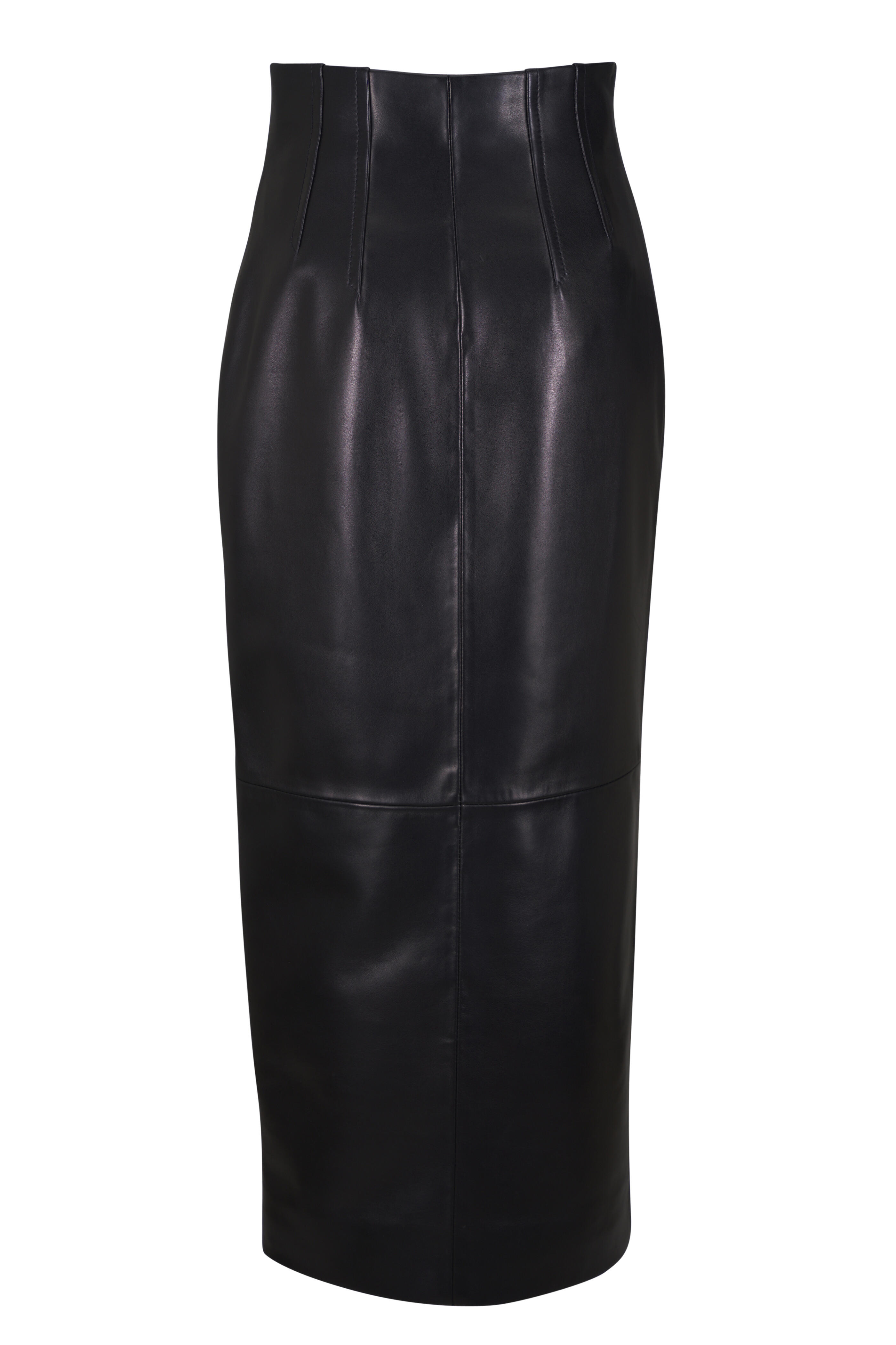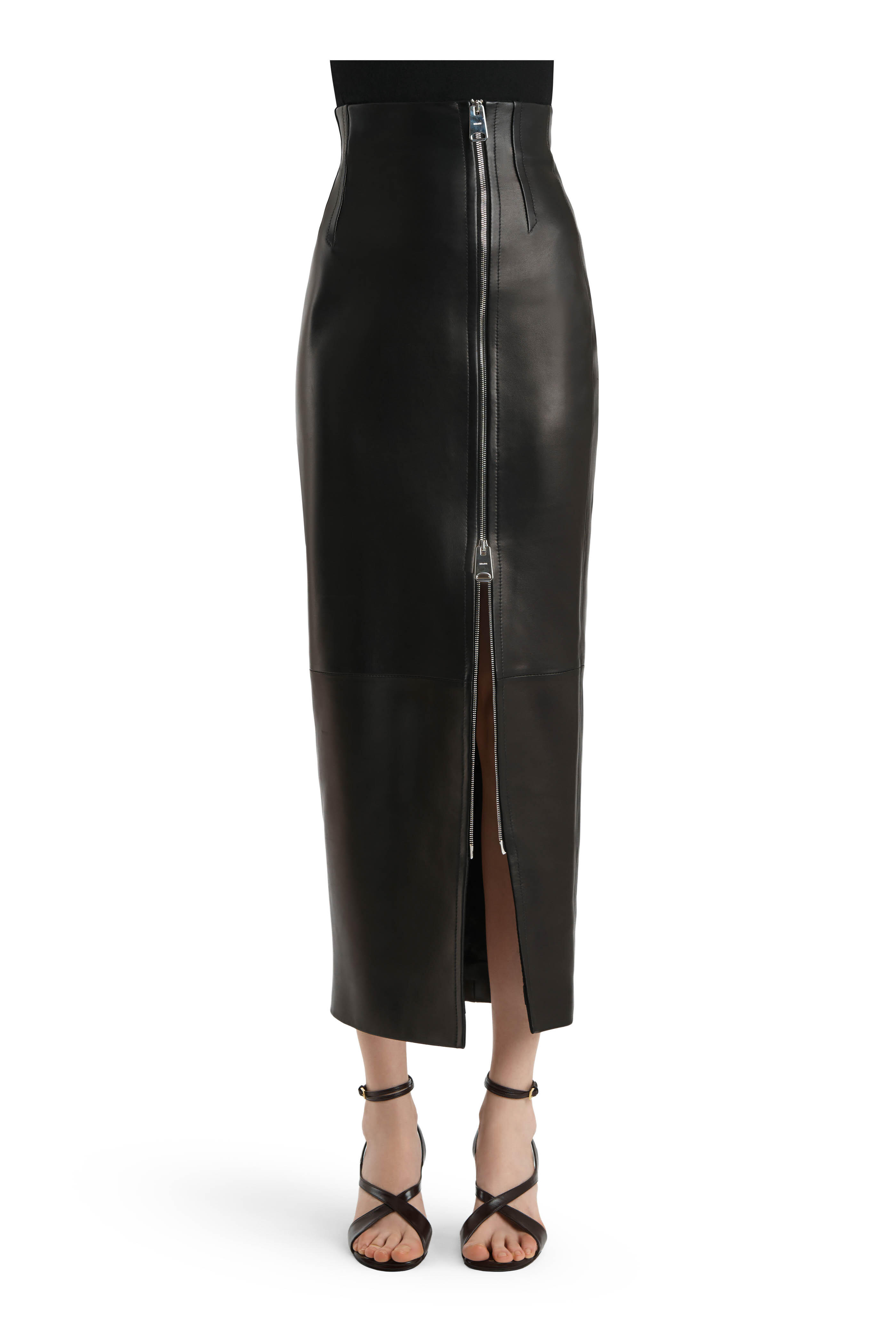 Lambskin leather. Specialist clean. Front two-way exposed zip. Adjustable slit. Lightweight. Imported. High-rise.