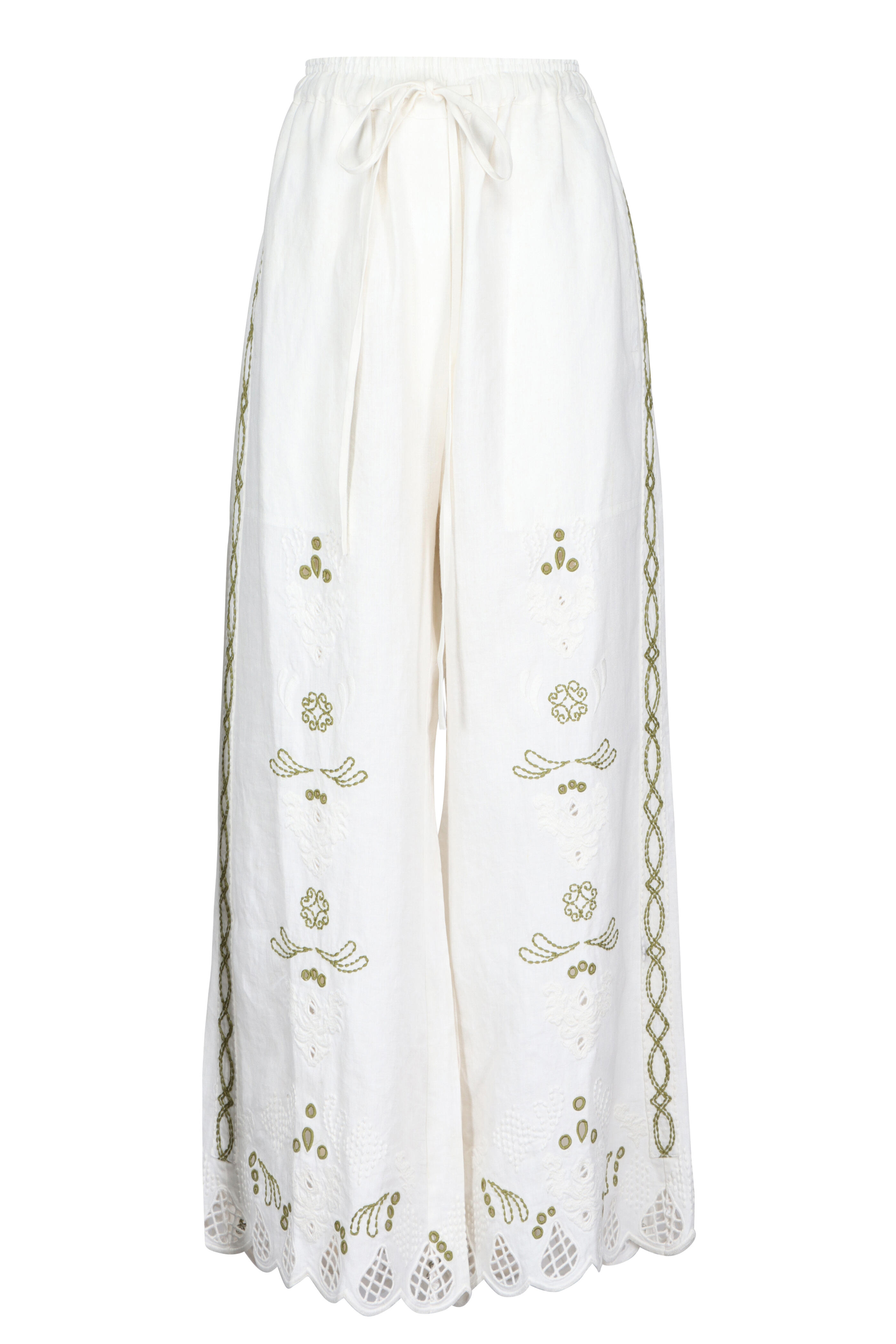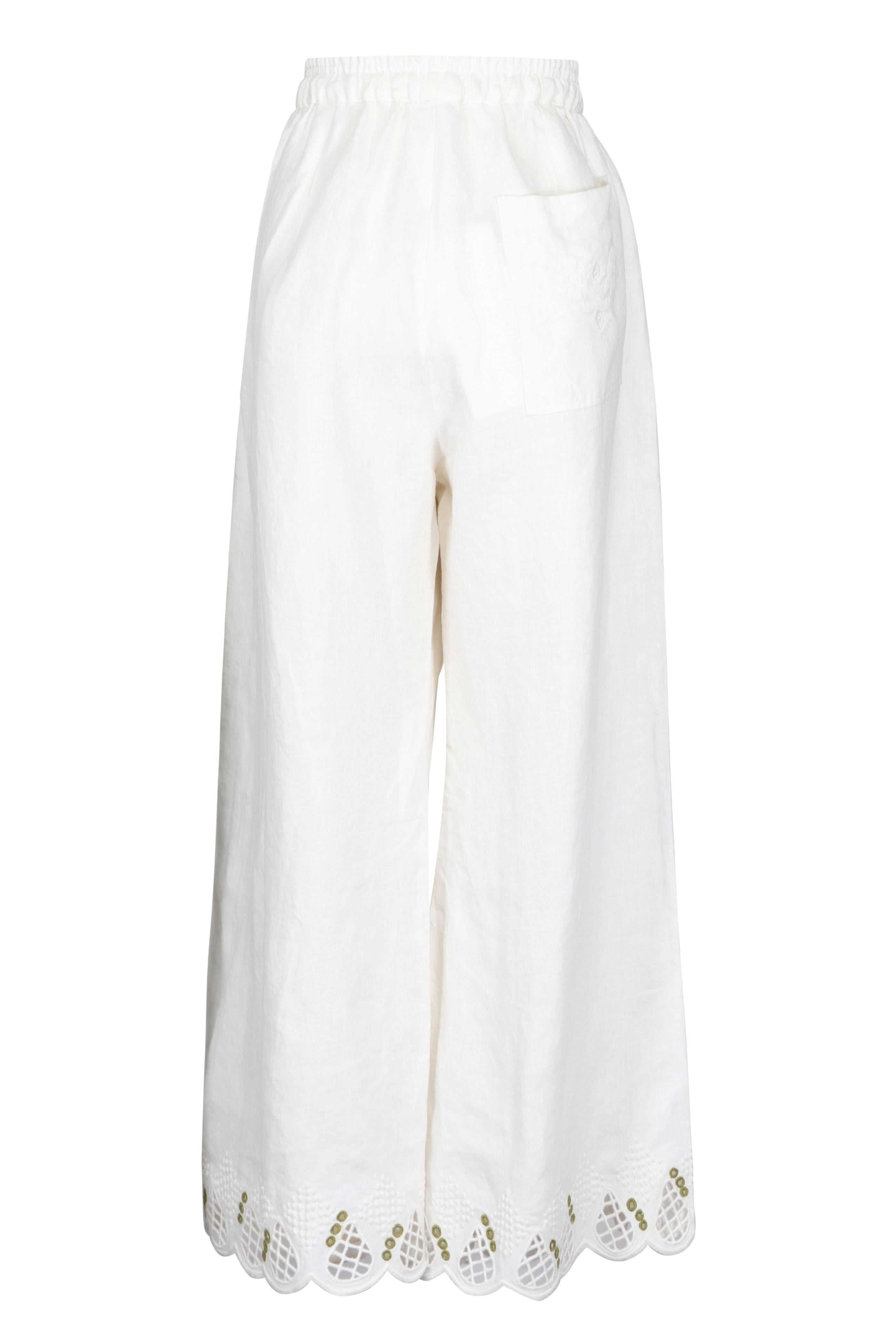 Elasticized waist. Drawstring closure. Side slip pockets. Right rear patch pocket. Imported. 100% linen. Dry clean.