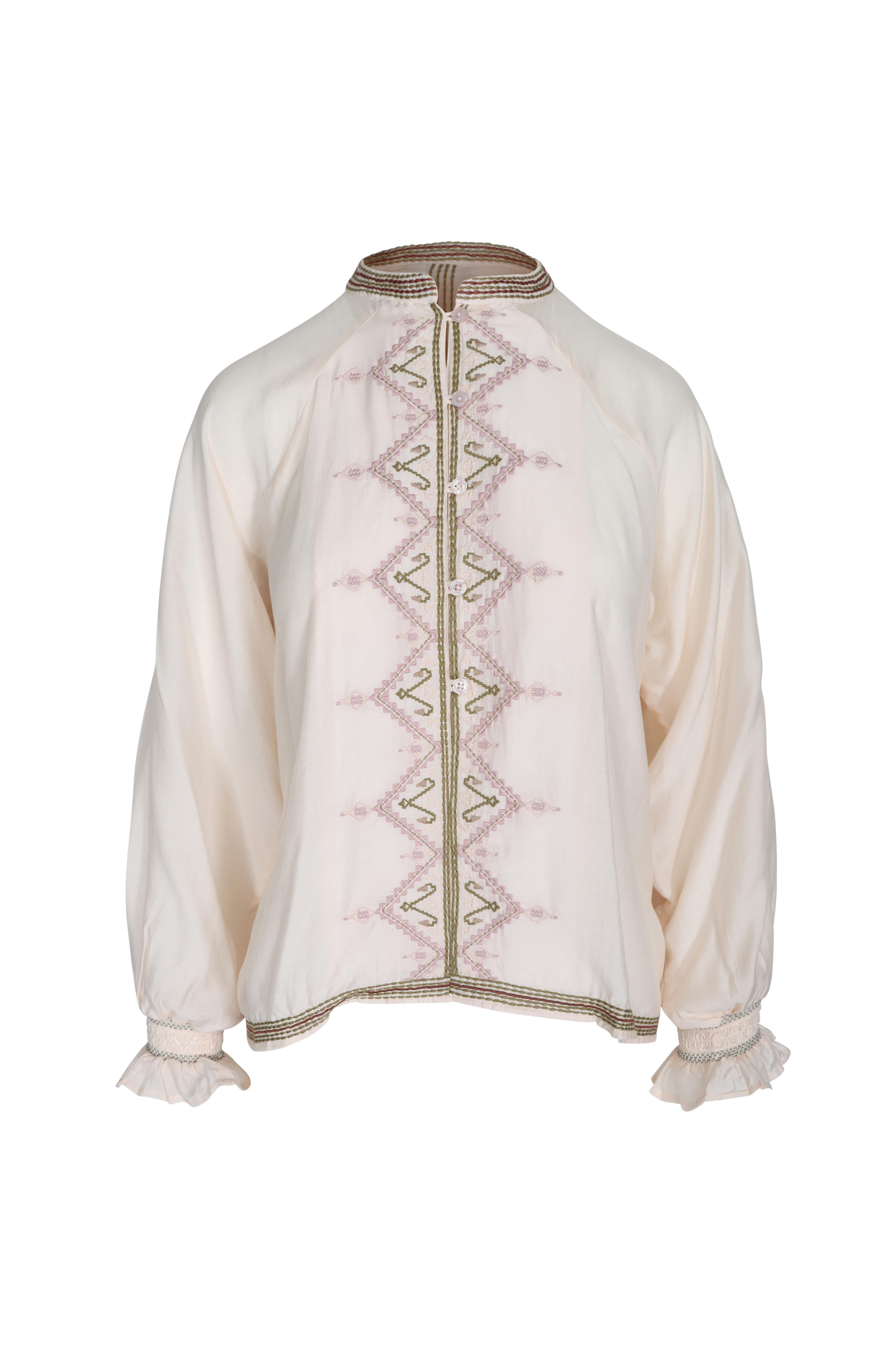 - Long raglan sleeves; smocked cuffs