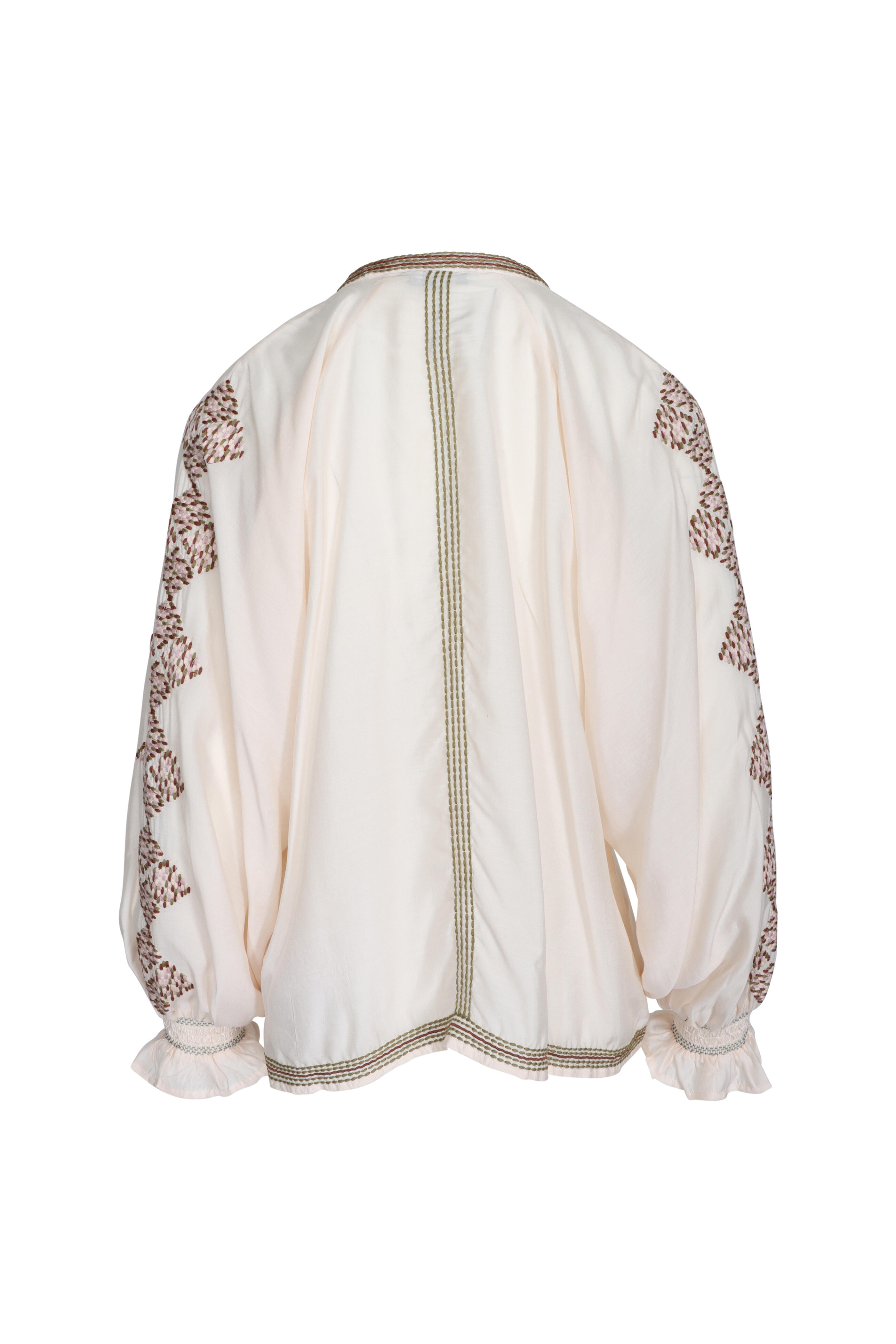 Round neck. Long raglan sleeves; smocked cuffs. Hook and eye button closure. Relaxed fit. Imported. 100% cupro. Dry clean.