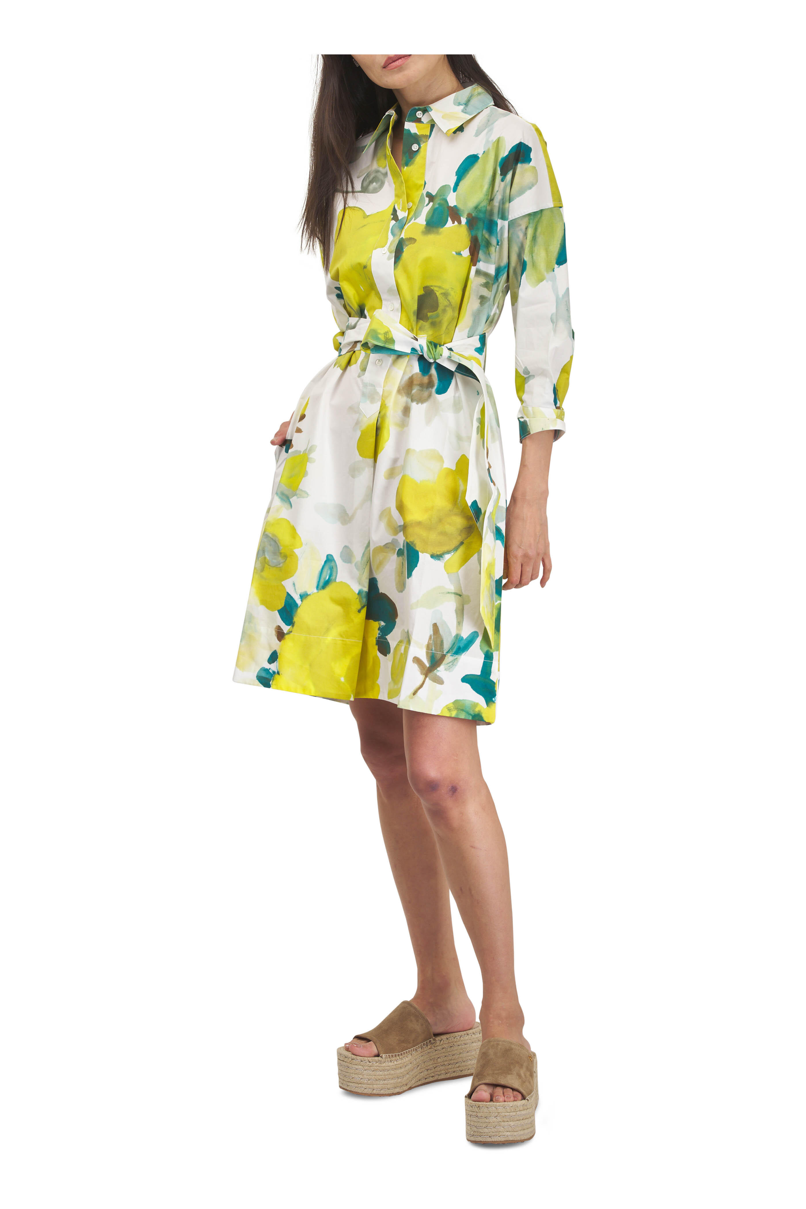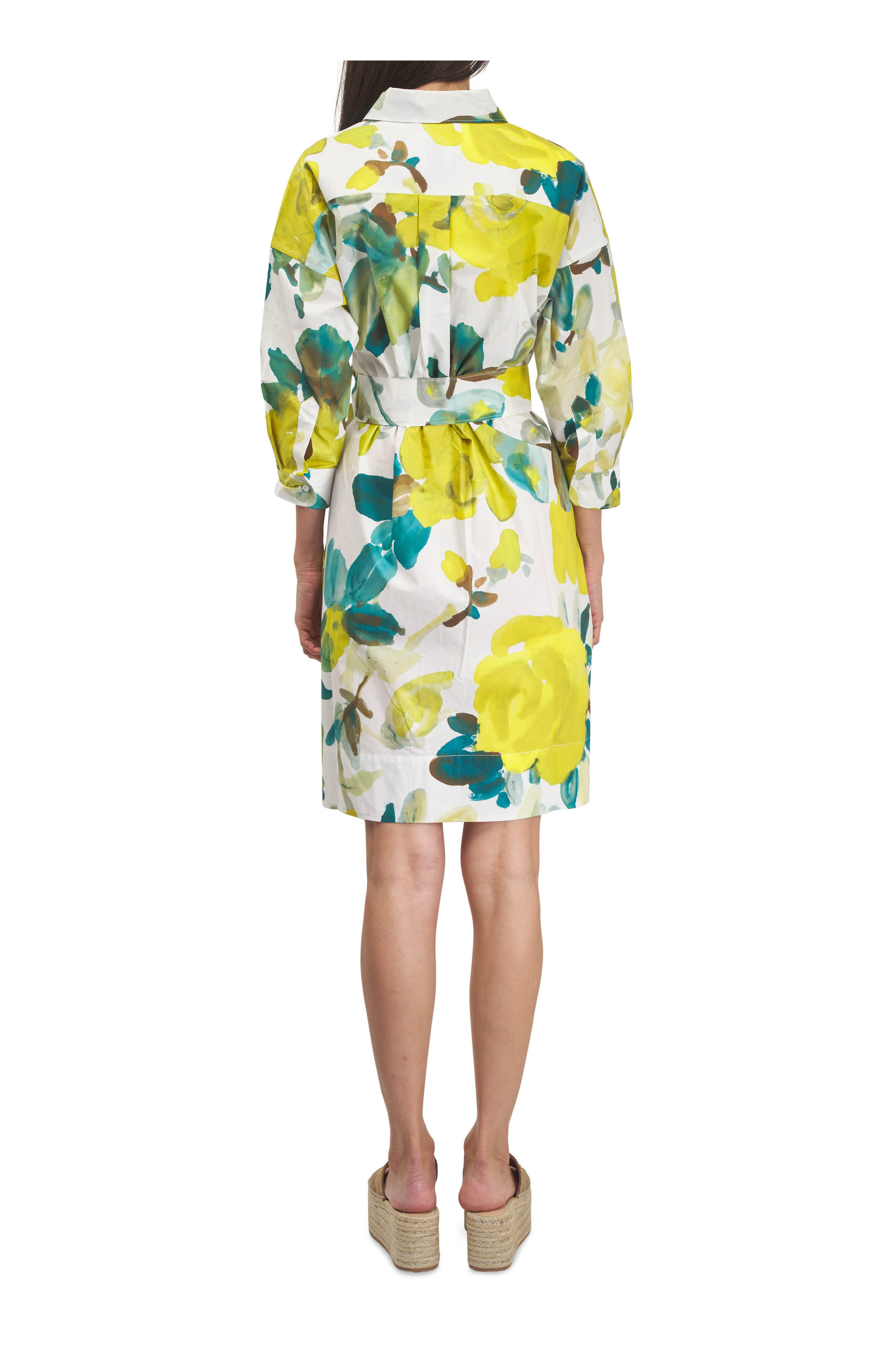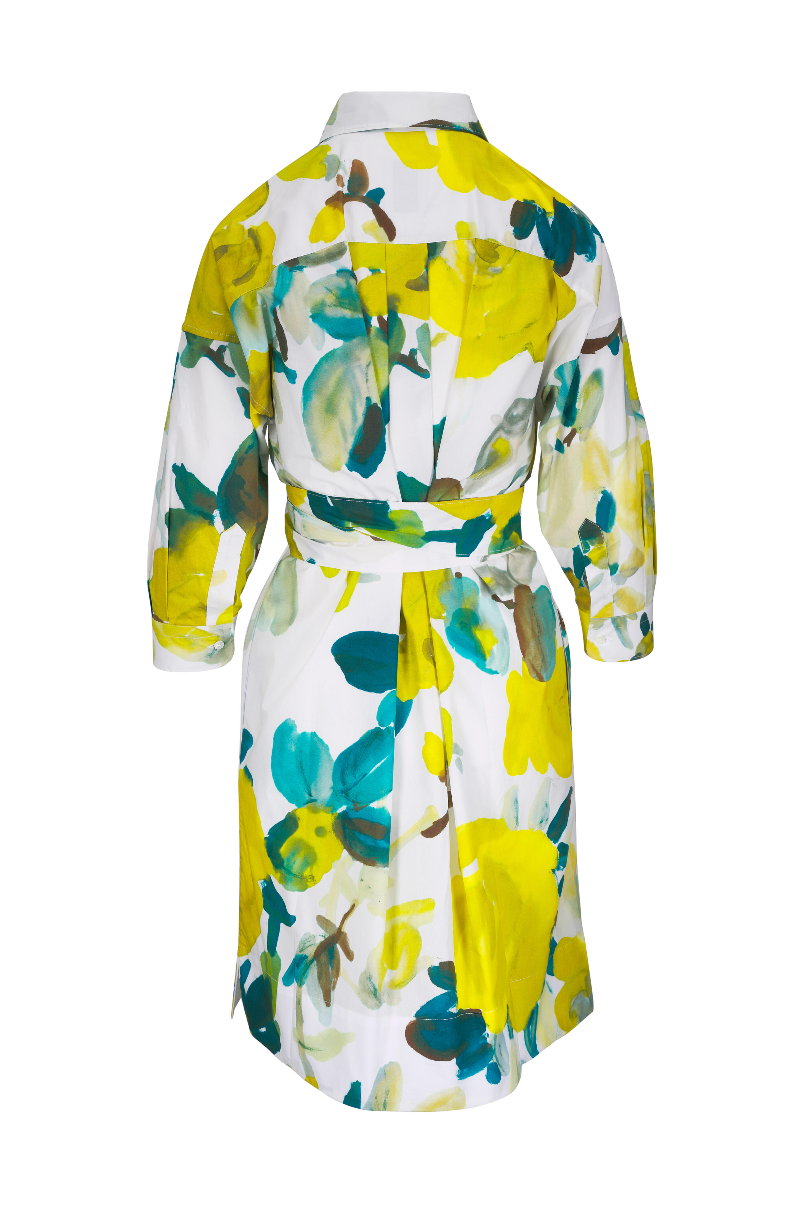 Spread collar. Partial front button placket. Removable self-tie fabric belt. Side slip pockets. Three-quarter length sleeves. Single button barrel cuffs. Vented hem. Made in Italy. Approximately 39" shoulder to hem (measurements taken from size 4). 100% cotton. Dry clean.