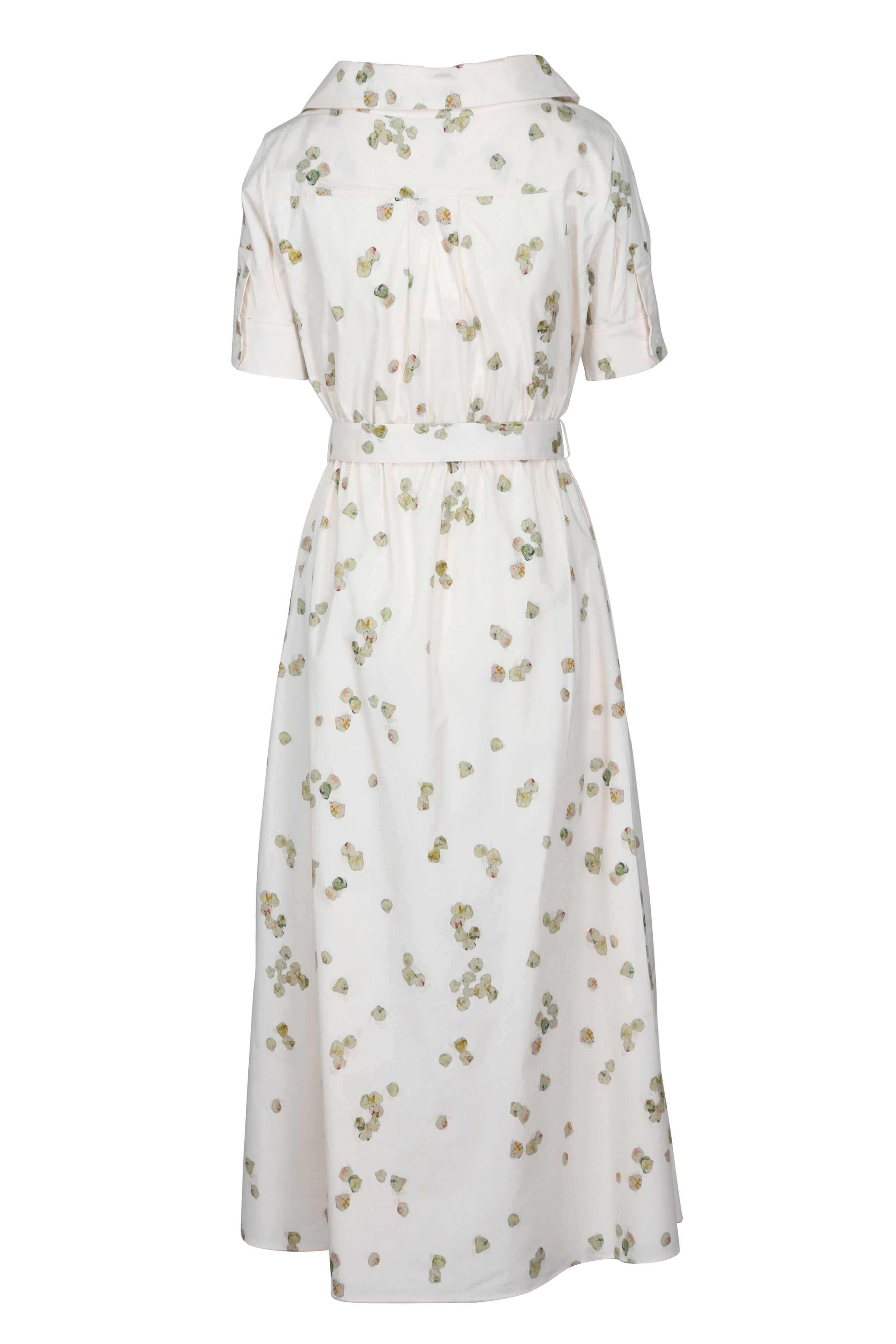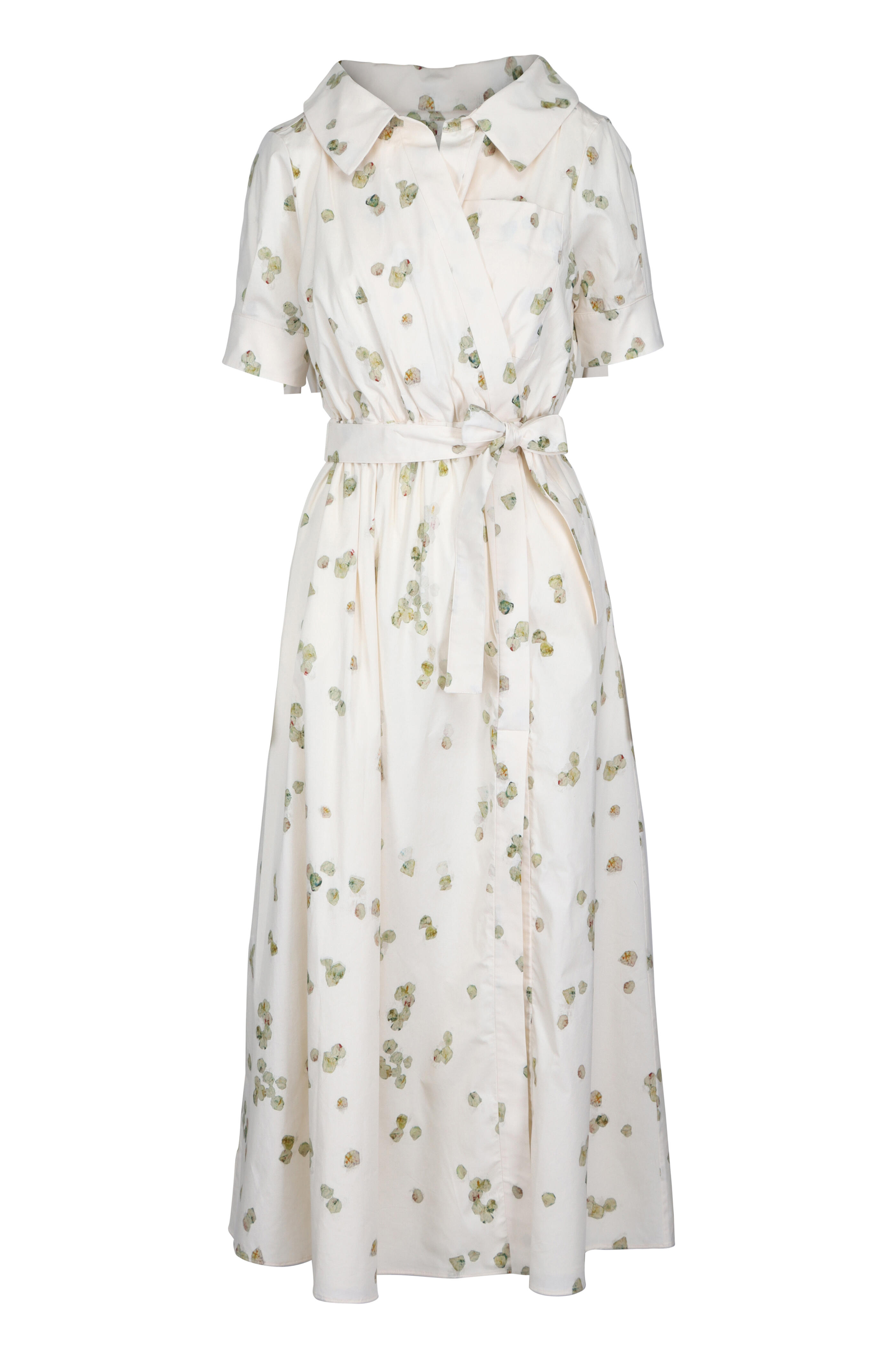 Surplice V-neck; spread collar. Short sleeves. Removable tie belt. Imported. 97% cotton, 3% spandex. Dry clean.