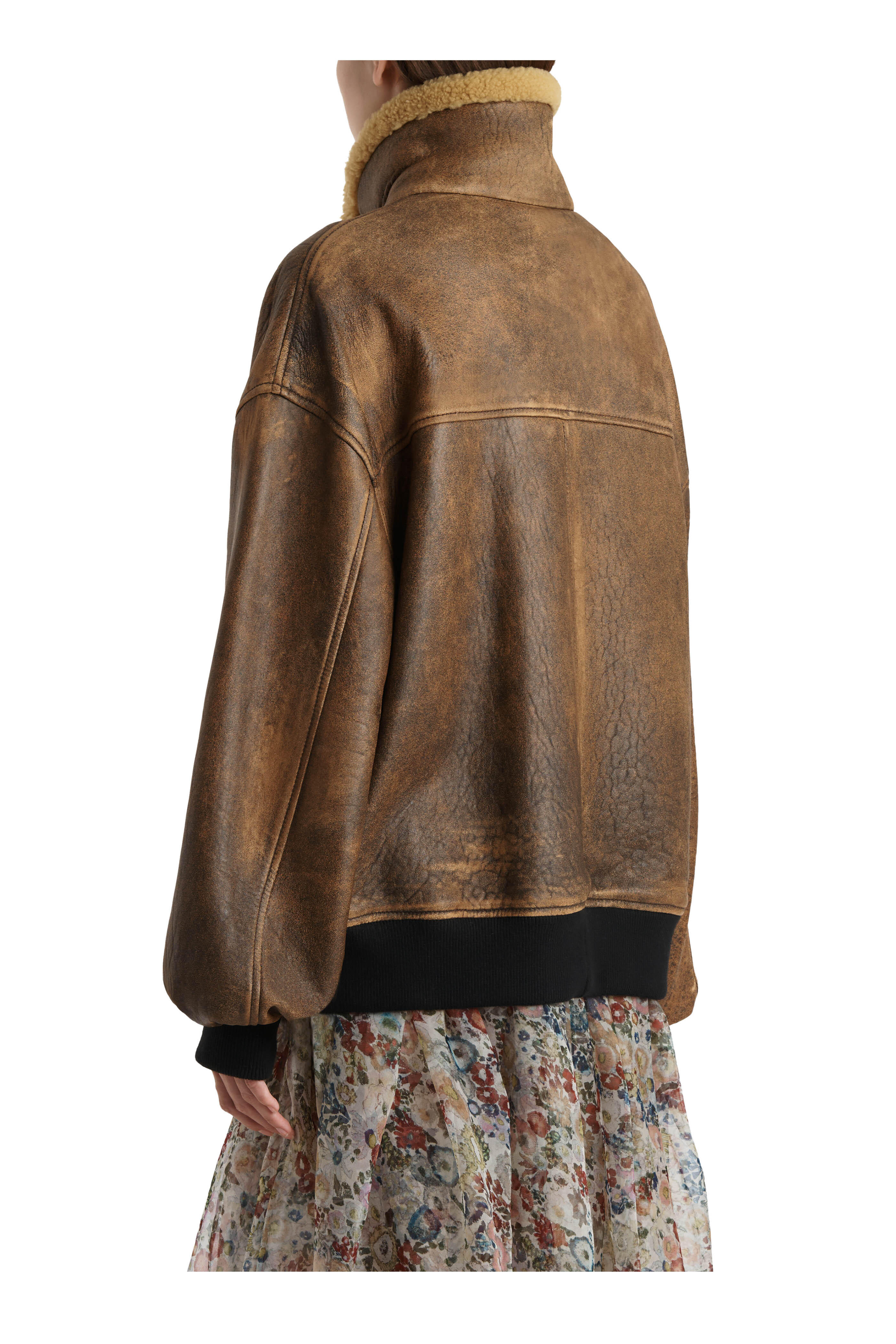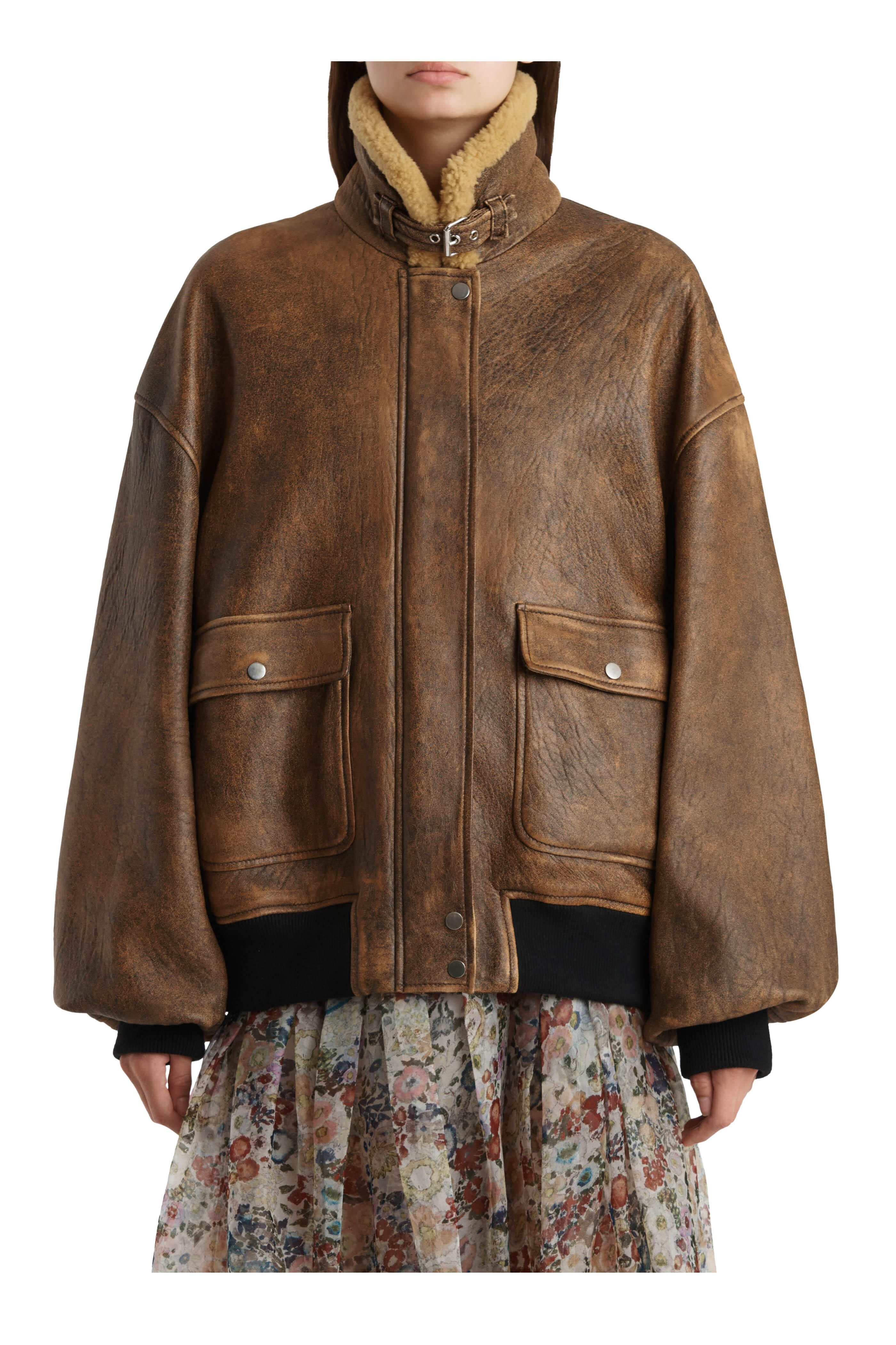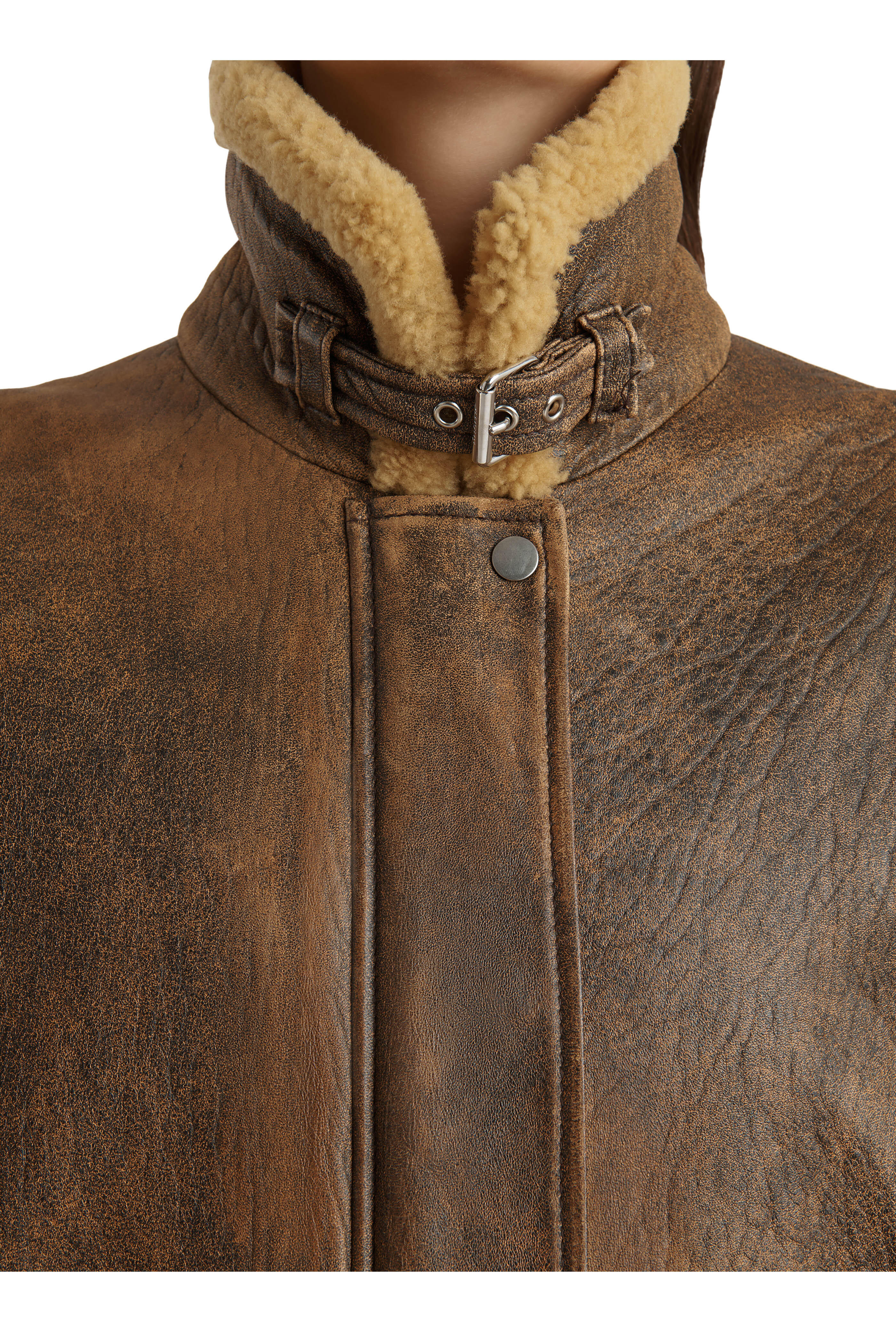 Lambskin leather. Specialist clean. Spread collar; buckle closure at throat. Concealed zip closure; snap placket. Lower snap flap pockets. Ribbed knit insets at cuffs and hem. Lined in silky cupro twill. Imported.