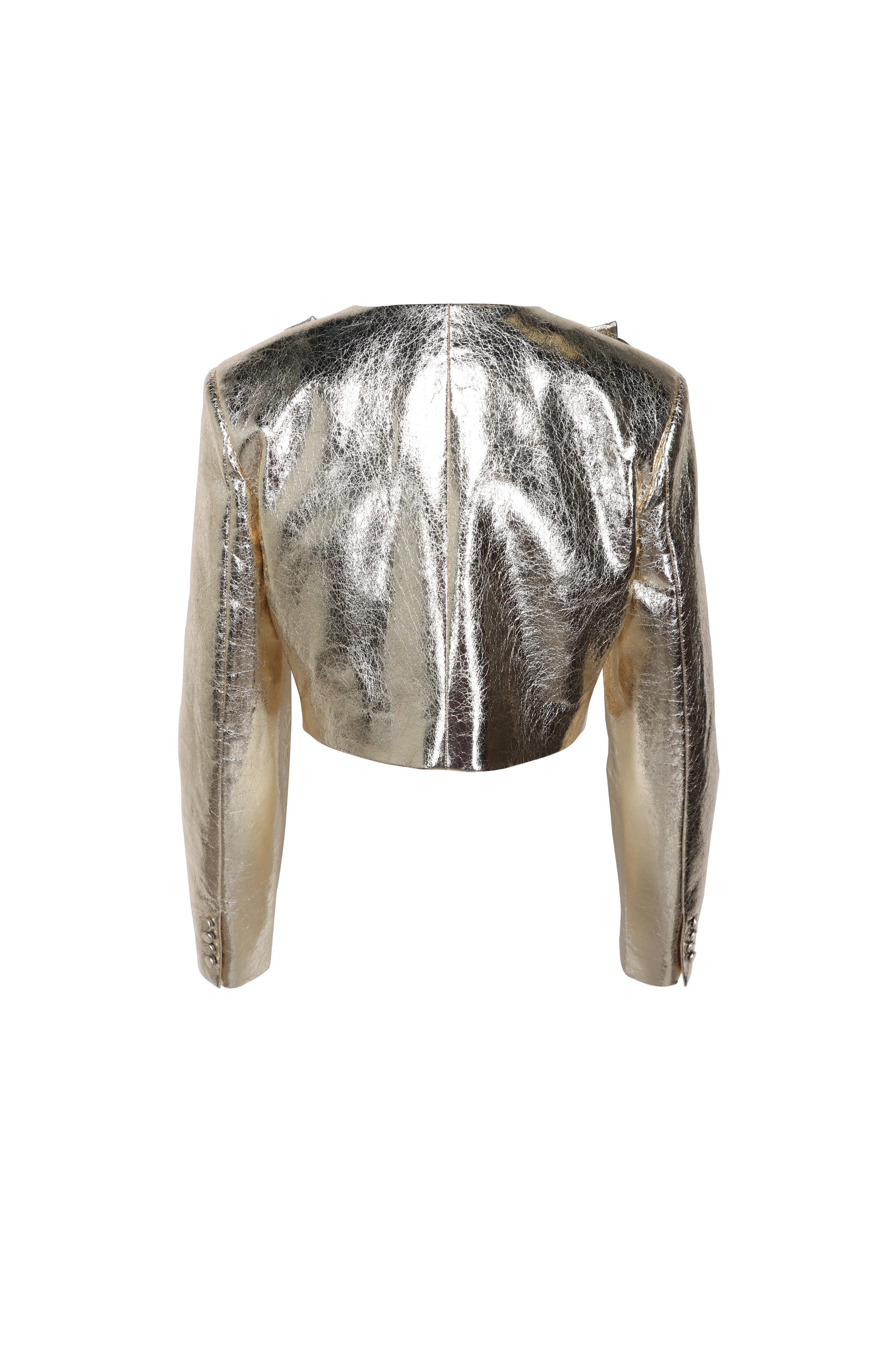 Round neck. Long sleeves. Front button closure; self-cover buttons. Boxy fit. Rosette detail; self-fabrication. Imported. Bust 33.5” (US 4). Waist 25” (US 4). Cropped length. 100% polyester outer and lining. Dry clean.