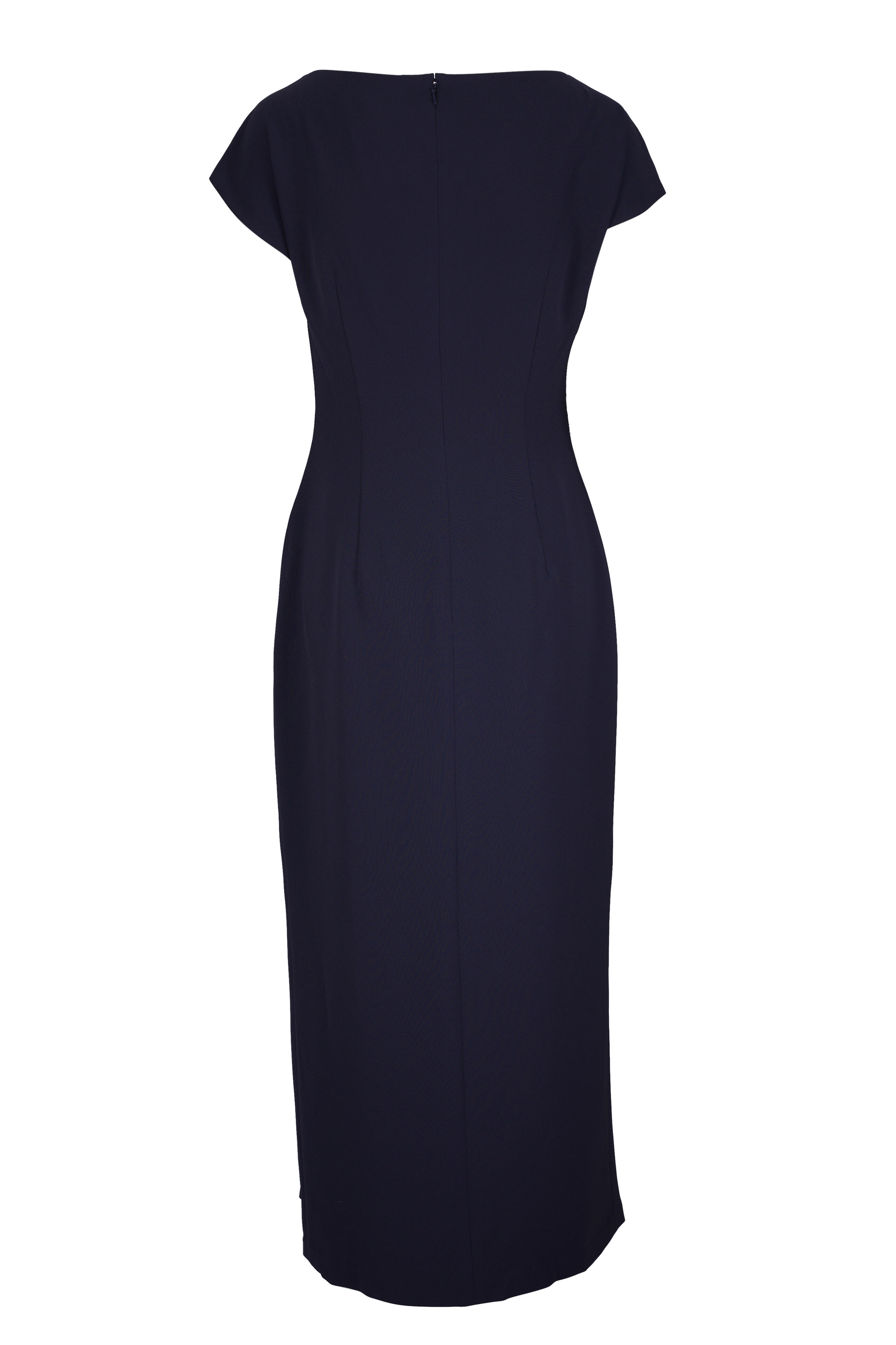 Spot clean. Bateau neckline. Concealed back zip. Side ruching. Imported. 52" shoulder to hem. 92% polyester, 8% elastane; lined.