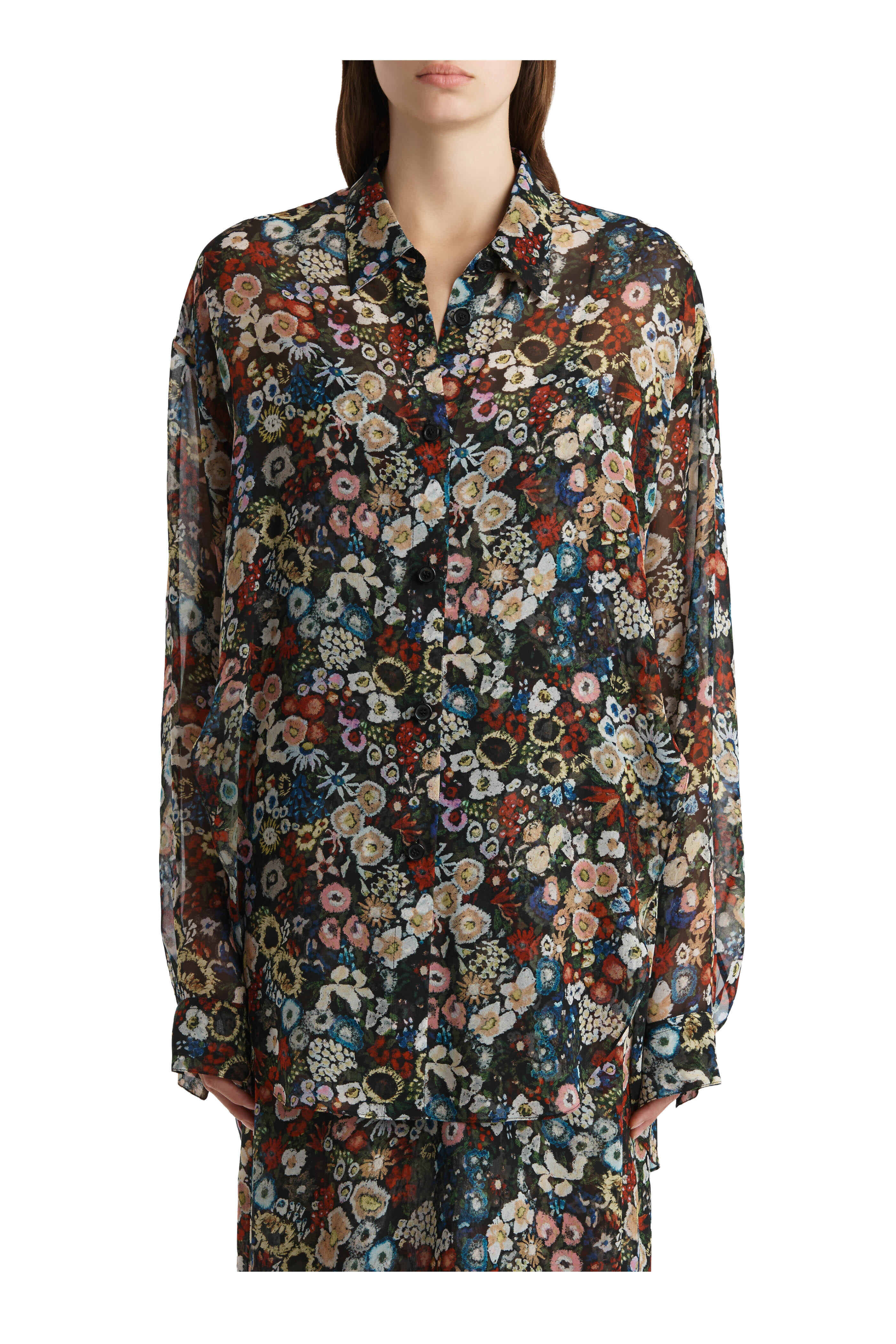 Spread collar. Front button placket. Single button square cuffs. Shirttail hem. Imported. 100% silk. Dry clean.