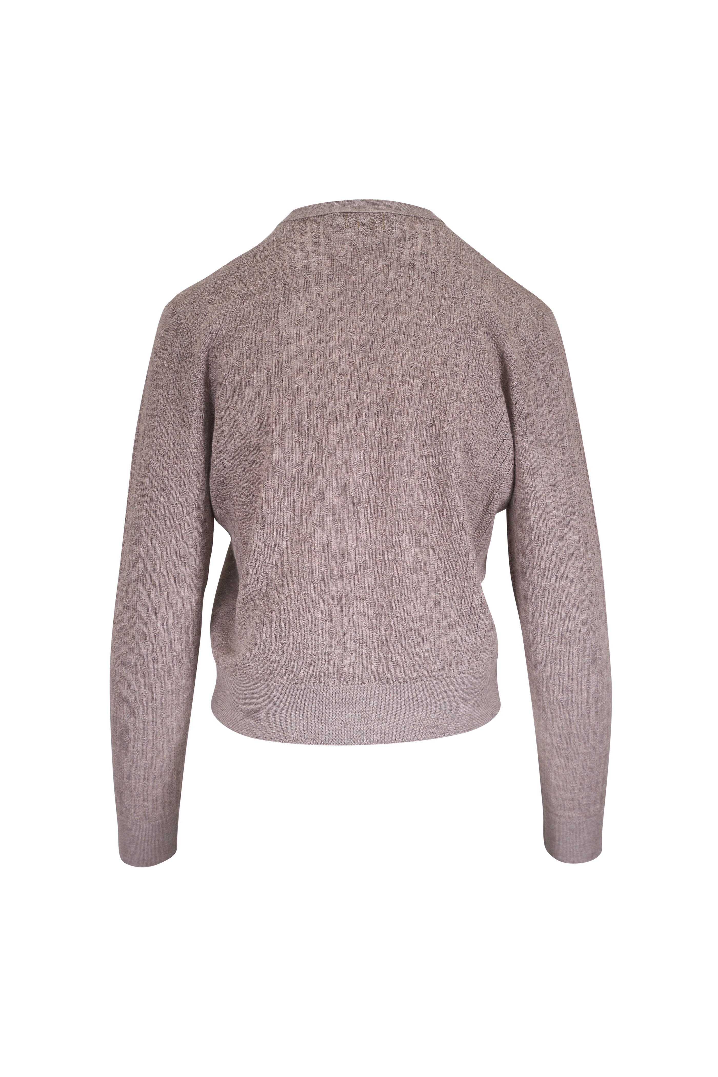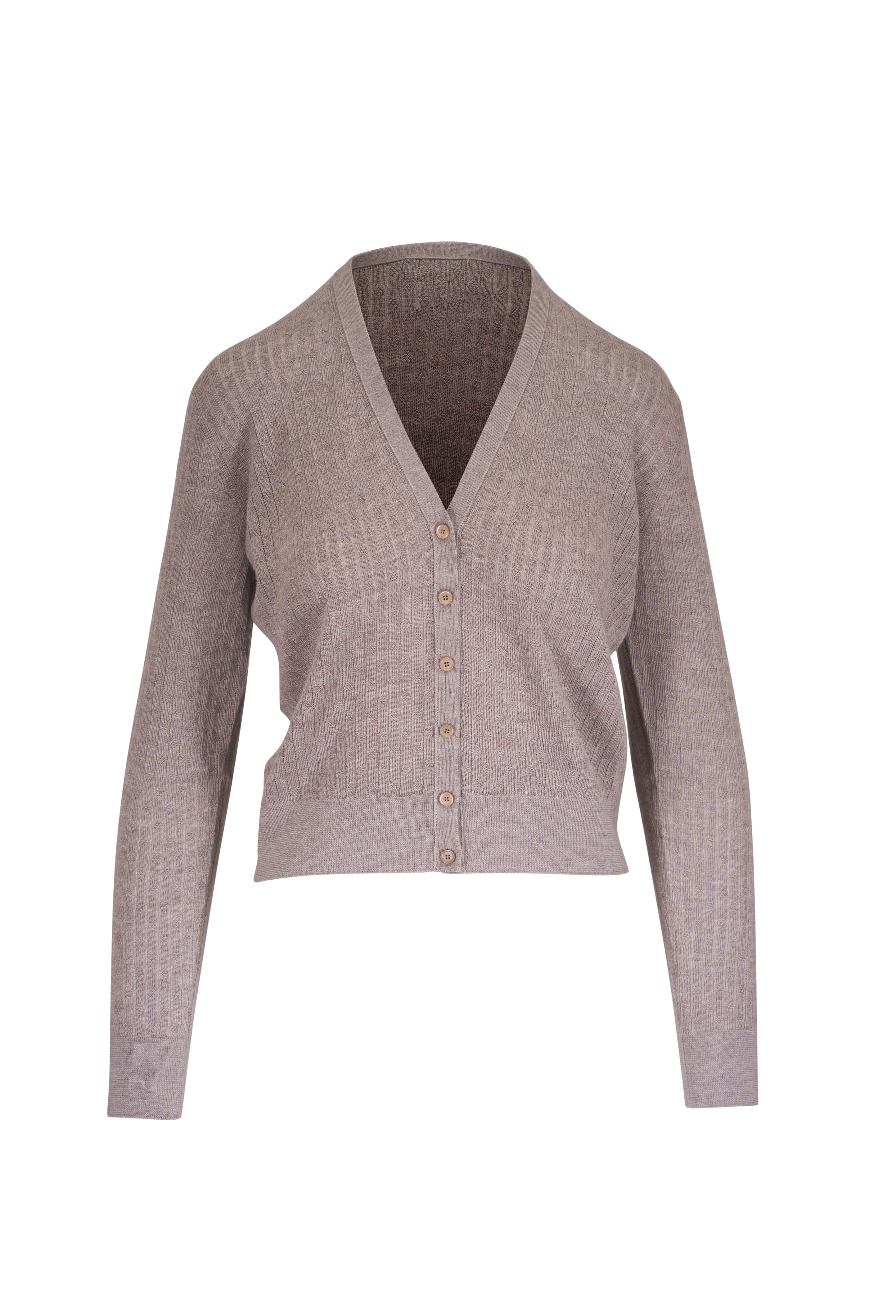 V-neckline. Front button placket. Ribbed trims. Made in Italy. 70% cashmere, 30% silk. Hand wash.