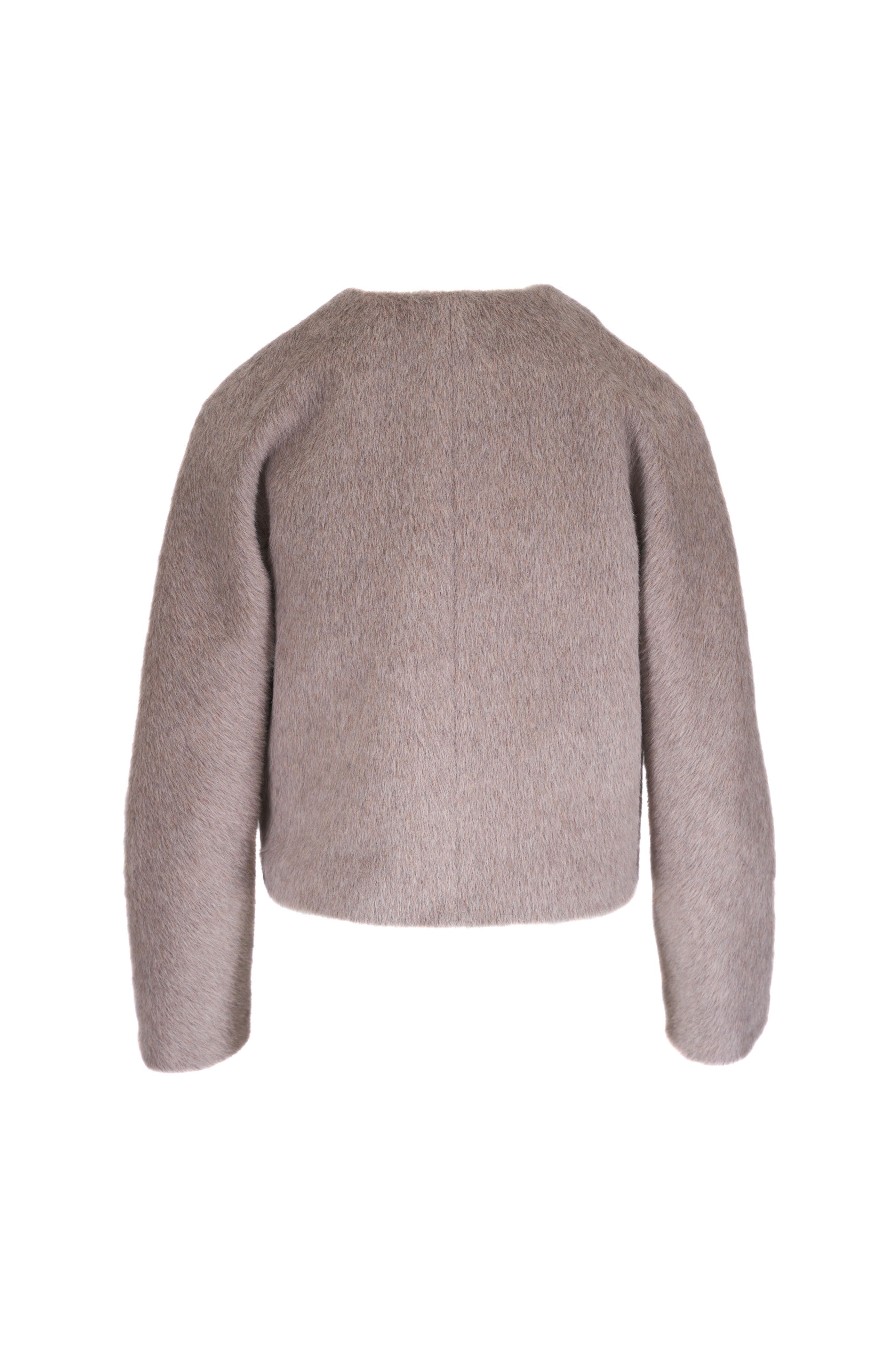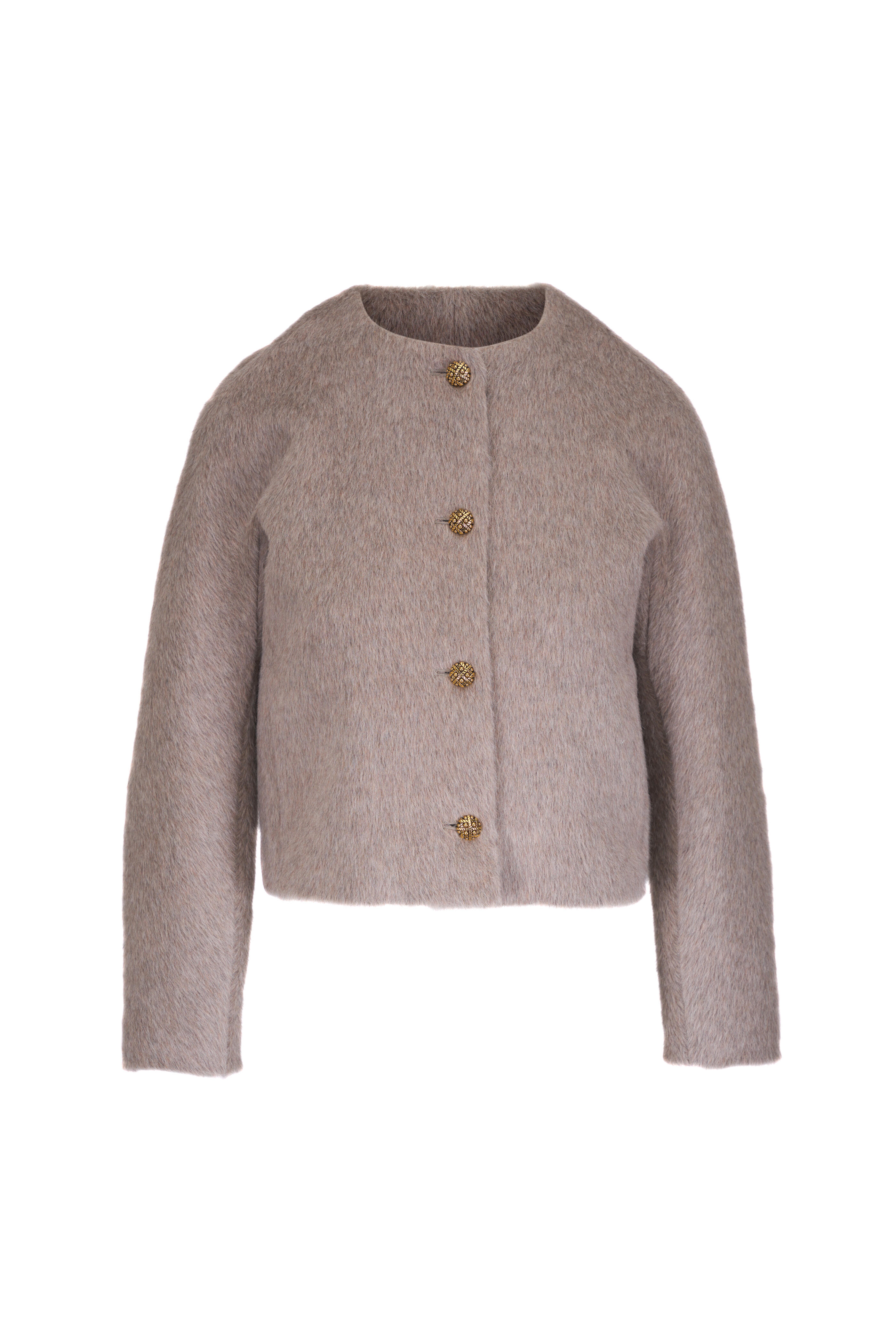 Jewel neckline. Front button placket. Lower welt pockets. Made in Italy. Lotus Pod (D0SR). Cropped. 75% alpaca, 25% virgin wool; lining: 100% silk. Dry clean.