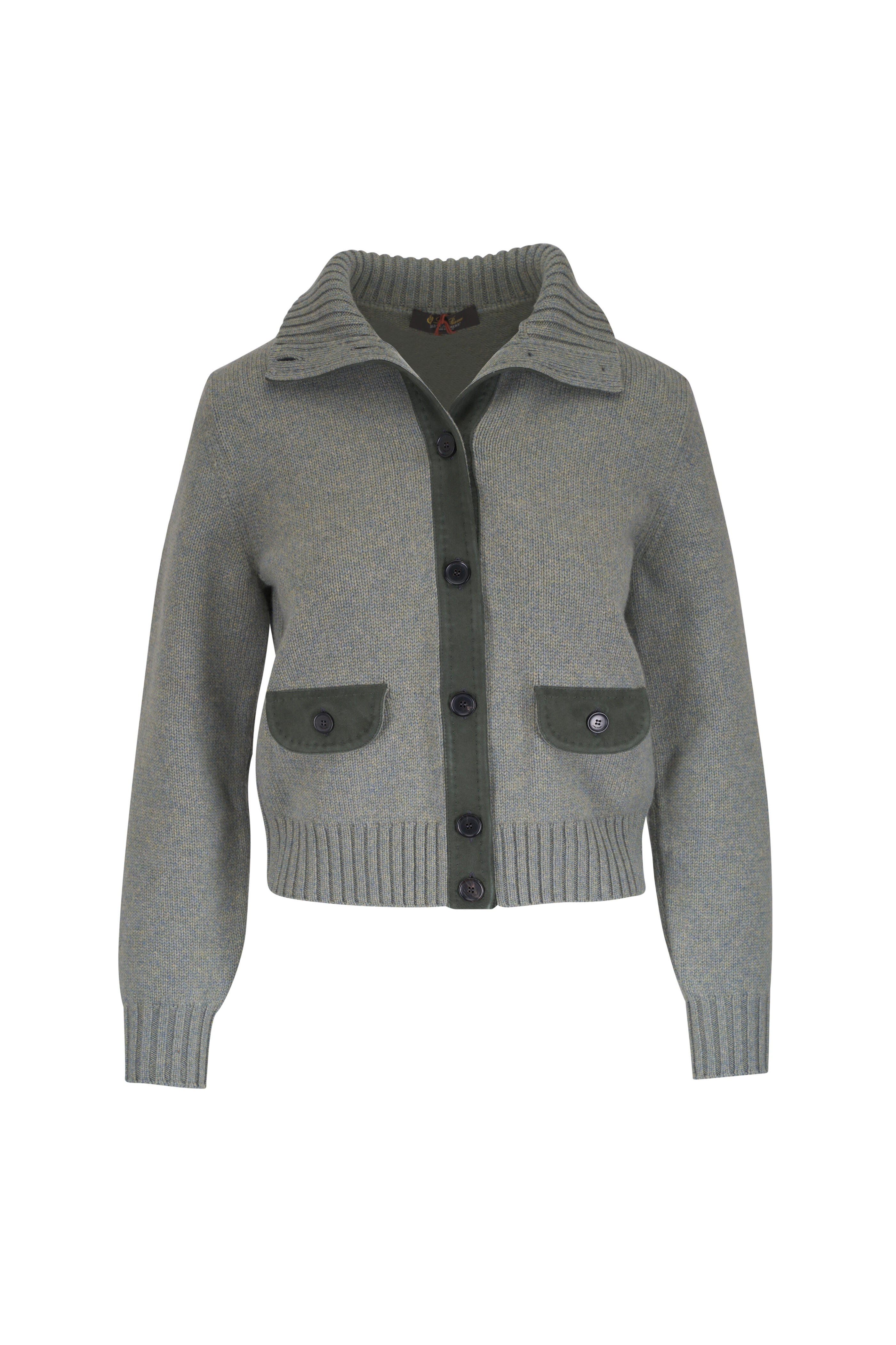 Specialist clean. Ribbed collar. Front button placket. Lower flap pockets. Ribbed trims. Made in Italy. 100% baby cashmere; suede trim.