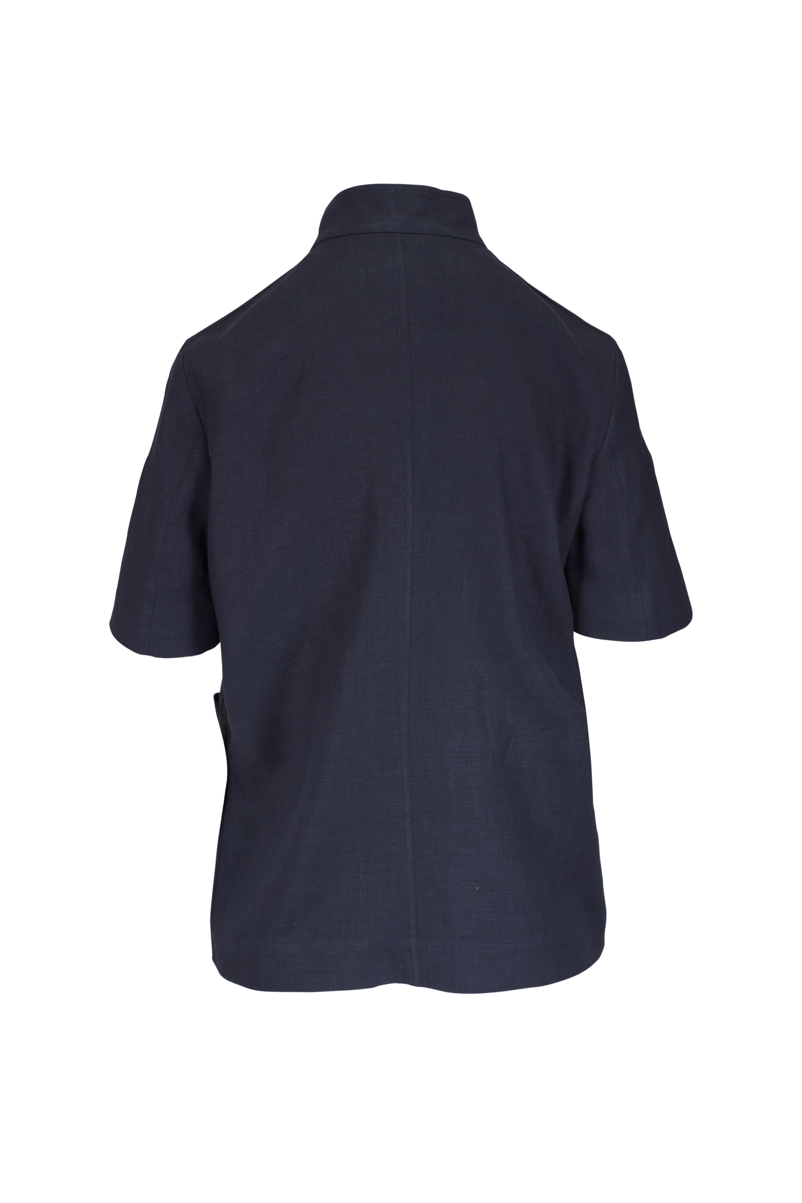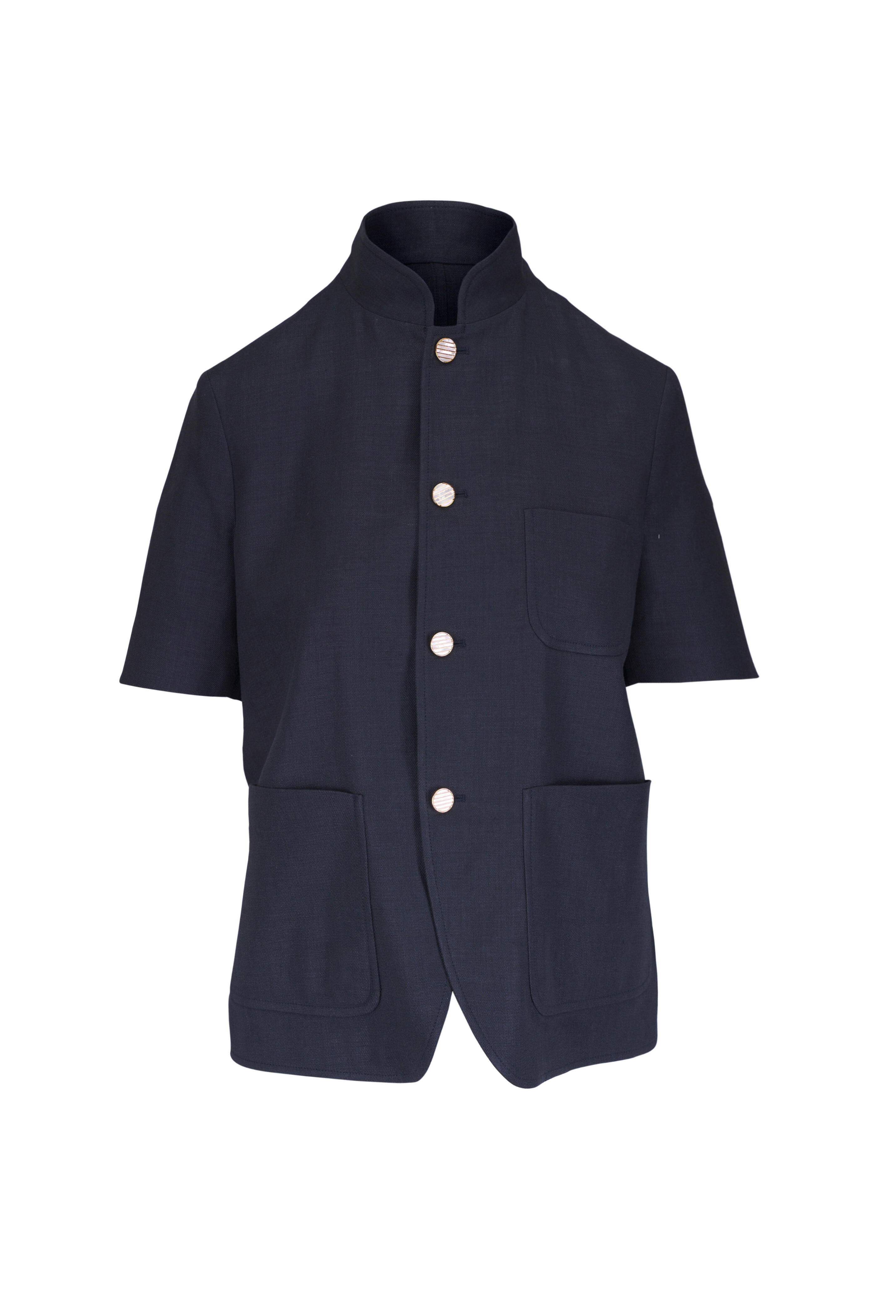 Mandarin collar. Front button placket; metal button fastening with mother of pearl inlays. Lower patch pockets; chest patch pocket. Made in Italy. Approximately 24" shoulder to hem (measurements taken from size 6). 70% linen, 30% virgin wool. Dry clean.